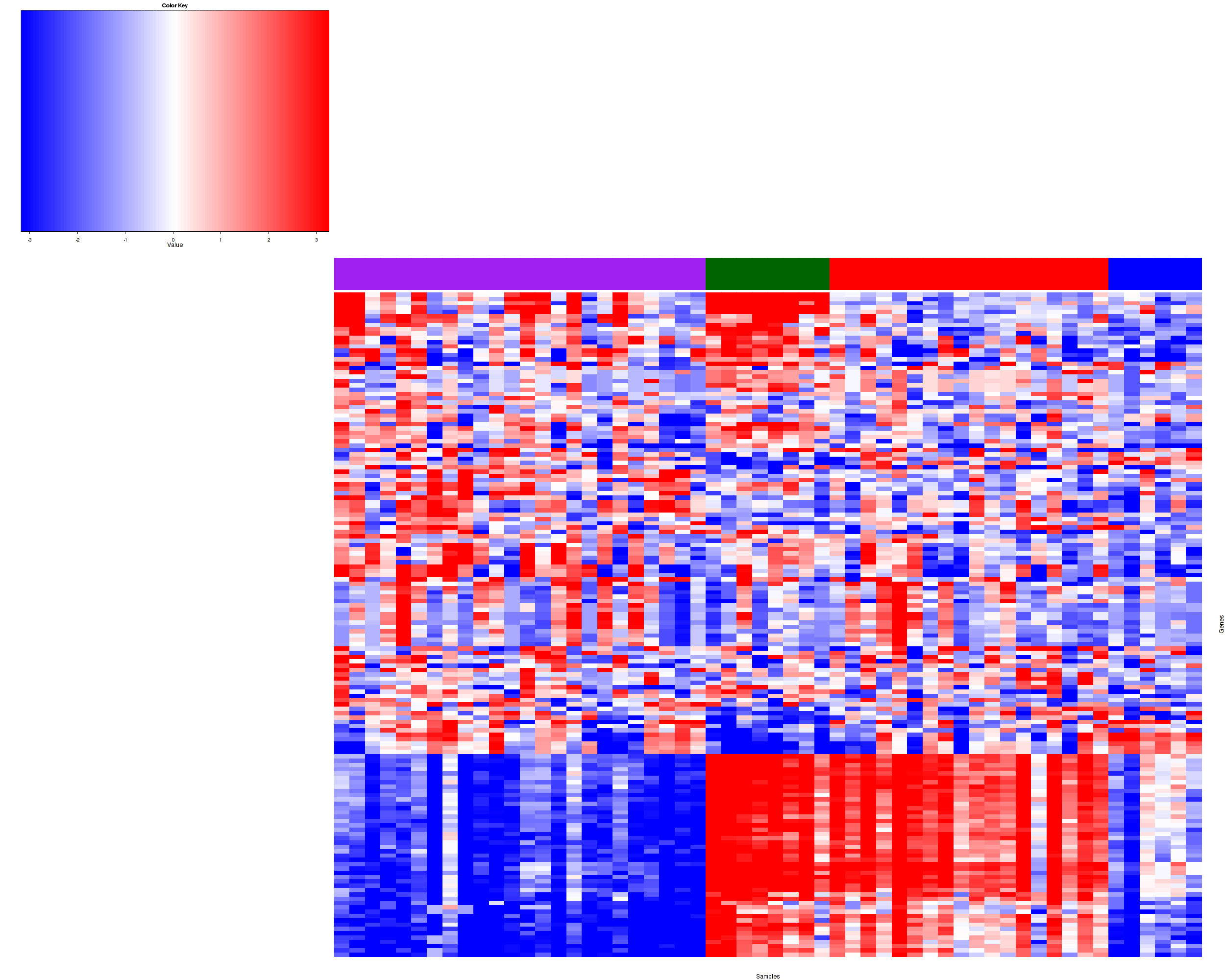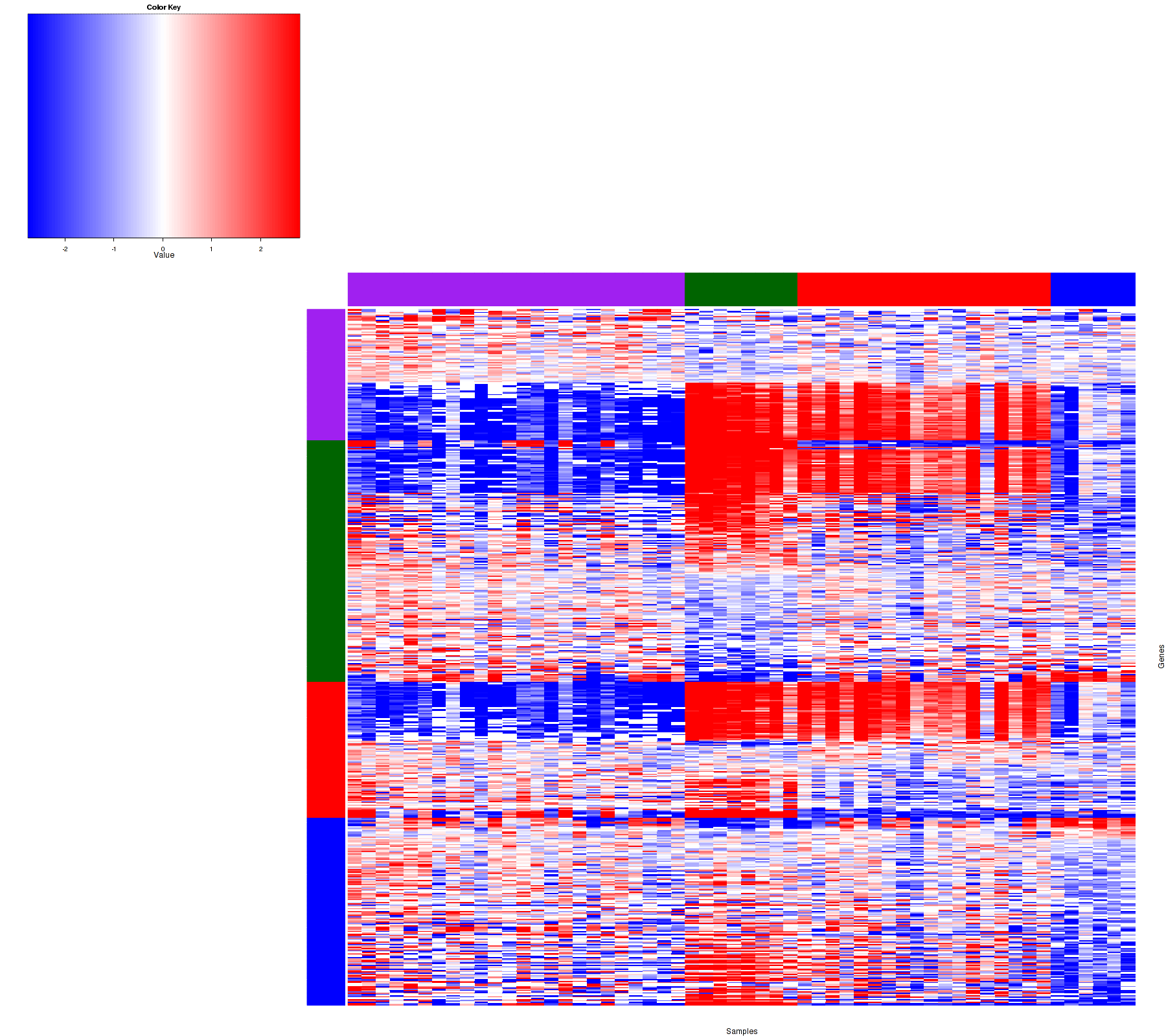 Figure 1. Get High-res Image Samples were separated into 4 clusters. Shown are 56 samples and 531 marker miRs. The color bar of the row indicates the marker miRs for the corresponding cluster.