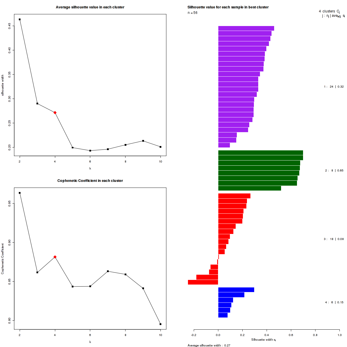 Figure 3. Get High-res Image The silhouette width was calculated for each sample and each value of k. The left upper panel shows the average silhouette width across all samples for each tested k (left upper panel). The left lower panel shows the Cophenetic Correlation Coefficients for each tested k. The right panel shows assignments of clusters to samples and the k silhouette width of each sample for the most robust clustering.