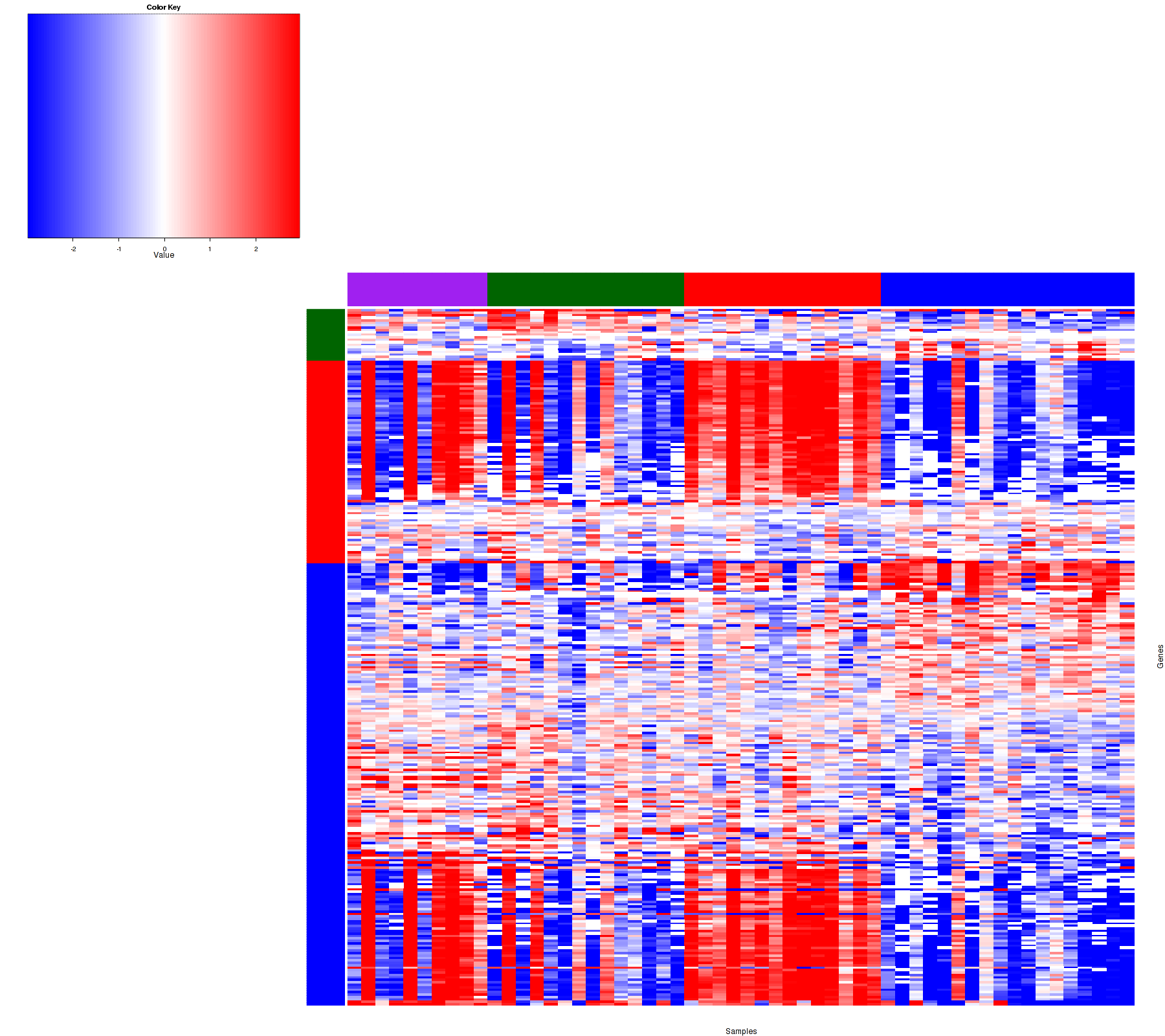 Figure 1. Get High-res Image Samples were separated into 4 clusters. Shown are 56 samples and 285 marker miRs. The color bar of the row indicates the marker miRs for the corresponding cluster.