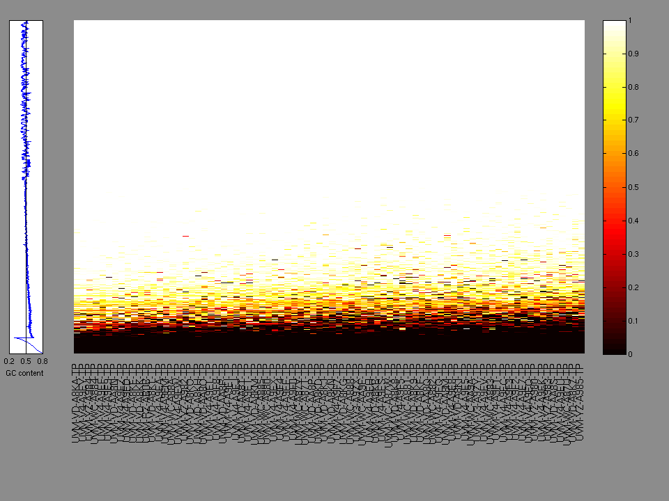 The x axis represents the samples. The y axis represents the exons, one row per exon, and they are sorted by average coverage across samples. For exons with exactly the same average coverage, they are sorted next by the %GC of the exon. (The secondary sort is especially useful for the zero-coverage exons at the bottom). If the figure is unpopulated, then full coverage is assumed (e.g. MutSig CV doesn't use WIGs and assumes full coverage).