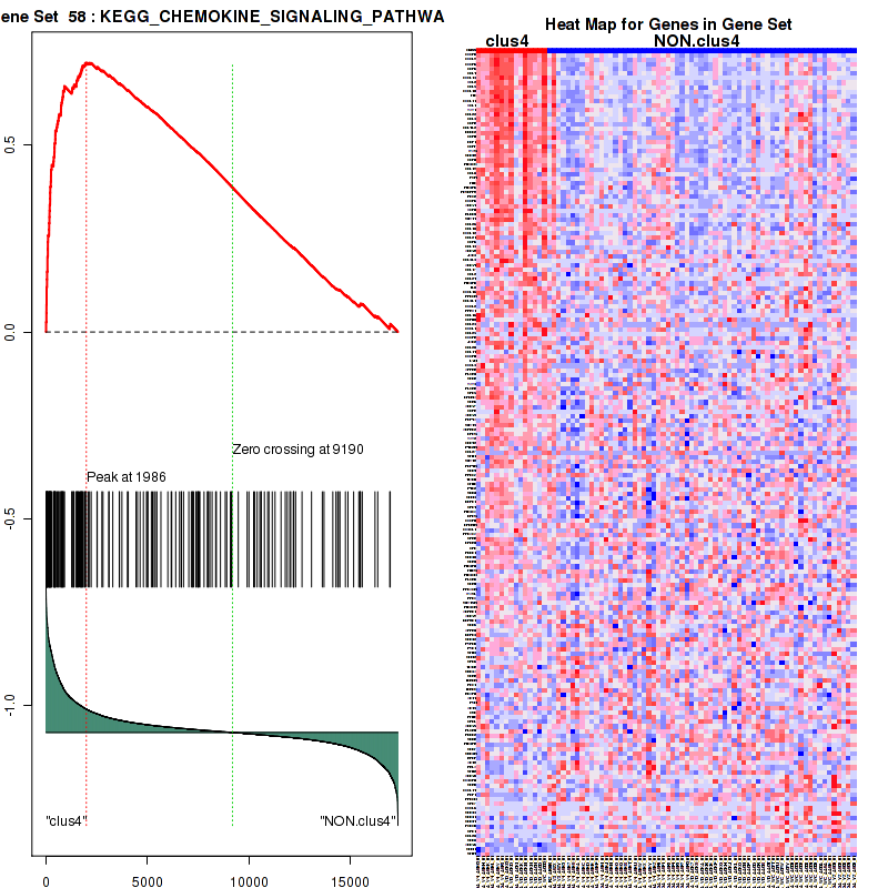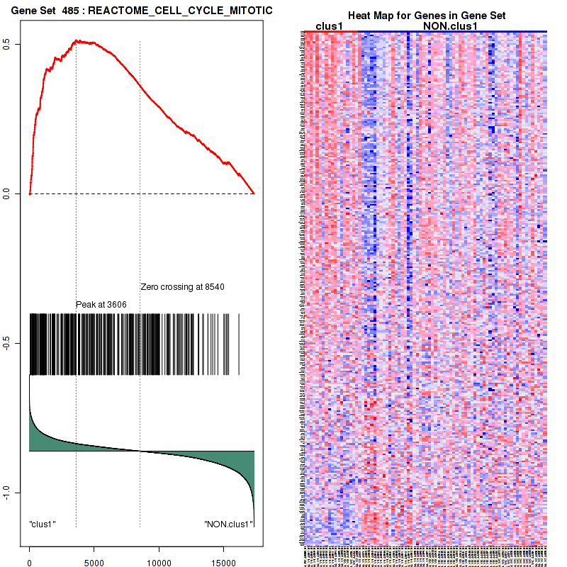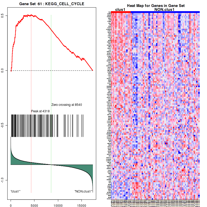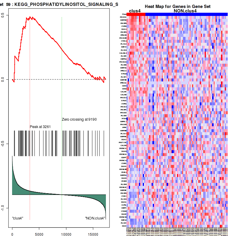 For the expression subtypes of 17361 genes in 81 samples, GSEA found enriched gene sets in each cluster using 80 gene sets in MSigDB canonical pathways. Top enriched gene sets are listed as below.