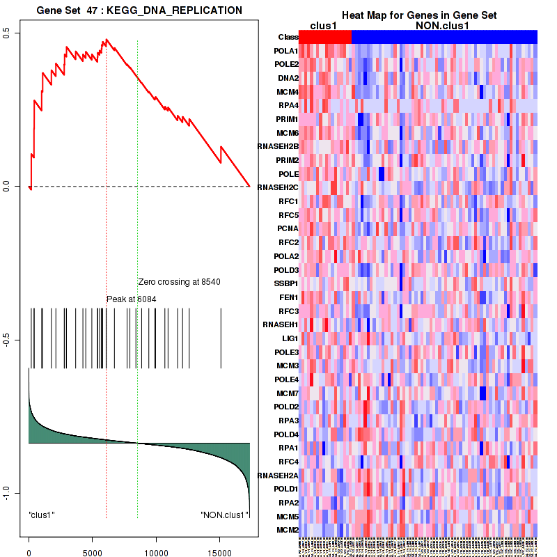 Figure S1. Get High-res Image This plot shows mRNAseq_cNMF expression data heatmap (on the left) a RunningEnrichmentScore(RES) plot (on the top right) and a Signal2Noise(S2N) plot (on the bottom right) of genes in the pathway: KEGG DNA REPLICATION.