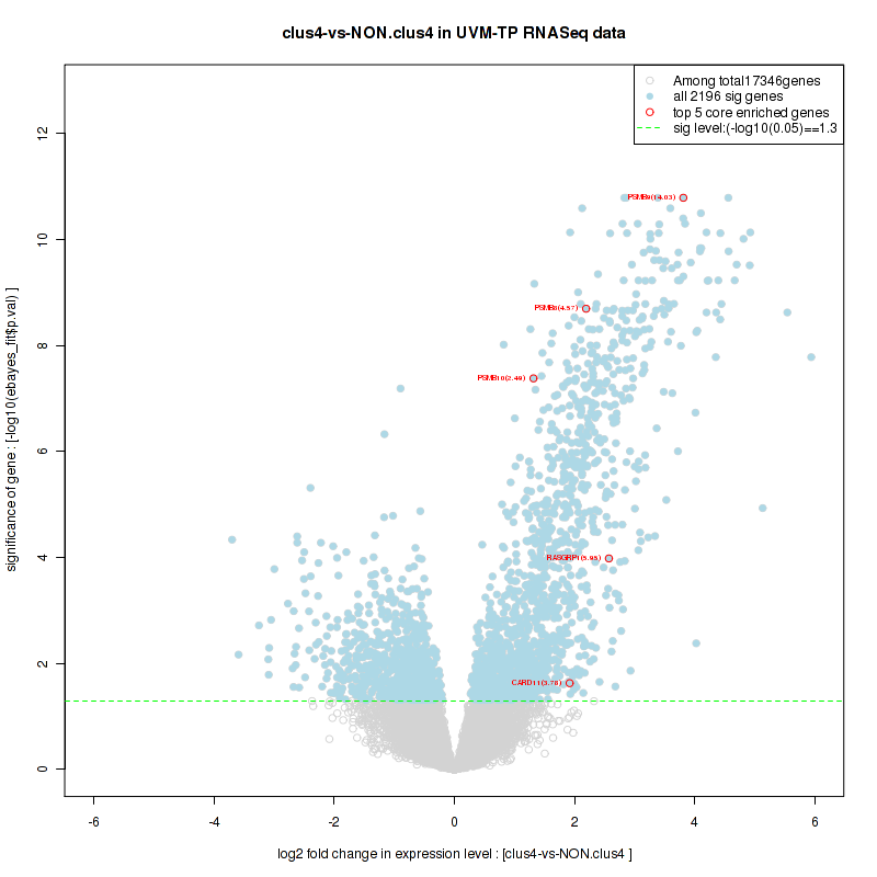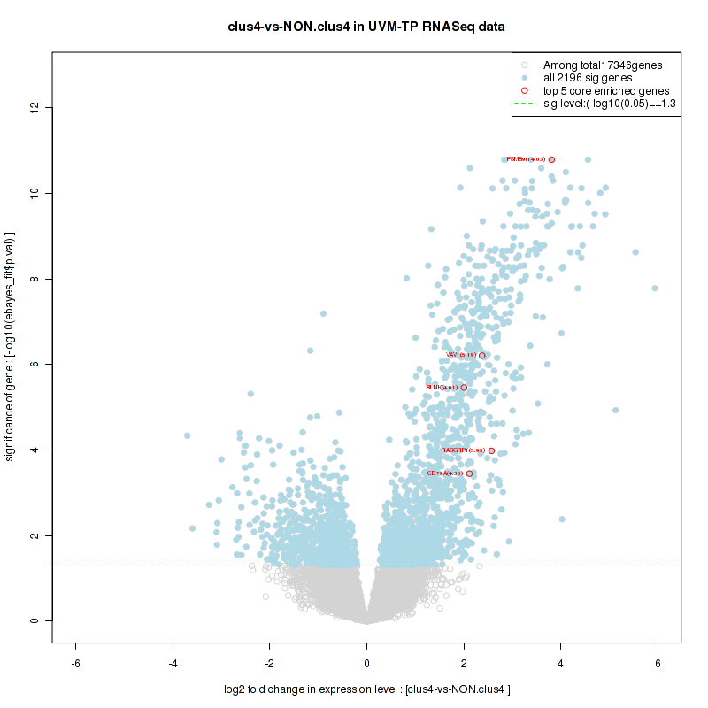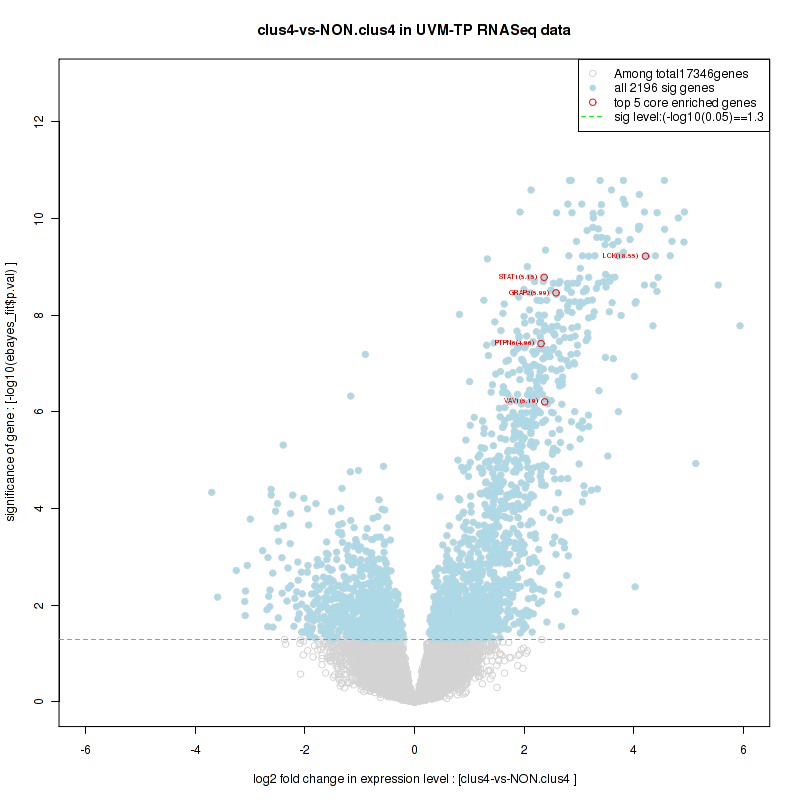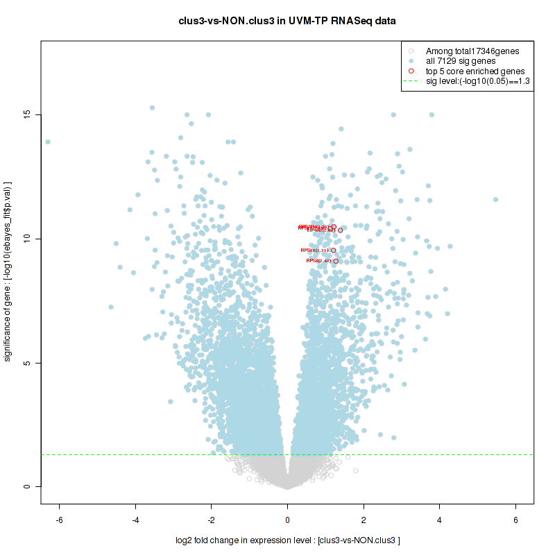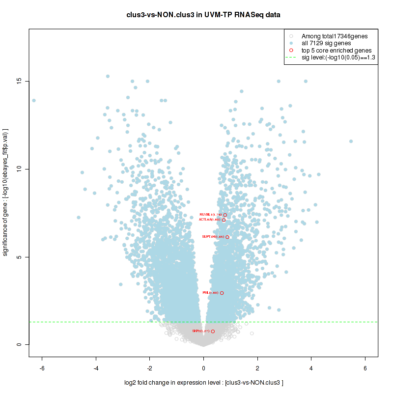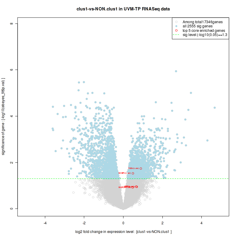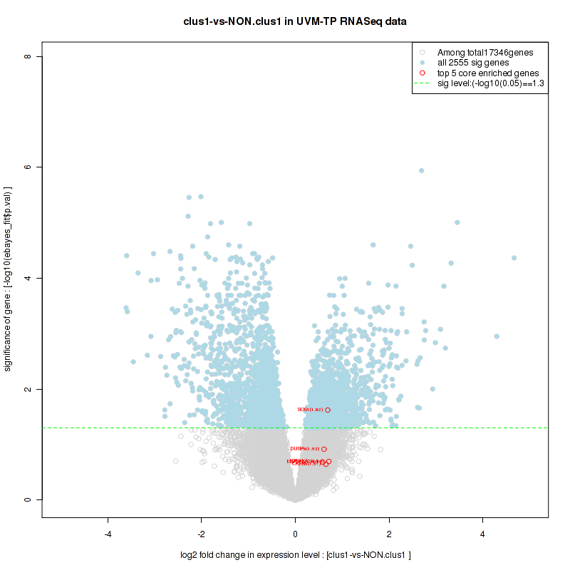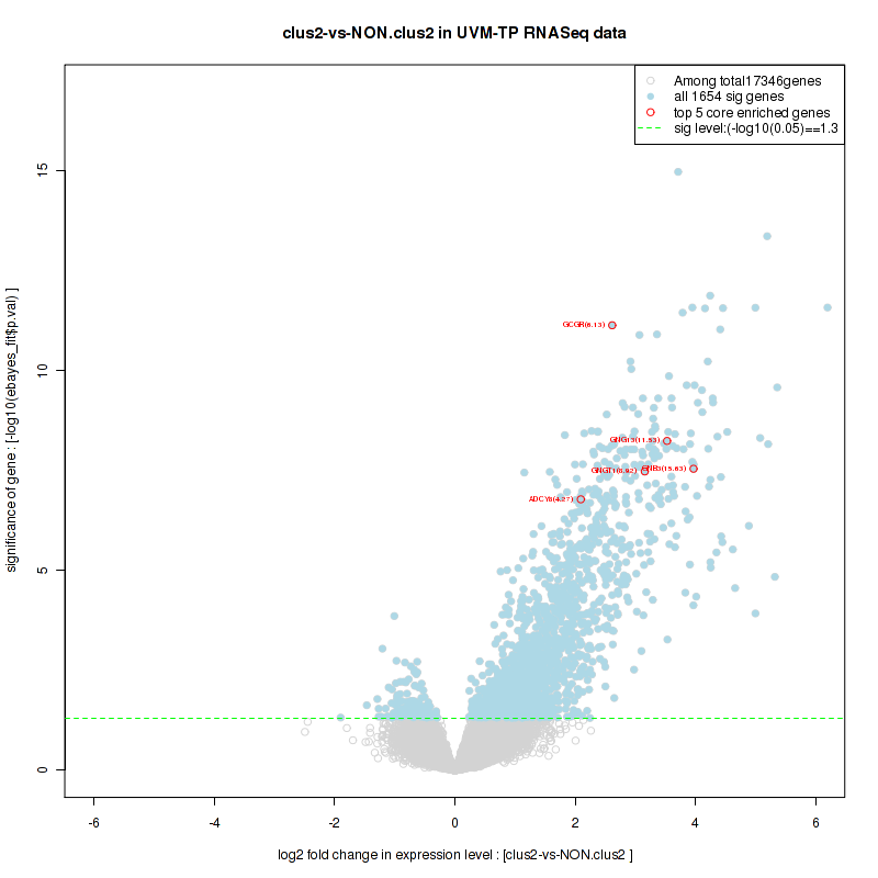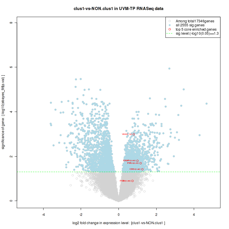Figure S80. Get High-res Image For the top 5 core enriched genes in the pathway: KEGG ENDOCYTOSIS, this volcano plot shows how much they are up/down-regulated and significant. The significance was calculated by empirical bayesian fit