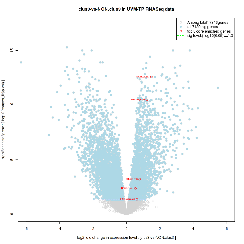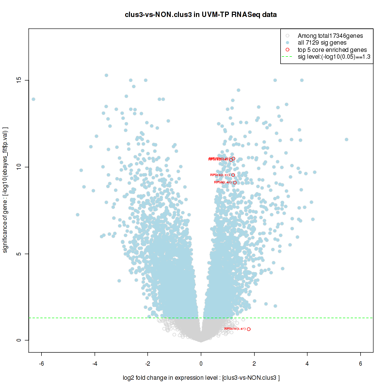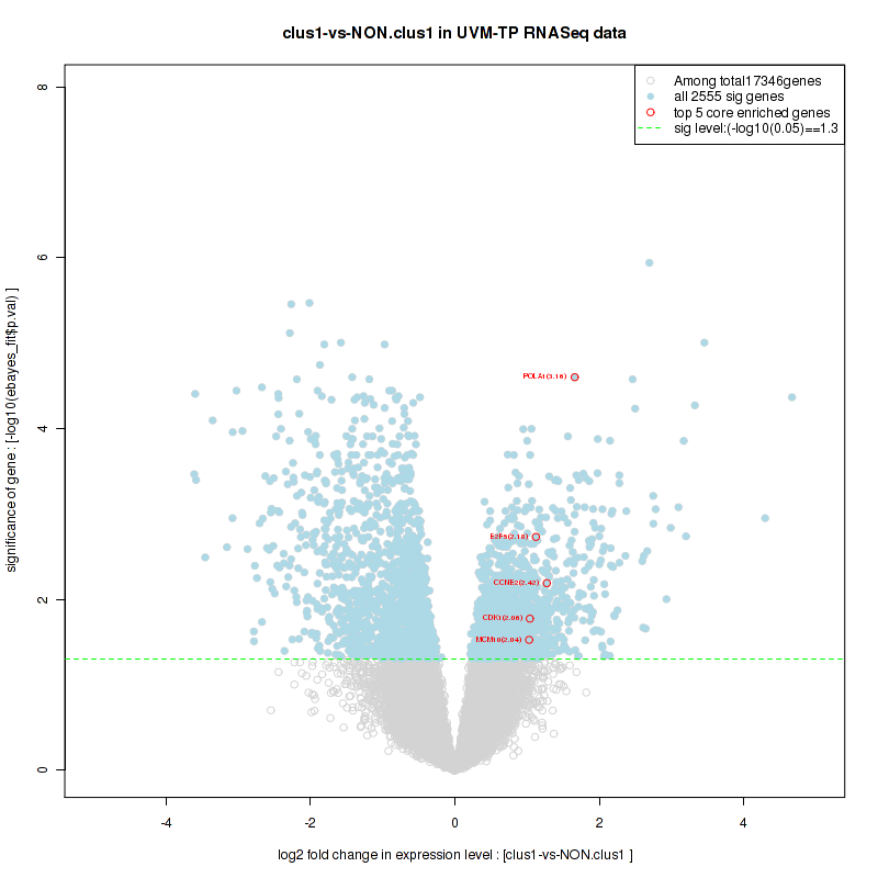 Figure S2. Get High-res Image For the top 5 core enriched genes in the pathway: KEGG DNA REPLICATION, this volcano plot shows how much they are up/down-regulated and significant. The significance was calculated by empirical bayesian fit