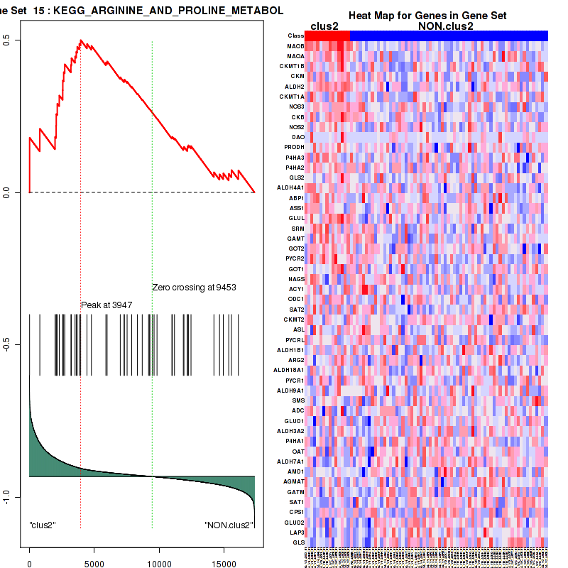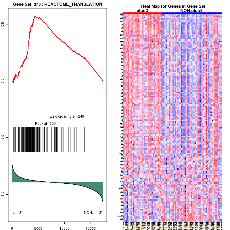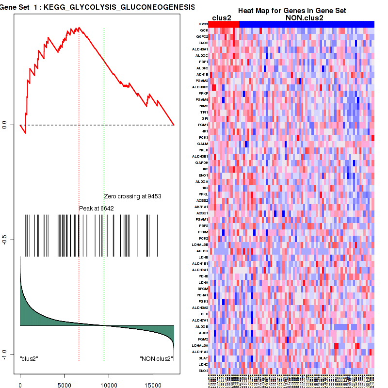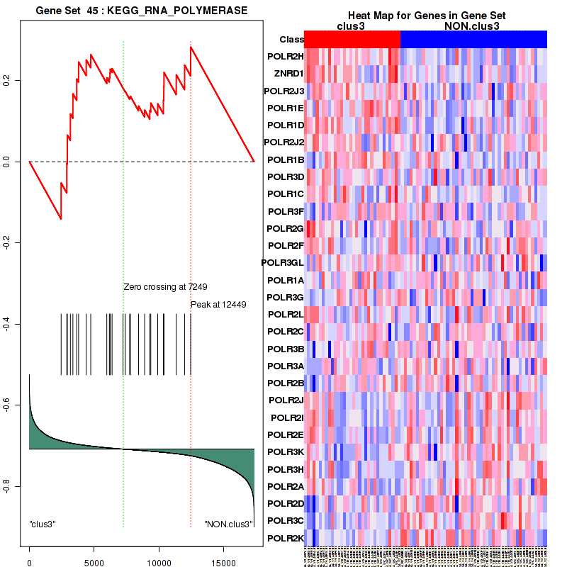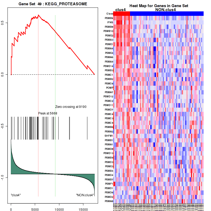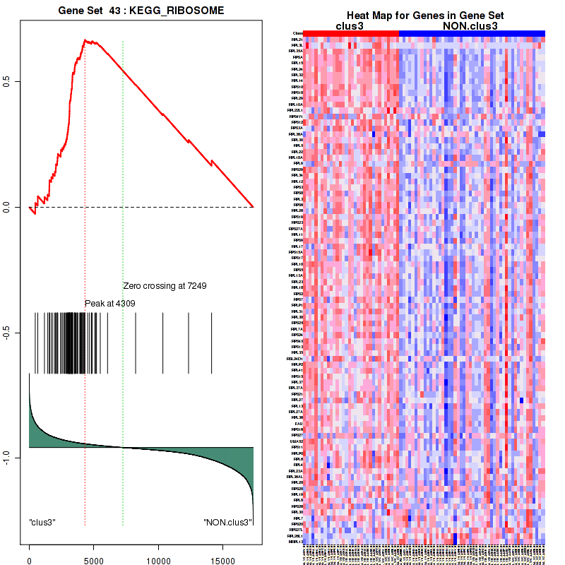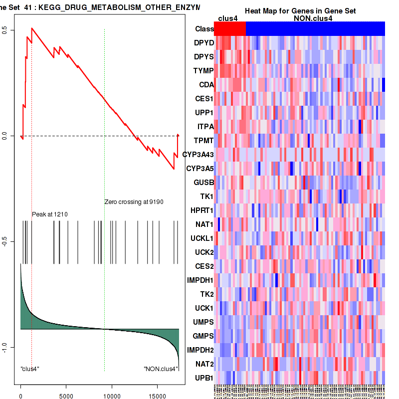 Table S1. Get Full Table This table shows a Running Enrichment Score (RES) of each gene in this pathway, that is, the enrichment score at this point in the ranked list of genes. All genes are ranked by Signal-to-Noise (S2N), a measure of similarity as default and are used to obtain ES matrix of all genes. In this way, GSEA tool uses expression pattern of not only overlapped genes but also not-overlapped genes to produce ES matrix.
