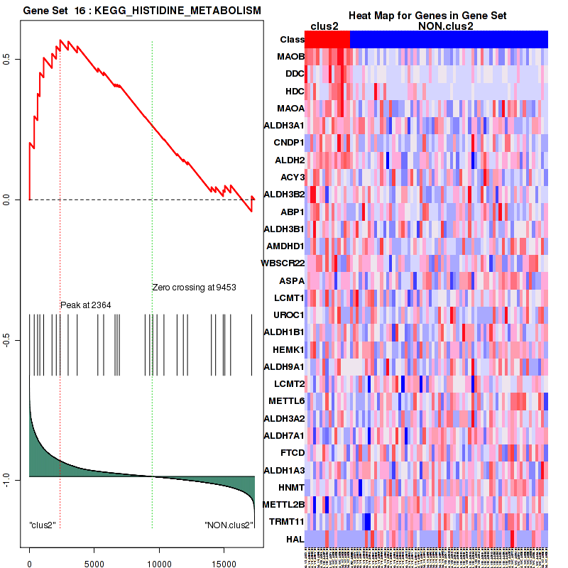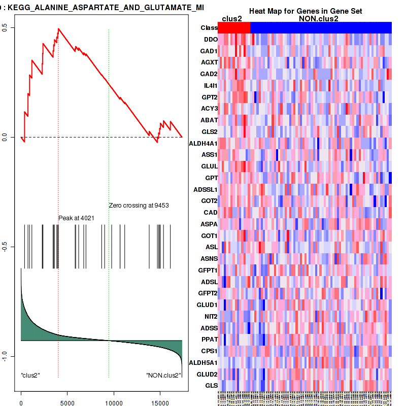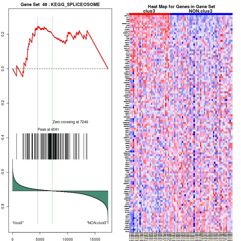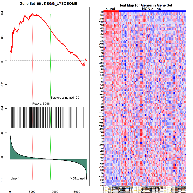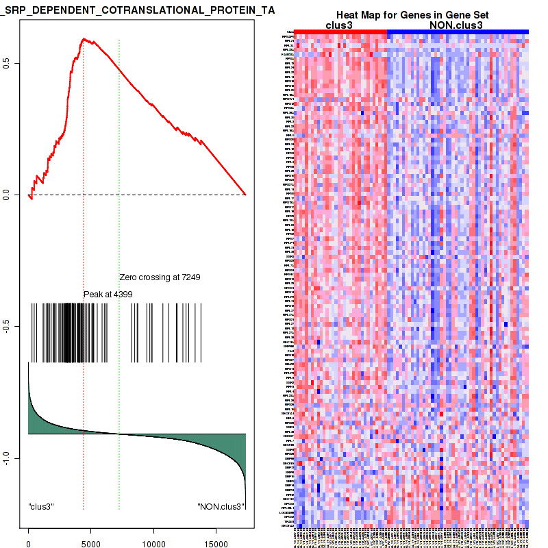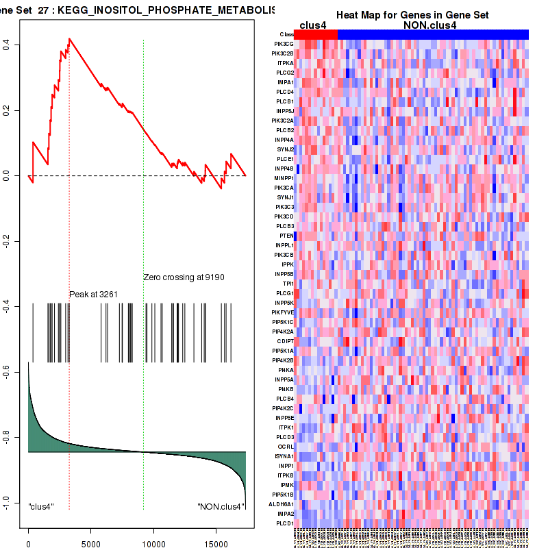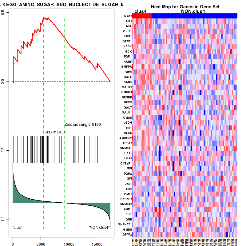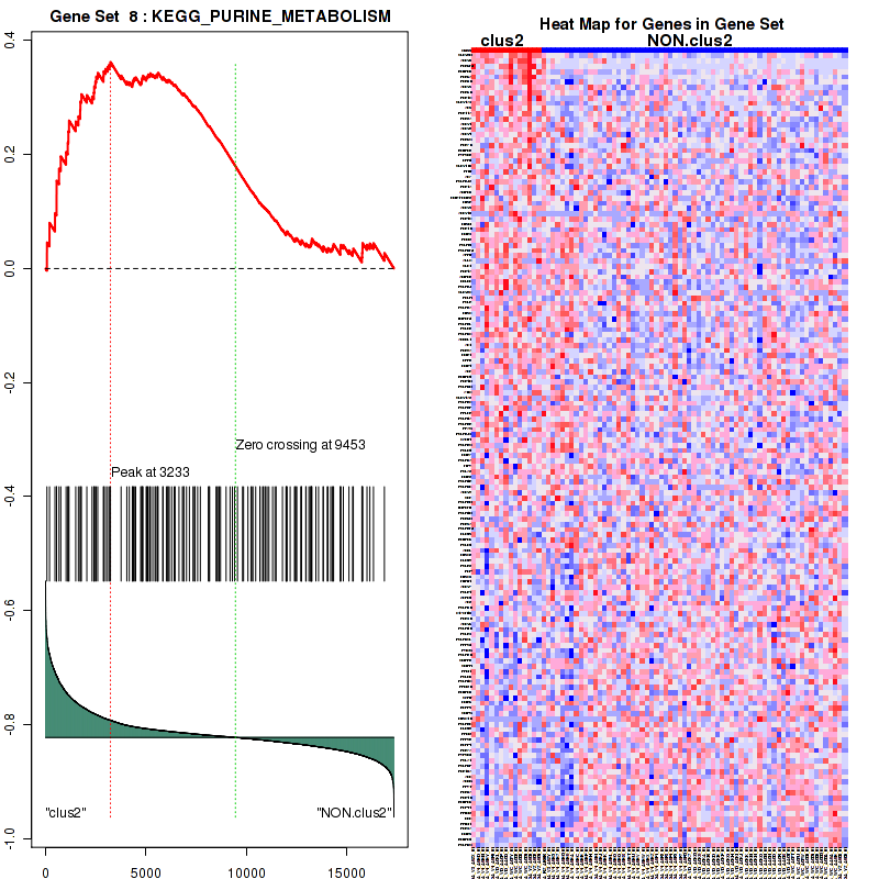 Table S1. Get Full Table This table shows a Running Enrichment Score (RES) of each gene in this pathway, that is, the enrichment score at this point in the ranked list of genes. All genes are ranked by Signal-to-Noise (S2N), a measure of similarity as default and are used to obtain ES matrix of all genes. In this way, GSEA tool uses expression pattern of not only overlapped genes but also not-overlapped genes to produce ES matrix.