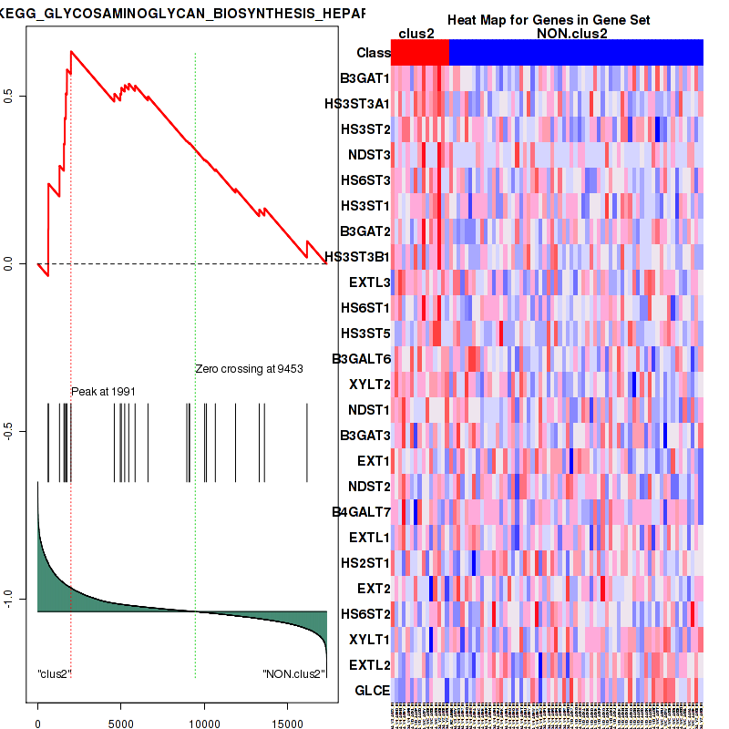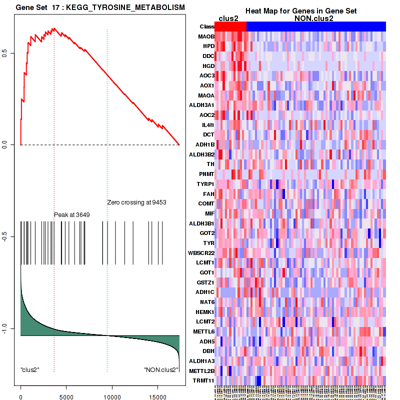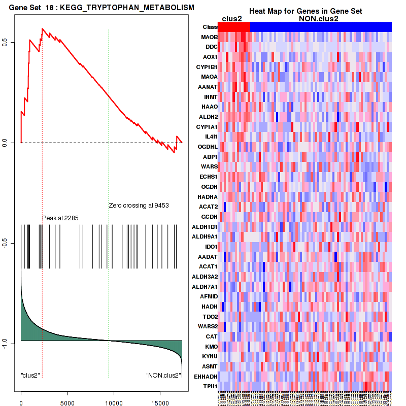 Table S40. Get Full Table This table shows a Running Enrichment Score (RES) of each gene in this pathway, that is, the enrichment score at this point in the ranked list of genes. All genes are ranked by Signal-to-Noise (S2N), a measure of similarity as default and are used to obtain ES matrix of all genes. In this way, GSEA tool uses expression pattern of not only overlapped genes but also not-overlapped genes to produce ES matrix.
