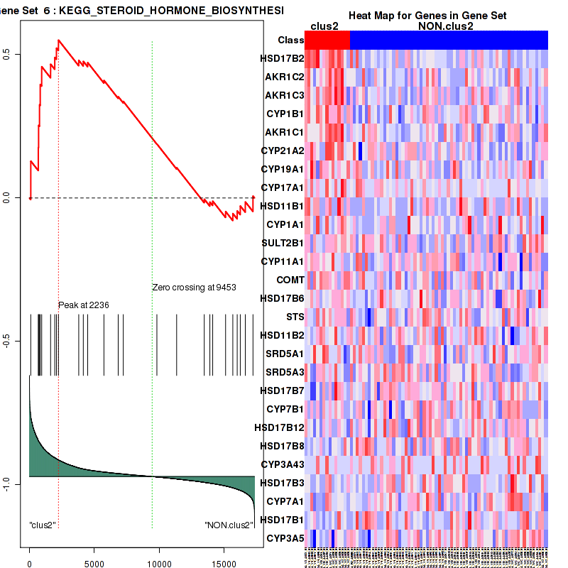 Table S2. Get Full Table This table shows a Running Enrichment Score (RES) of each gene in this pathway, that is, the enrichment score at this point in the ranked list of genes. All genes are ranked by Signal-to-Noise (S2N), a measure of similarity as default and are used to obtain ES matrix of all genes. In this way, GSEA tool uses expression pattern of not only overlapped genes but also not-overlapped genes to produce ES matrix.