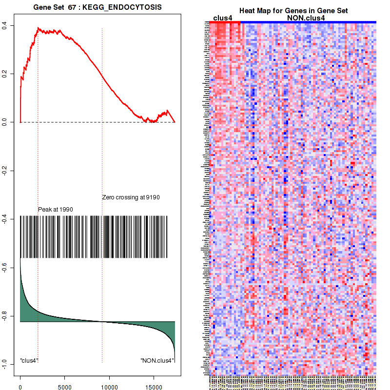 Figure S79. Get High-res Image This plot shows mRNAseq_cNMF expression data heatmap (on the left) a RunningEnrichmentScore(RES) plot (on the top right) and a Signal2Noise(S2N) plot (on the bottom right) of genes in the pathway: KEGG ENDOCYTOSIS.