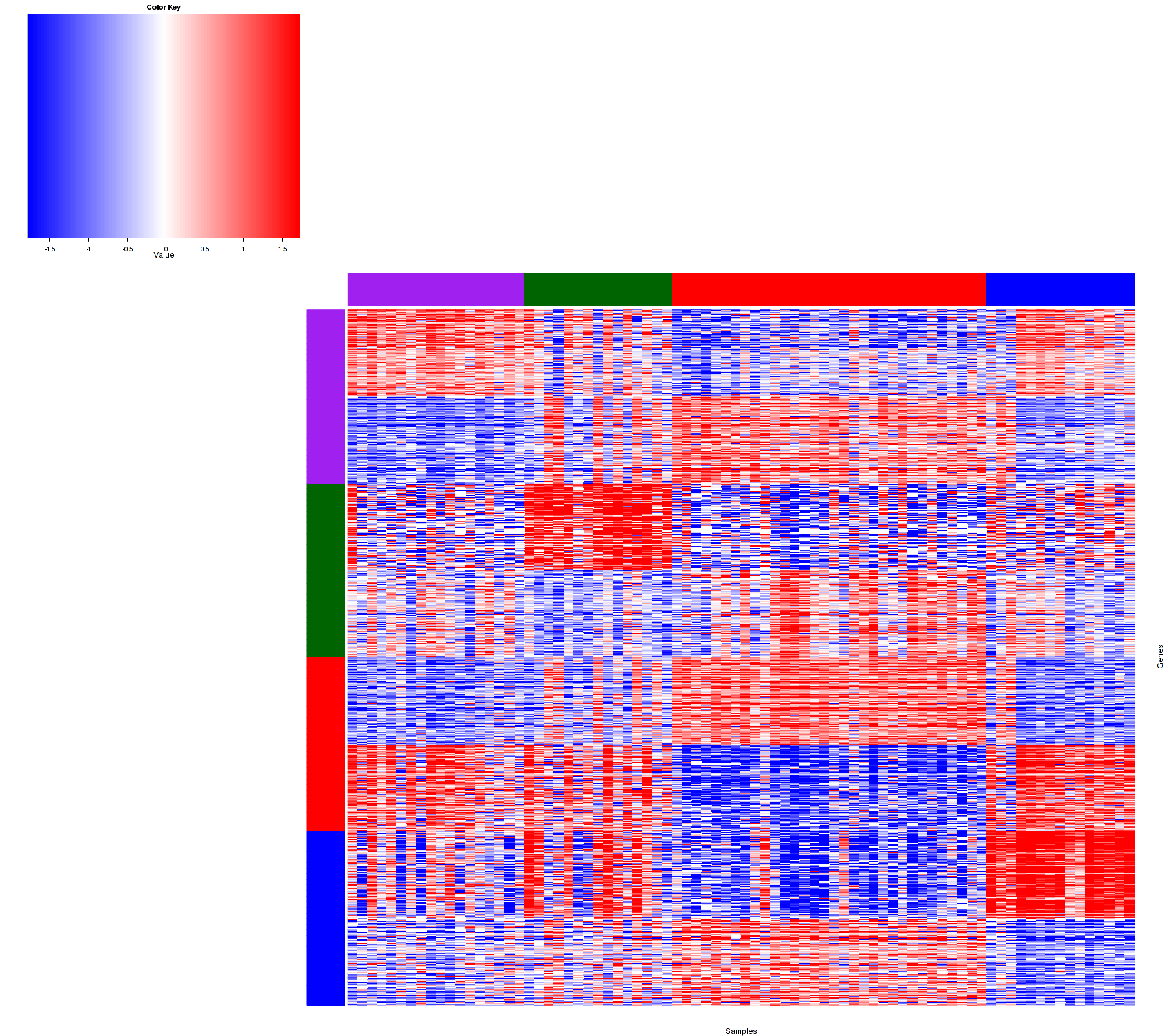 Figure 1. Get High-res Image Samples were separated into 4 clusters. Shown are 80 samples and 1200 marker genes. The color bar of the row indicates the marker genes for the corresponding cluster.
