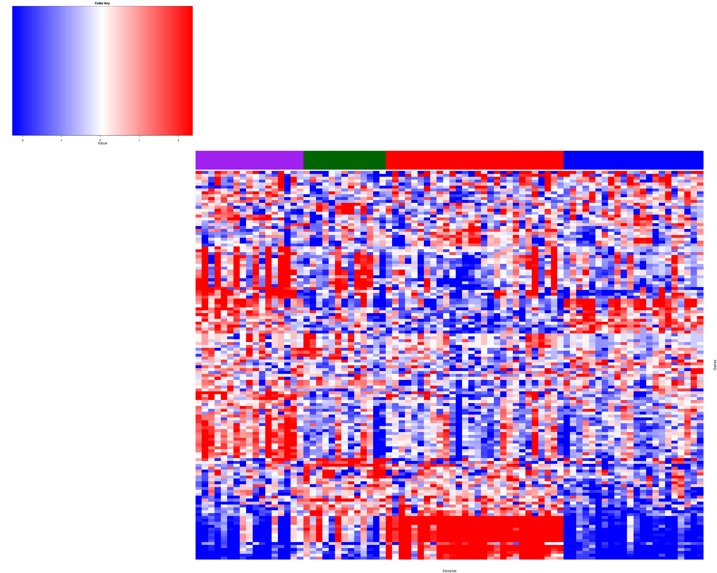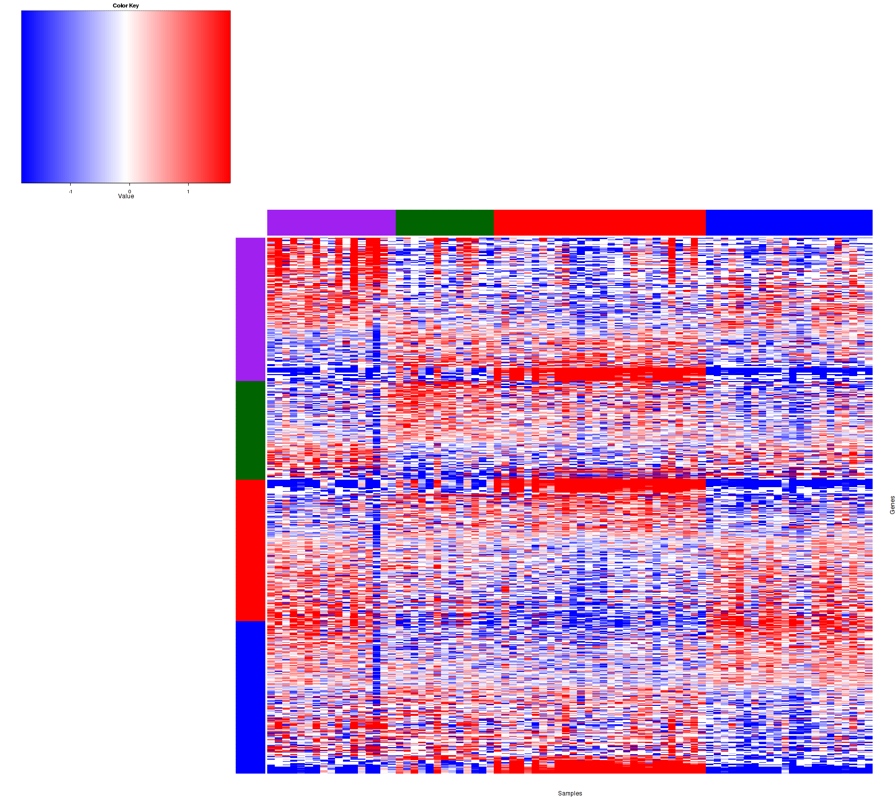 Figure 1. Get High-res Image Samples were separated into 4 clusters. Shown are 80 samples and 607 marker miRs. The color bar of the row indicates the marker miRs for the corresponding cluster.