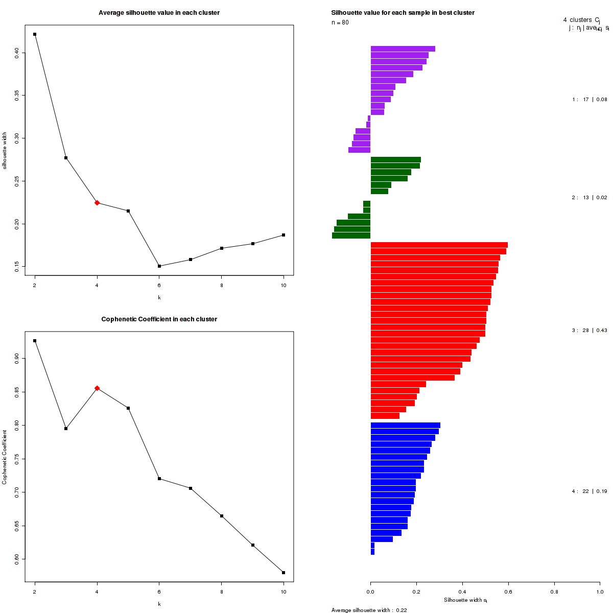 The cophenetic correlation coefficients and average silhouette values are used to determine the k with the most robust clusterings. From the plot of cophenetic correlation versus k, we select modes and the the point preceding the greatest decrease in cophenetic correlation coefficient, and from these choose the k with the highest average silhouette value.