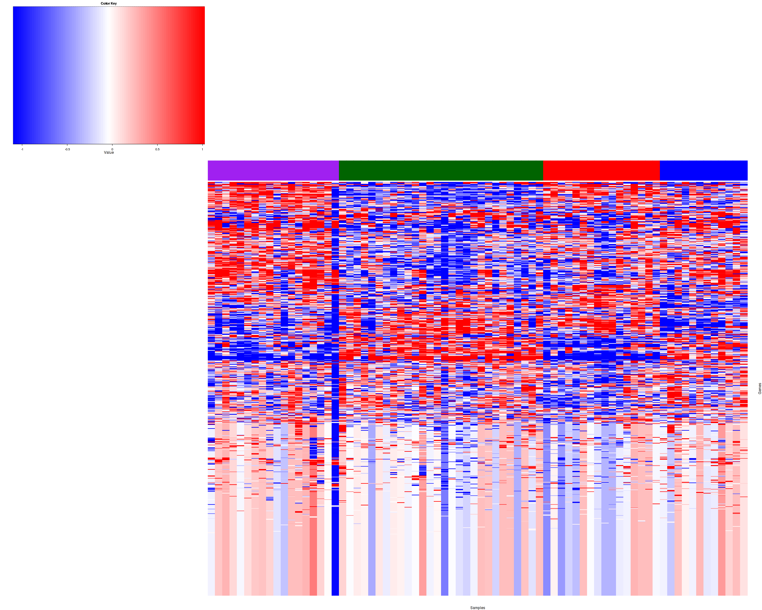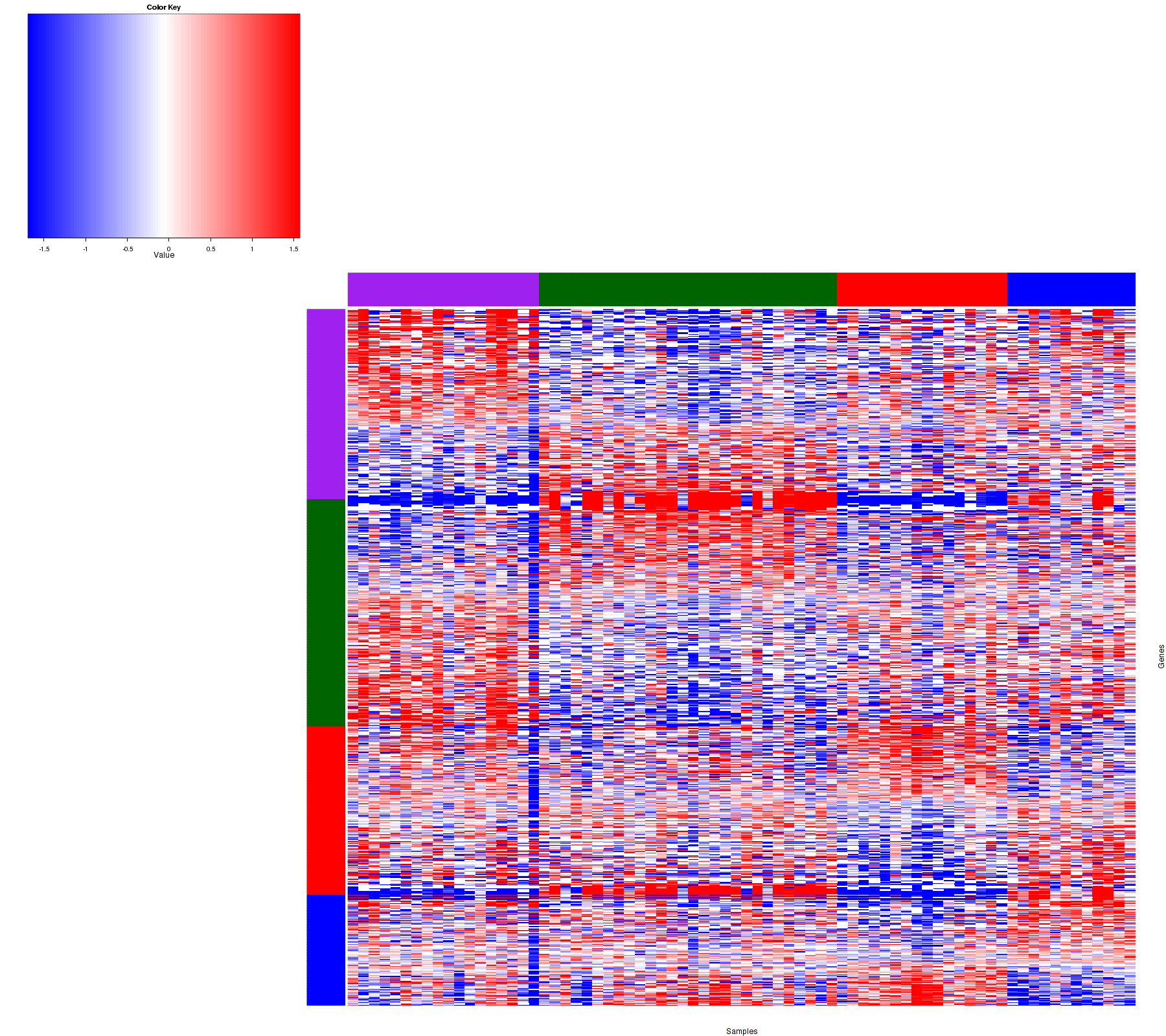 Figure 1. Get High-res Image Samples were separated into 4 clusters. Shown are 74 samples and 824 marker miRs. The color bar of the row indicates the marker miRs for the corresponding cluster.