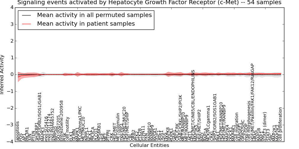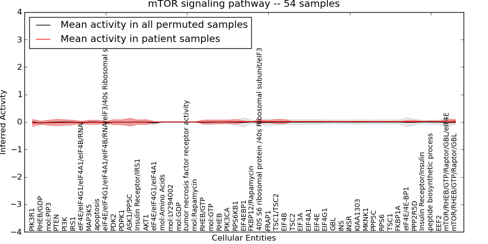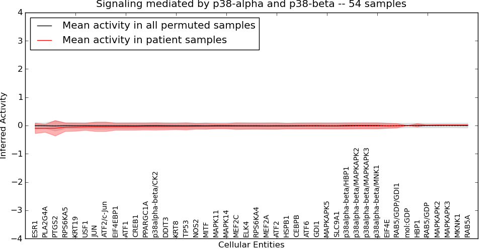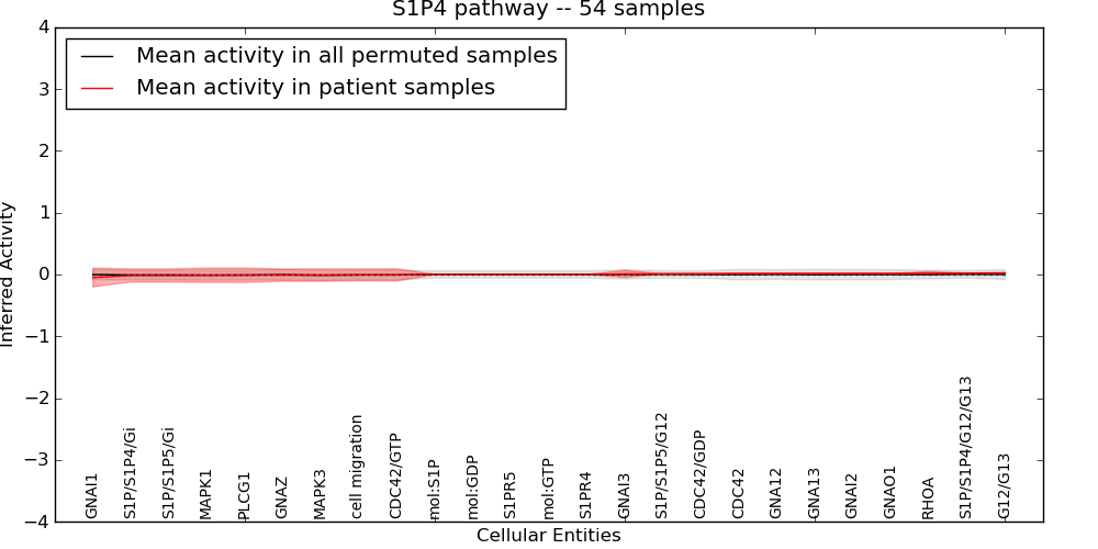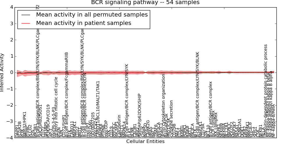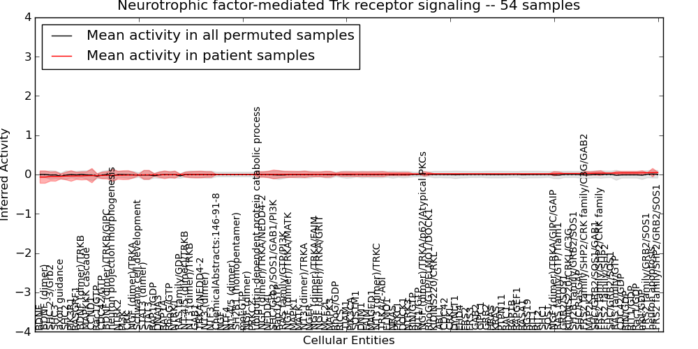 Figure S131.  Get High-res Image This plot shows pathway concept perturbations across all samples against a permutation model. The concepts along the x-axis are sorted by lowest to highest mean activity for the real patient samples. Mean inferred activities are plotted along the y-axis as a colored band showing the average level and one standard deviation range. Real samples are shown in red and permuted samples in black.