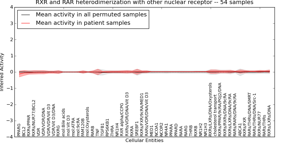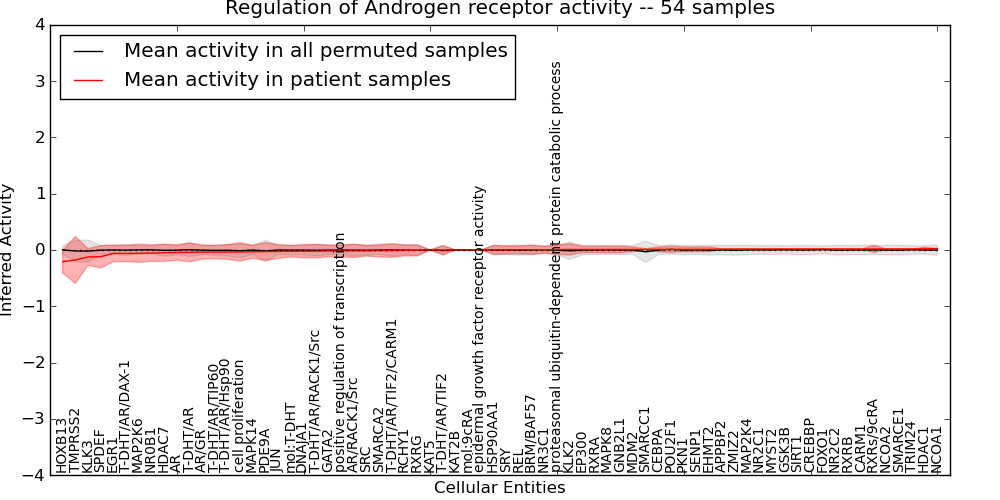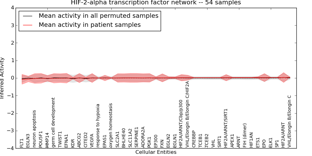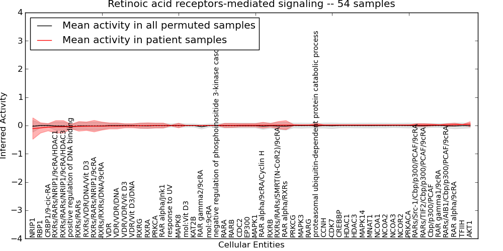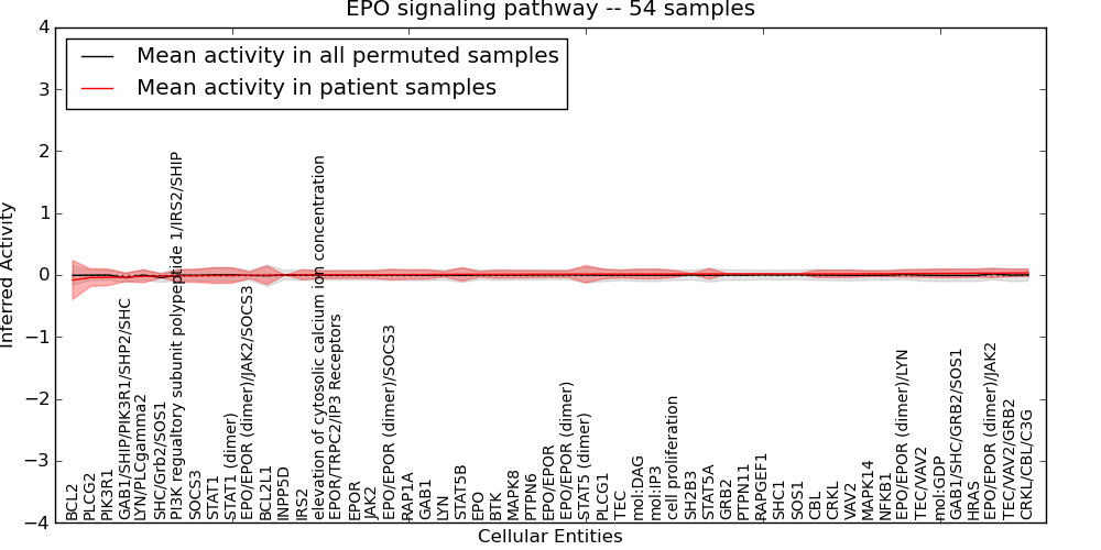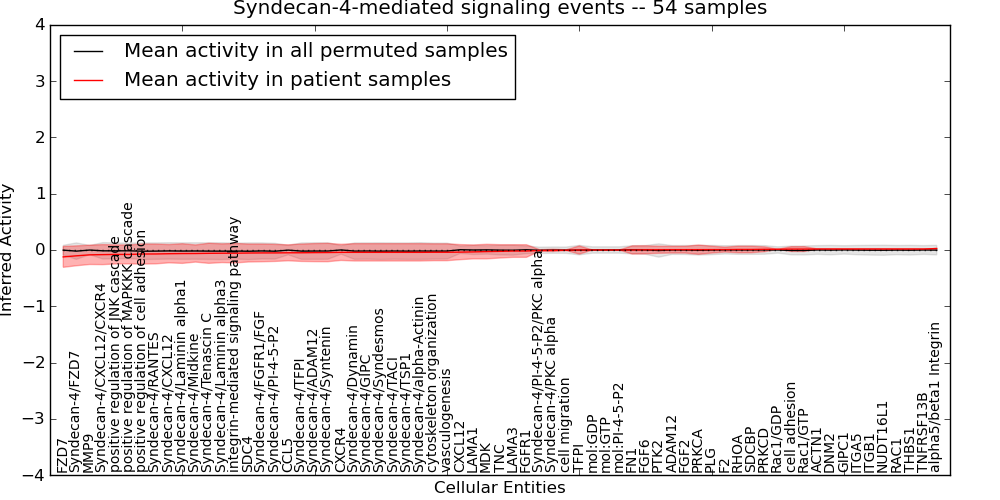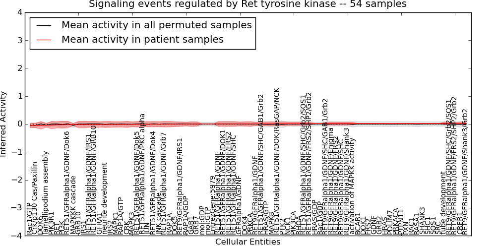Figure S131.  Get High-res Image This plot shows pathway concept perturbations across all samples against a permutation model. The concepts along the x-axis are sorted by lowest to highest mean activity for the real patient samples. Mean inferred activities are plotted along the y-axis as a colored band showing the average level and one standard deviation range. Real samples are shown in red and permuted samples in black.