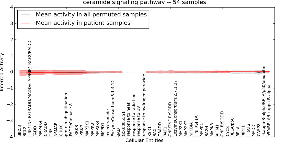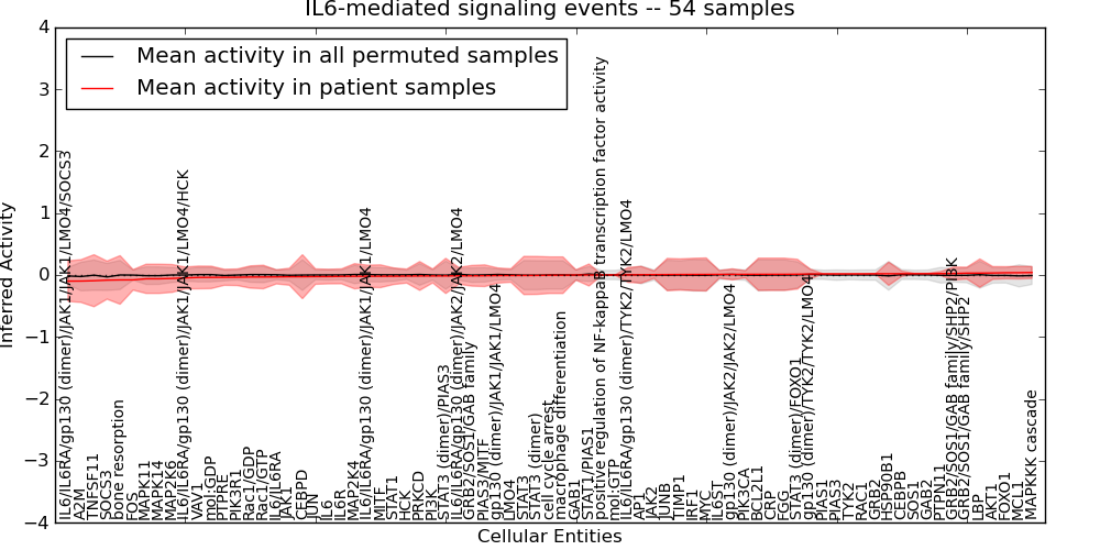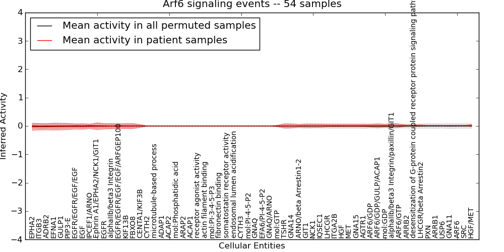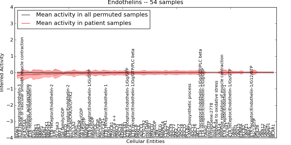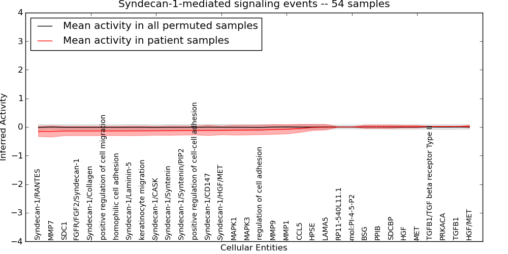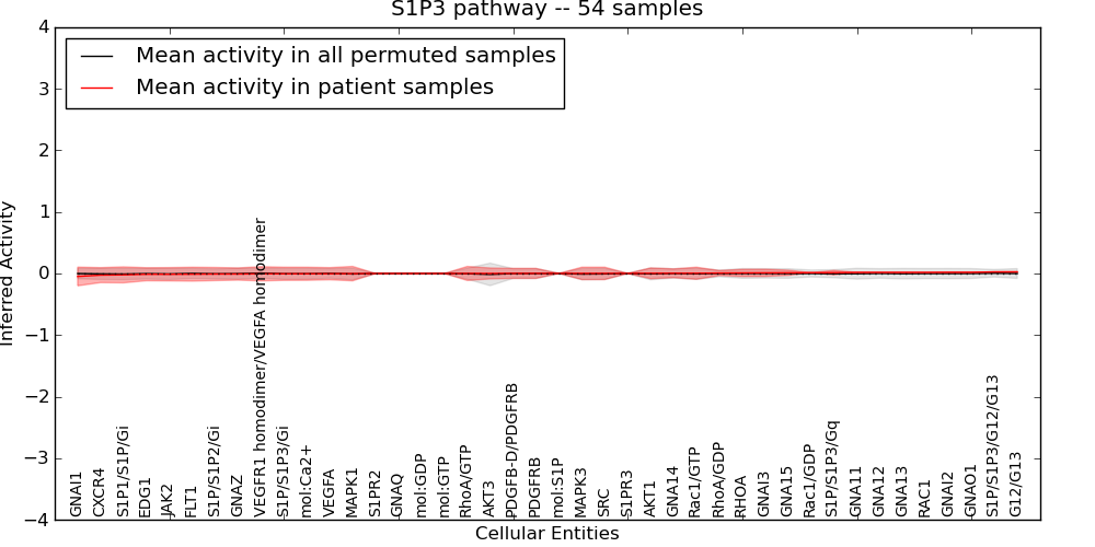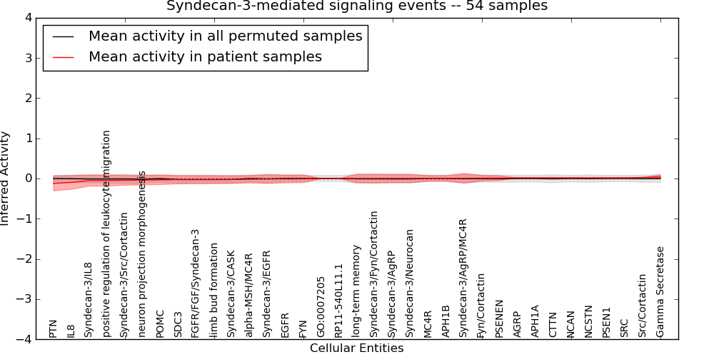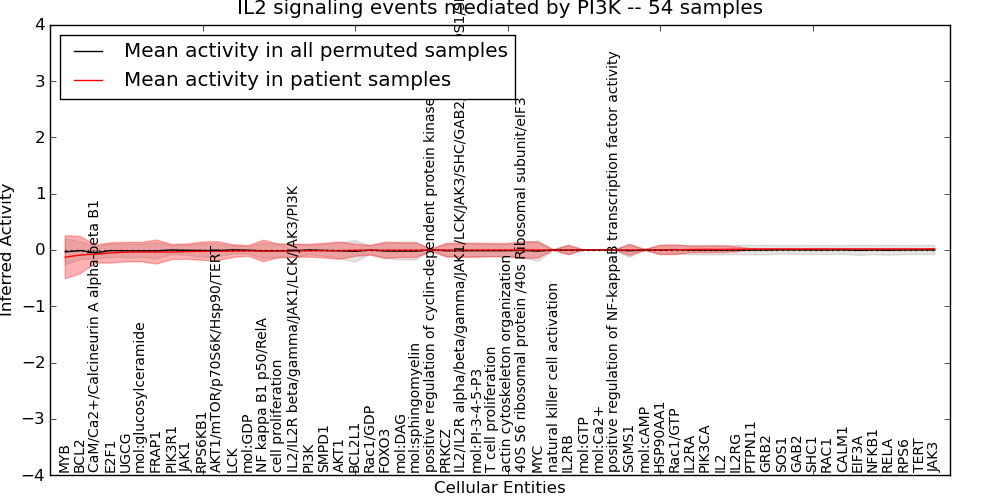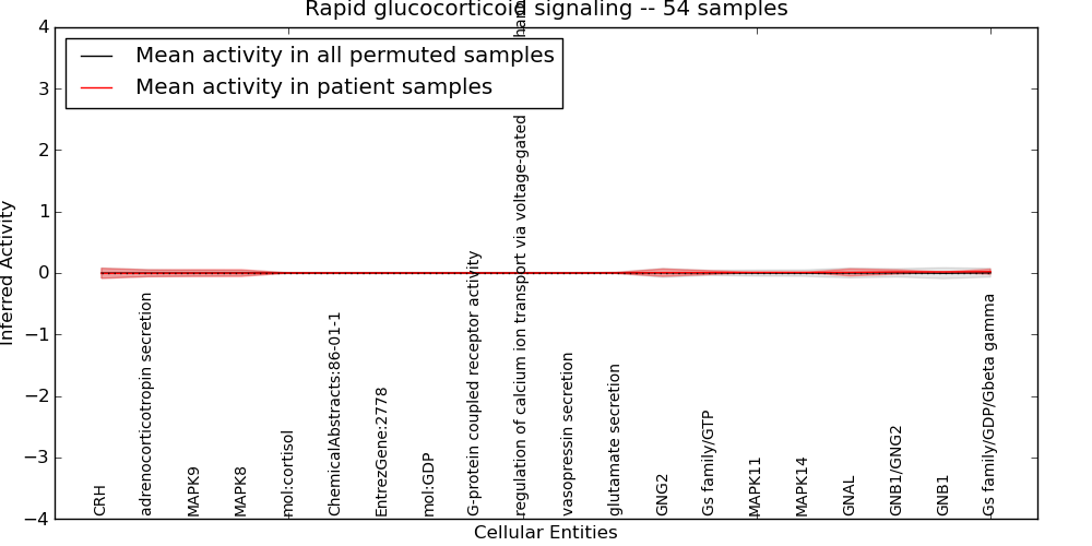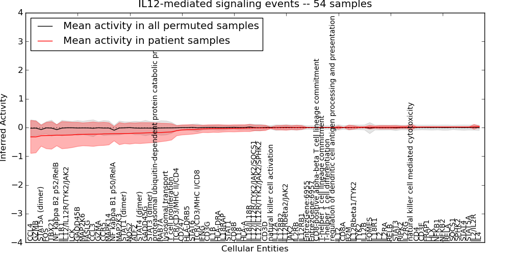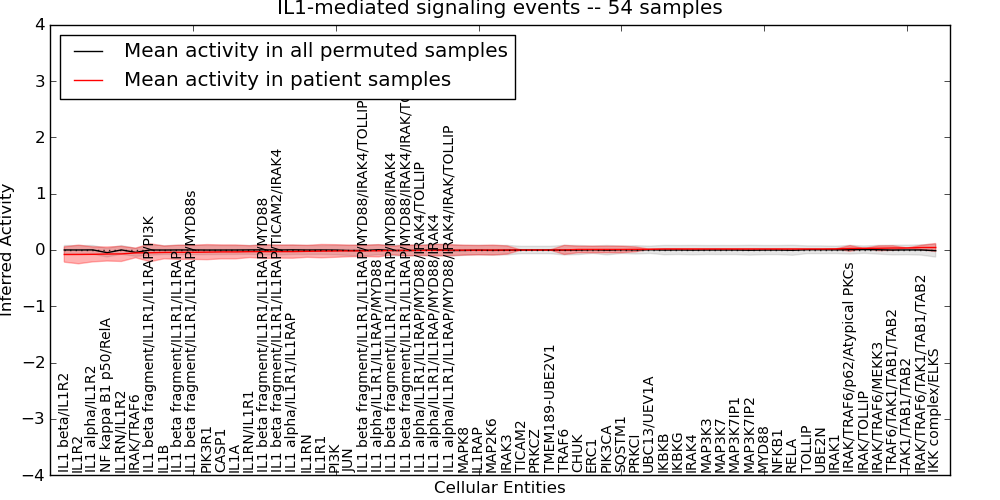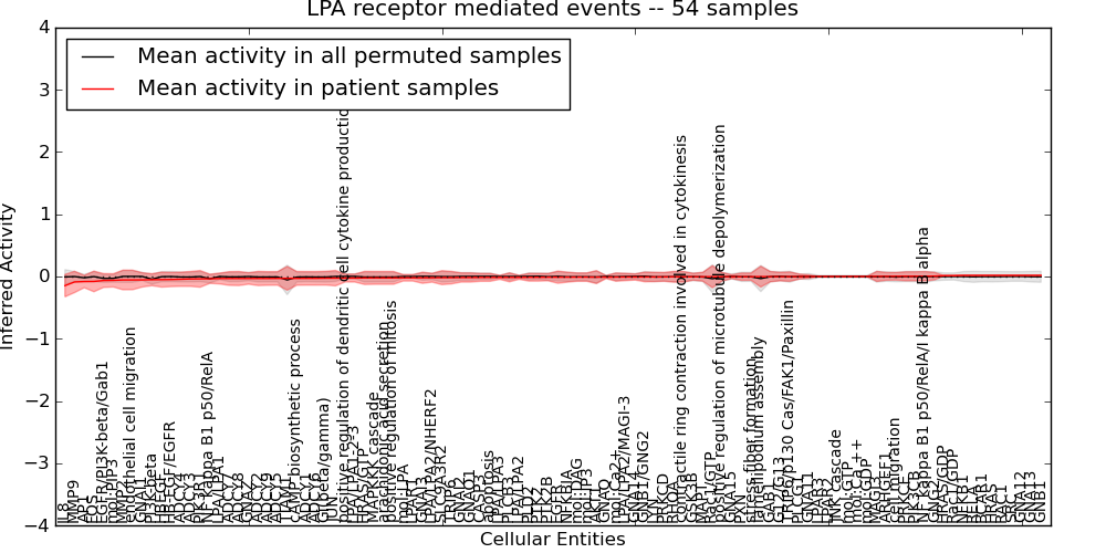 Figure S131. Get High-res Image This plot shows pathway concept perturbations across all samples against a permutation model. The concepts along the x-axis are sorted by lowest to highest mean activity for the real patient samples. Mean inferred activities are plotted along the y-axis as a colored band showing the average level and one standard deviation range. Real samples are shown in red and permuted samples in black.