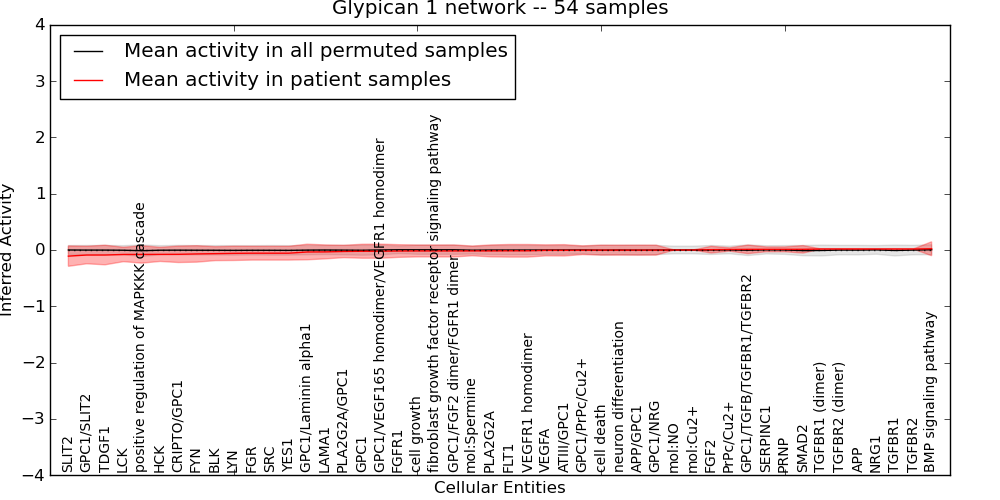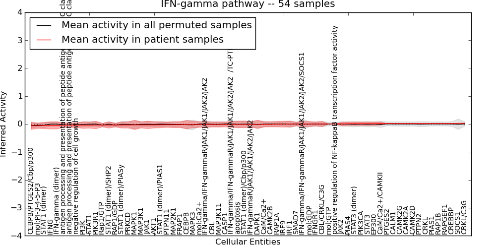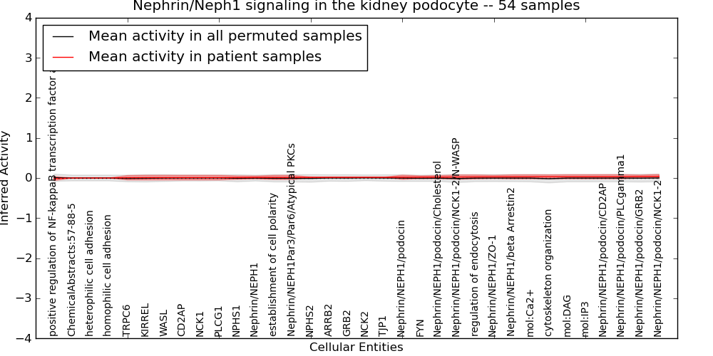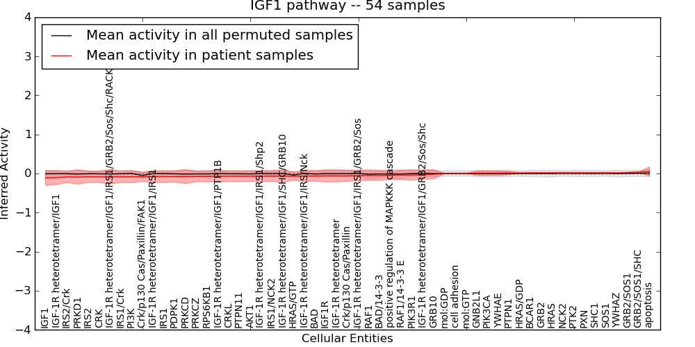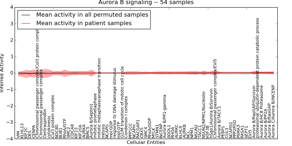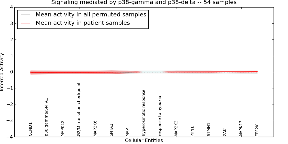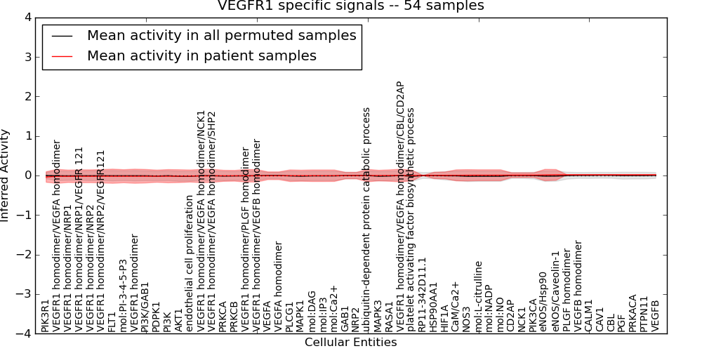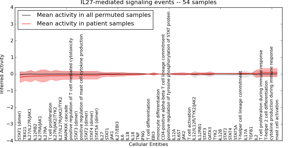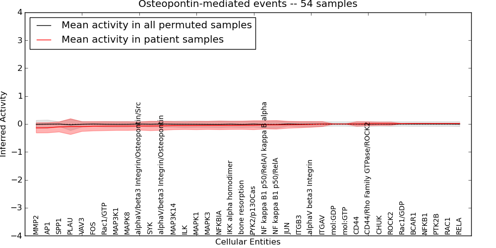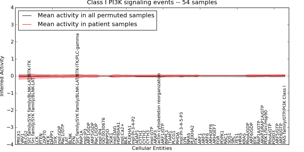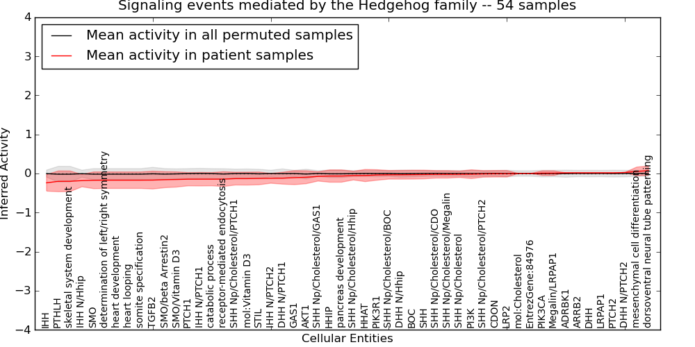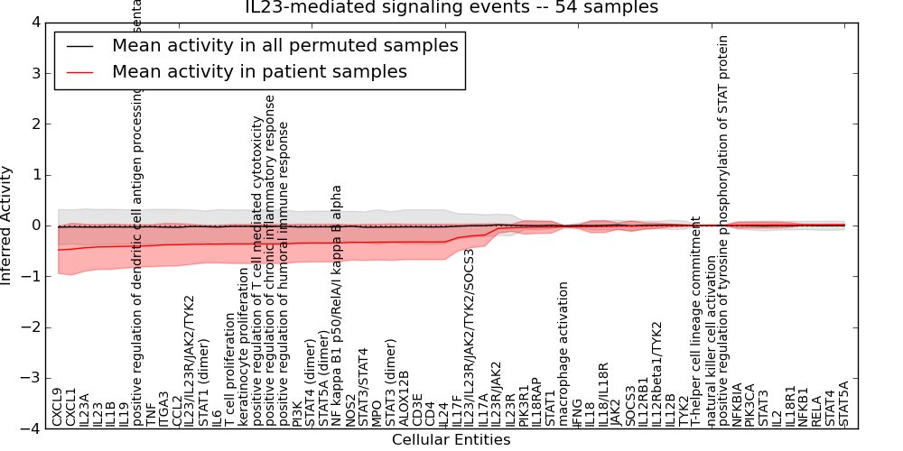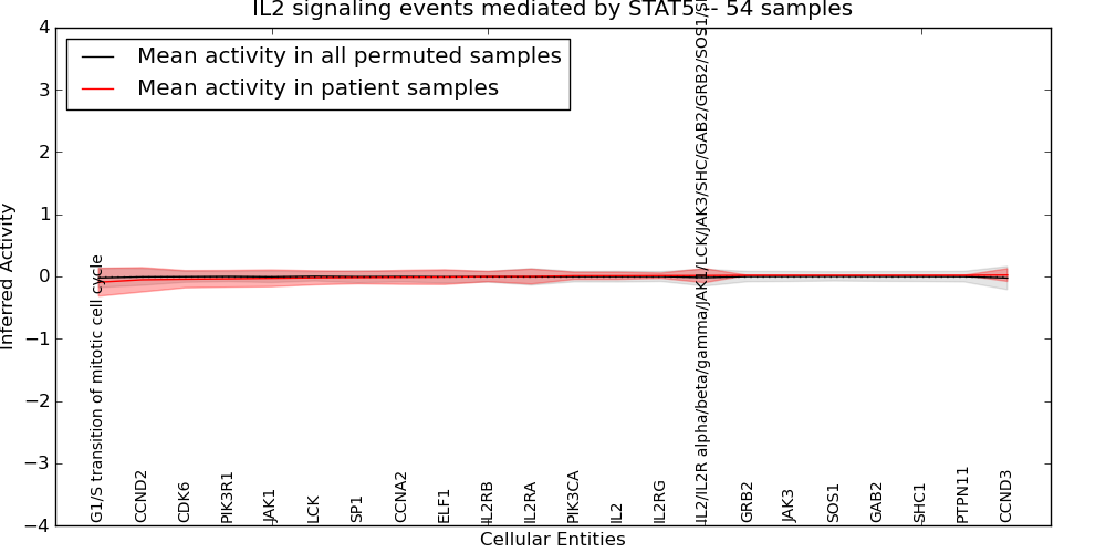 Figure S131. Get High-res Image This plot shows pathway concept perturbations across all samples against a permutation model. The concepts along the x-axis are sorted by lowest to highest mean activity for the real patient samples. Mean inferred activities are plotted along the y-axis as a colored band showing the average level and one standard deviation range. Real samples are shown in red and permuted samples in black.