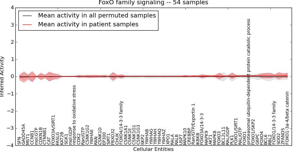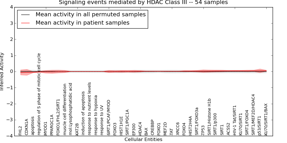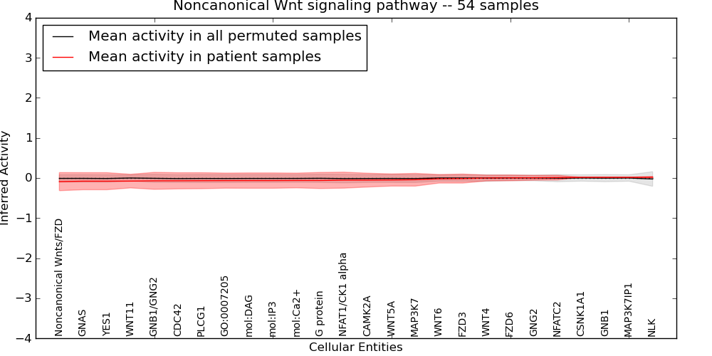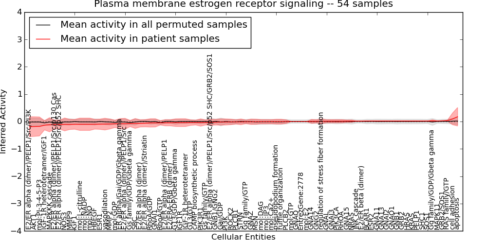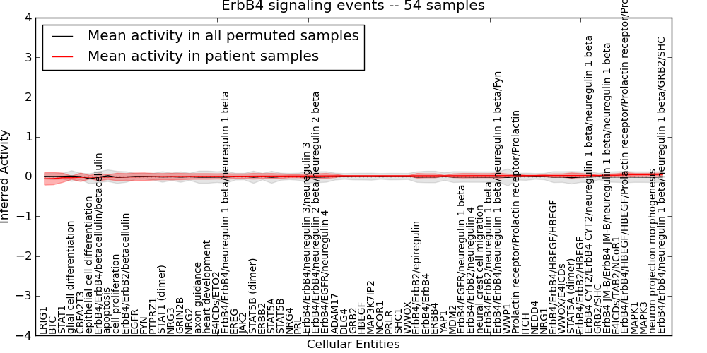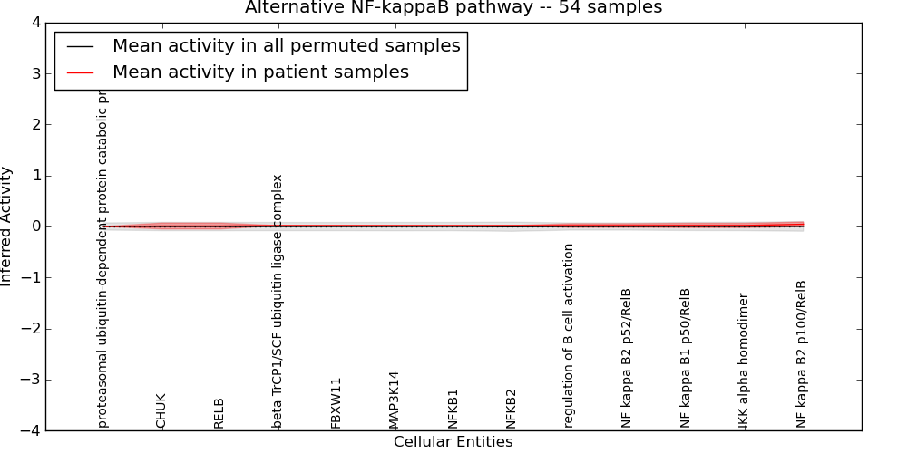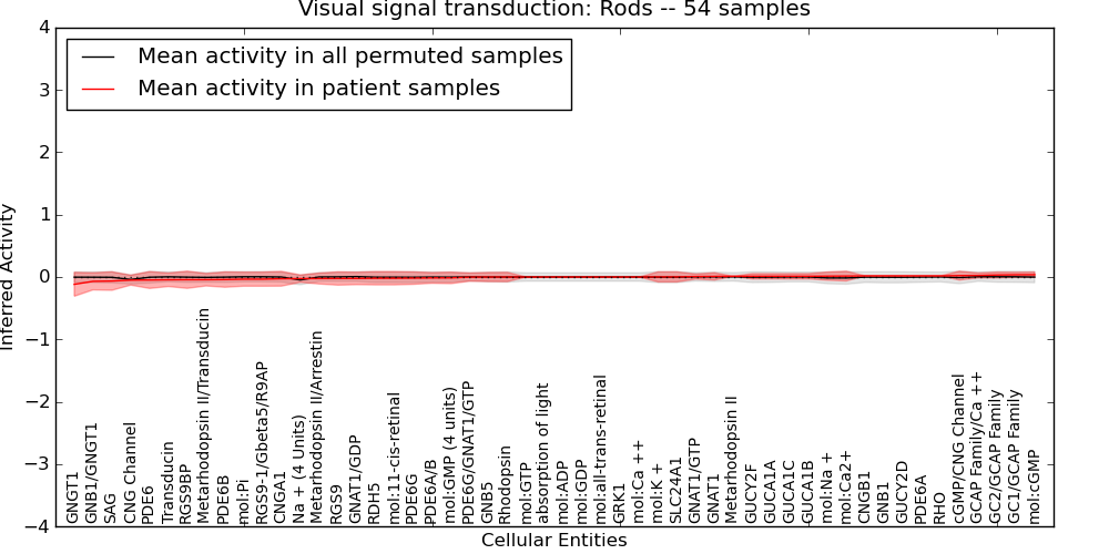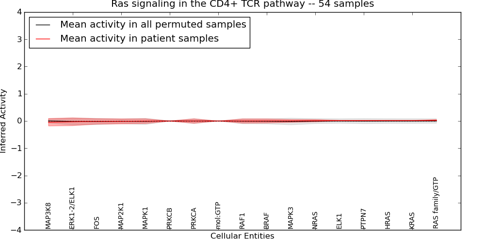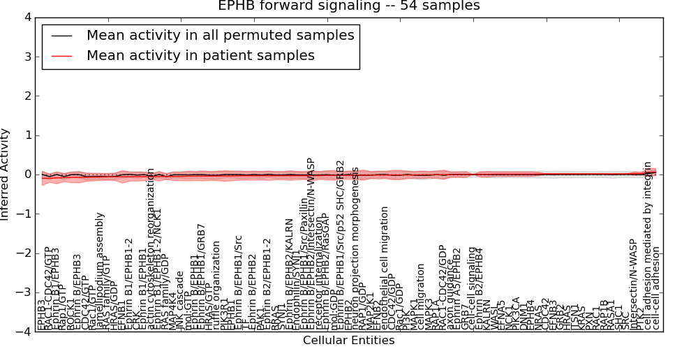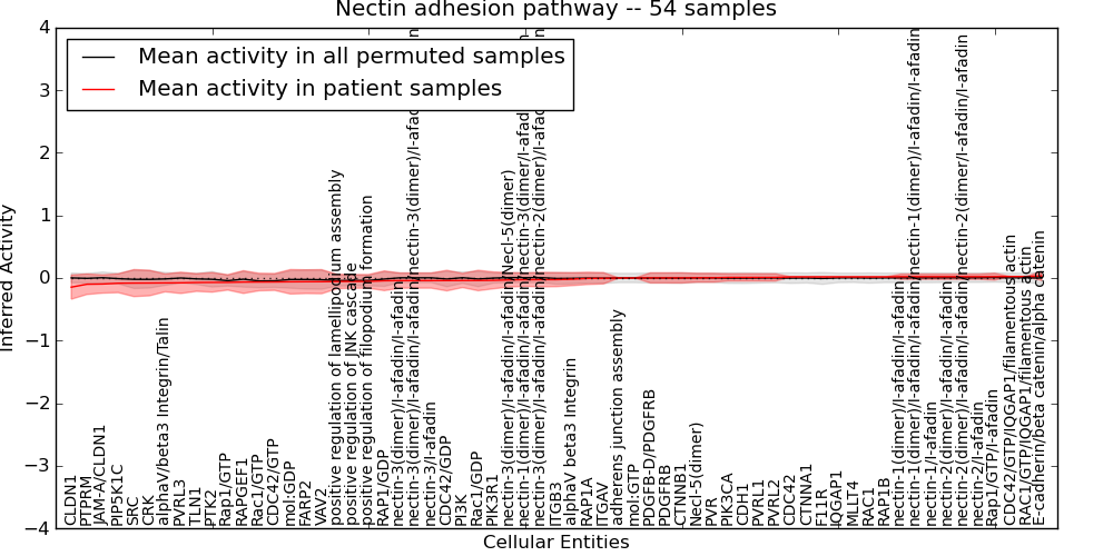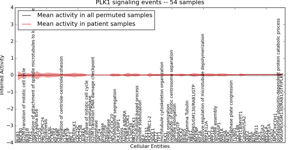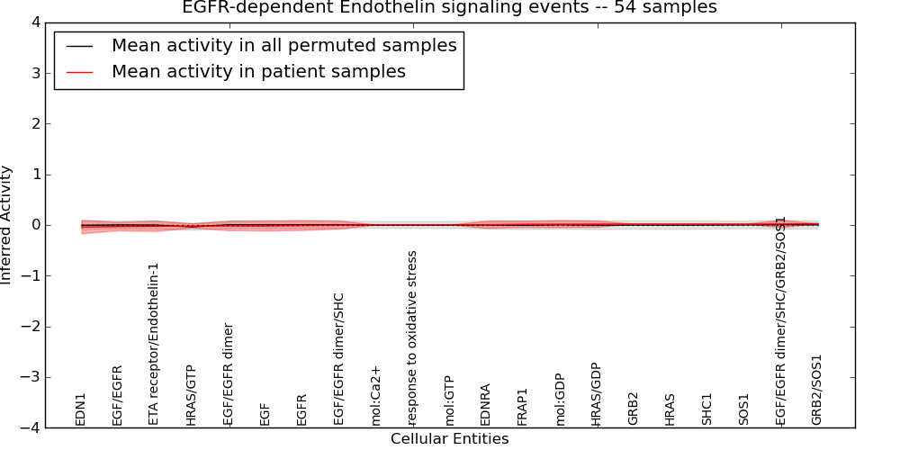 Figure S131. Get High-res Image This plot shows pathway concept perturbations across all samples against a permutation model. The concepts along the x-axis are sorted by lowest to highest mean activity for the real patient samples. Mean inferred activities are plotted along the y-axis as a colored band showing the average level and one standard deviation range. Real samples are shown in red and permuted samples in black.