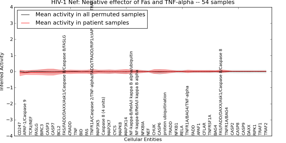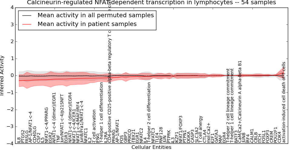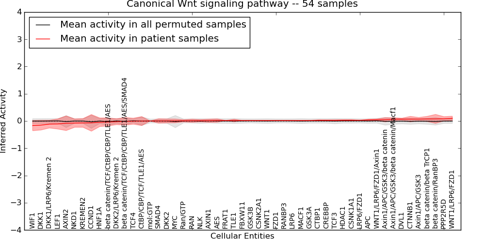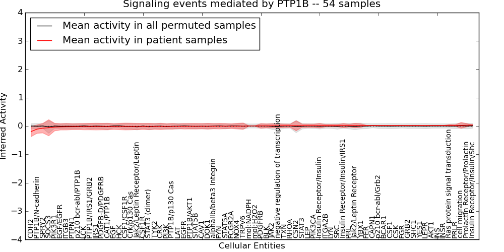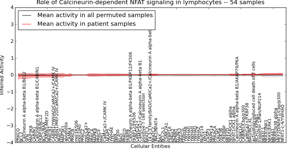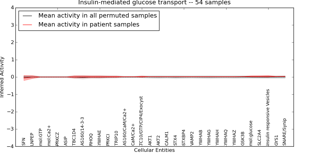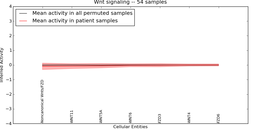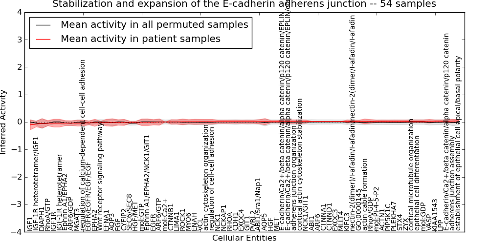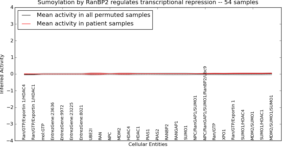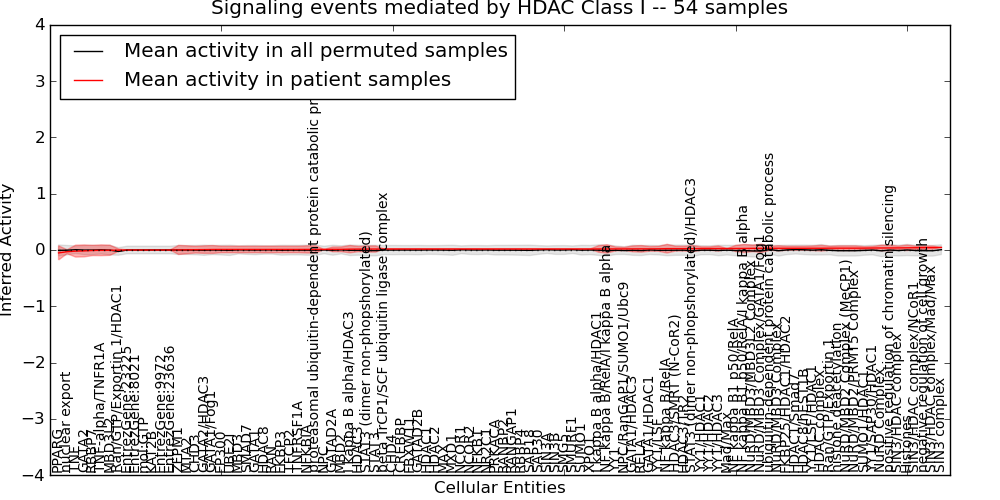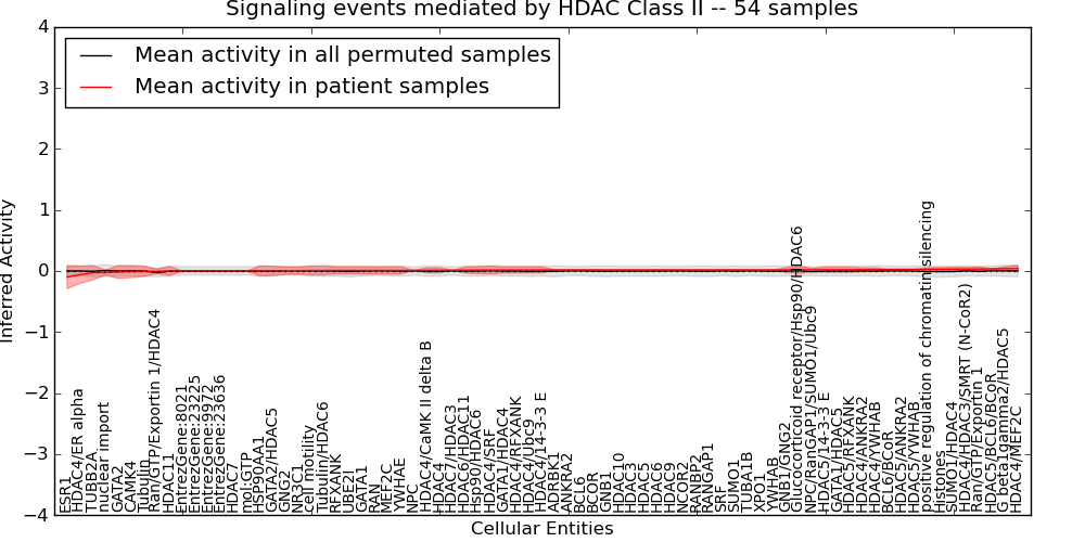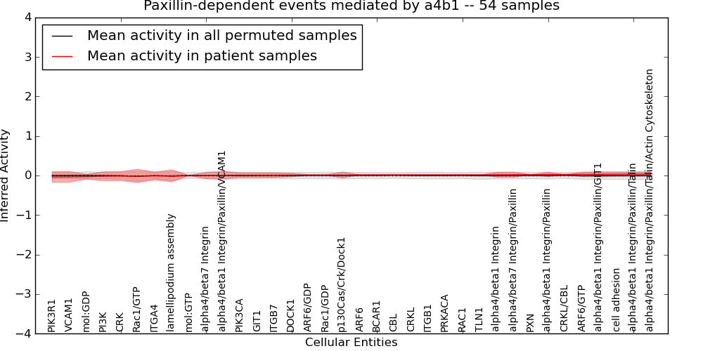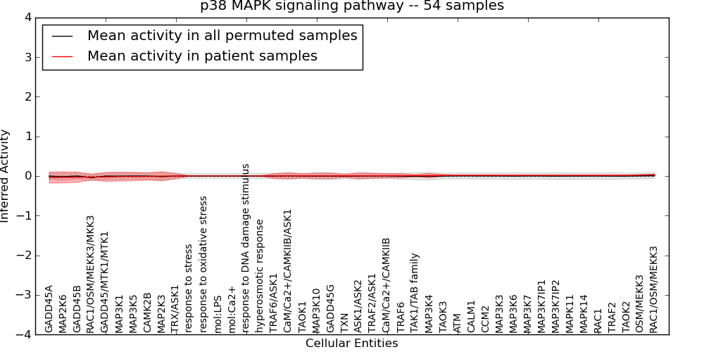 Figure S131. Get High-res Image This plot shows pathway concept perturbations across all samples against a permutation model. The concepts along the x-axis are sorted by lowest to highest mean activity for the real patient samples. Mean inferred activities are plotted along the y-axis as a colored band showing the average level and one standard deviation range. Real samples are shown in red and permuted samples in black.