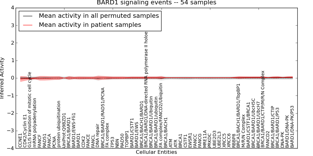 Figure S129. Get High-res Image This plot shows pathway concept perturbations across all samples against a permutation model. The concepts along the x-axis are sorted by lowest to highest mean activity for the real patient samples. Mean inferred activities are plotted along the y-axis as a colored band showing the average level and one standard deviation range. Real samples are shown in red and permuted samples in black.