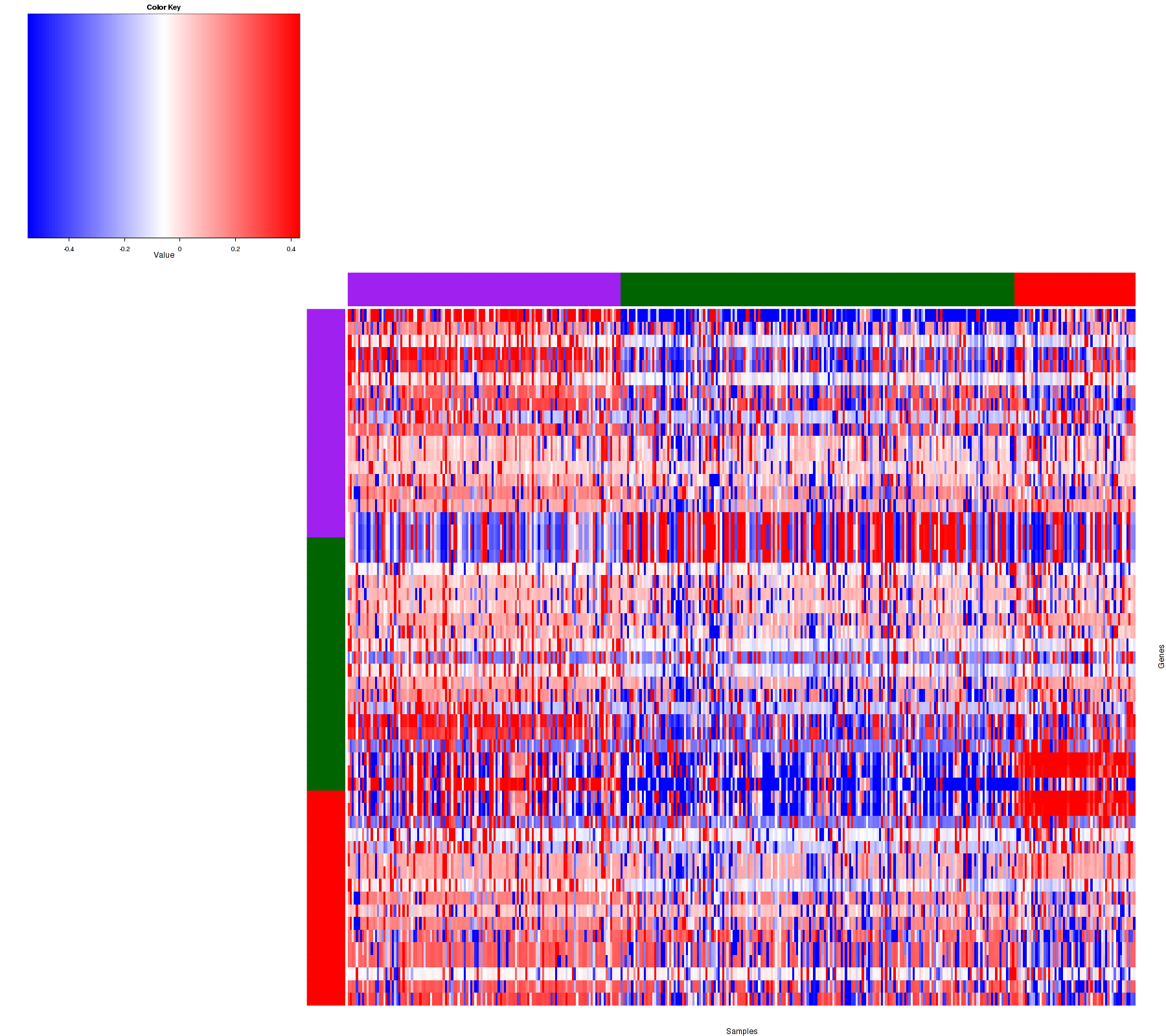 Figure 1. Get High-res Image Samples were separated into 3 clusters. Shown are 372 samples and 55 marker focal events. The color bar of the row indicates the marker focal events for the corresponding cluster.