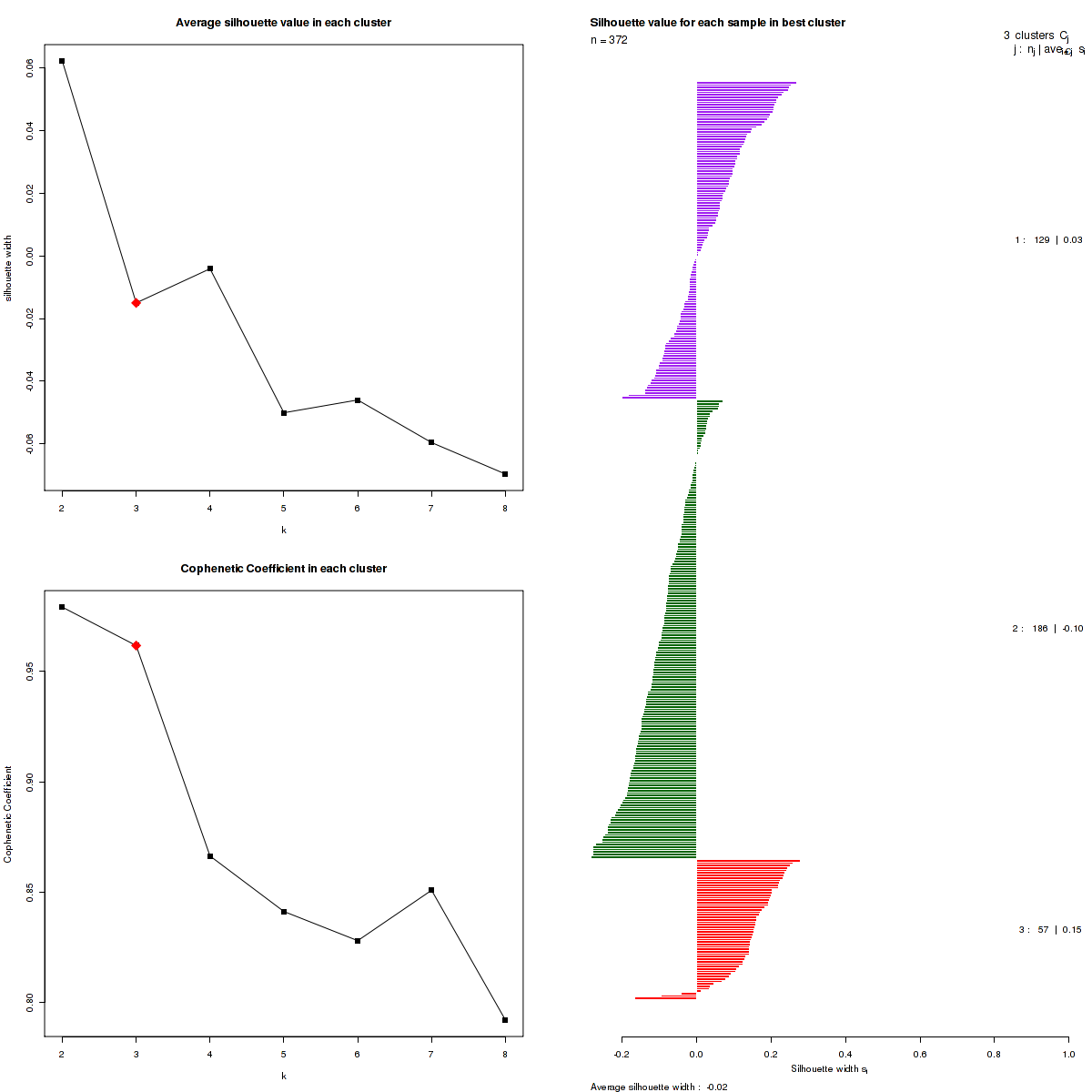 Figure 3. Get High-res Image The silhouette width was calculated for each sample and each value of k. The left panel shows the average silhouette width across all samples for each tested k (left panel). The right panels shows assignments of clusters to samples and the silhouette width of each sample for the most robust clustering.