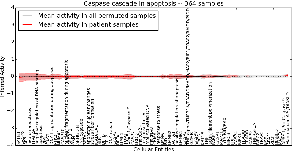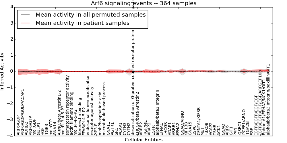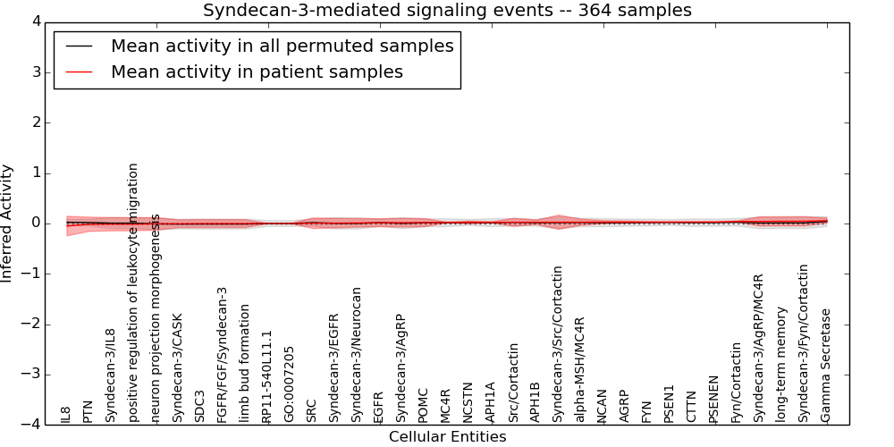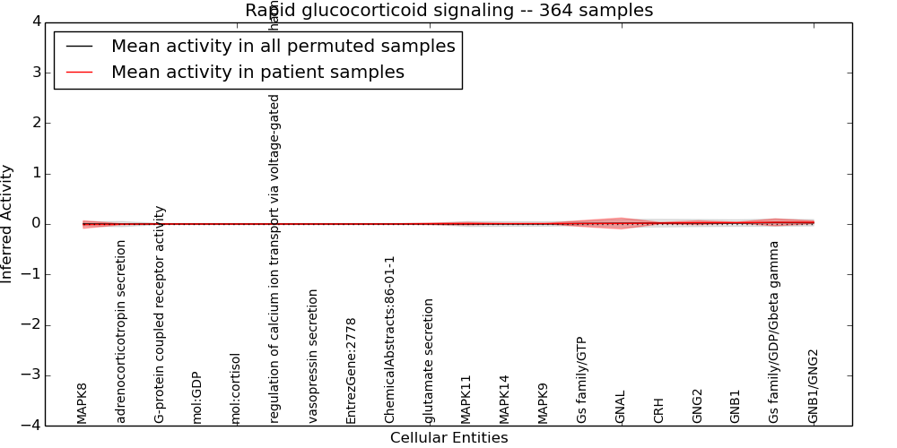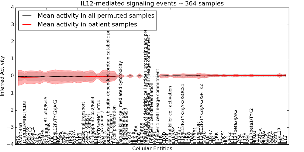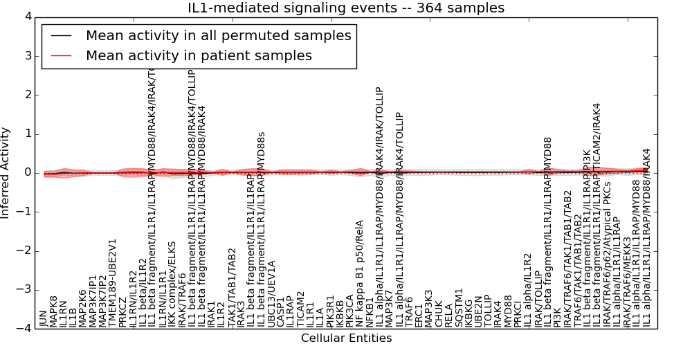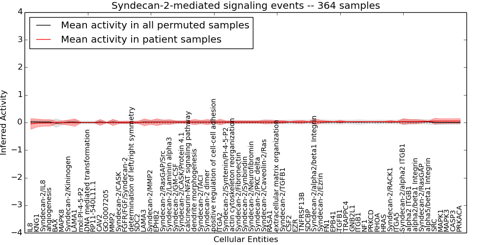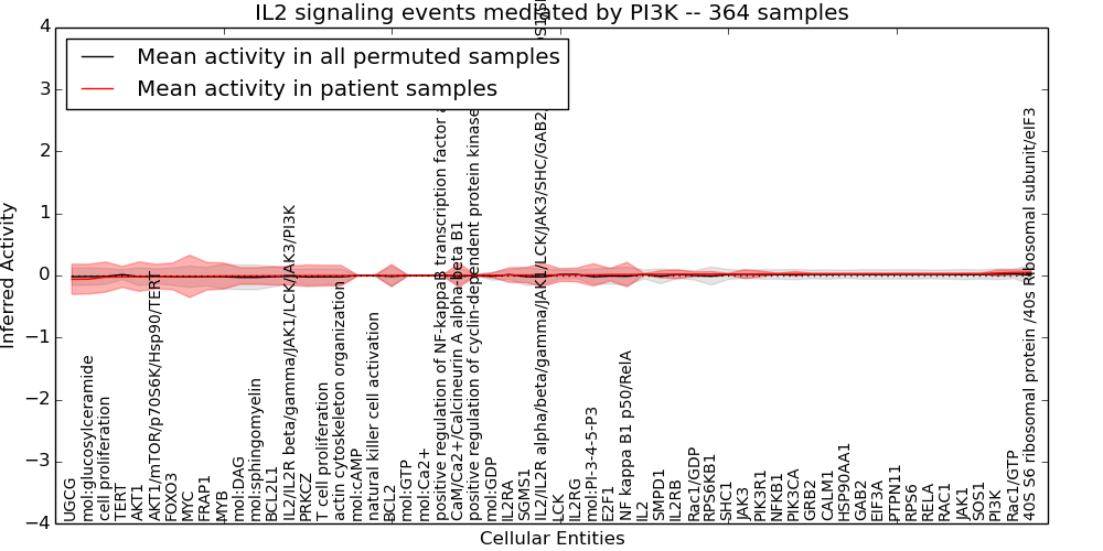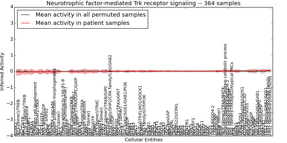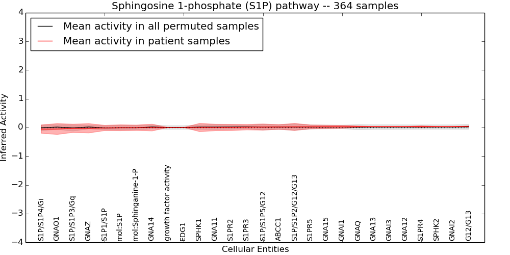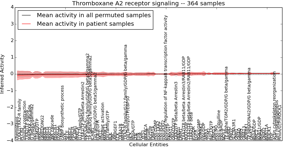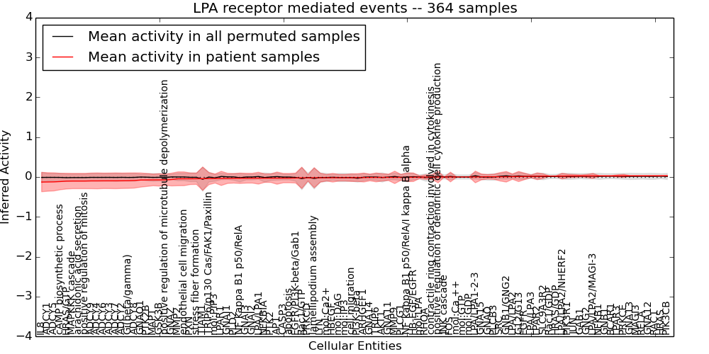 Figure S131. Get High-res Image This plot shows pathway concept perturbations across all samples against a permutation model. The concepts along the x-axis are sorted by lowest to highest mean activity for the real patient samples. Mean inferred activities are plotted along the y-axis as a colored band showing the average level and one standard deviation range. Real samples are shown in red and permuted samples in black.