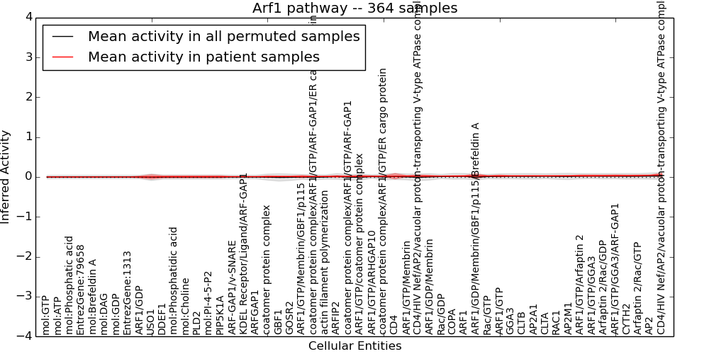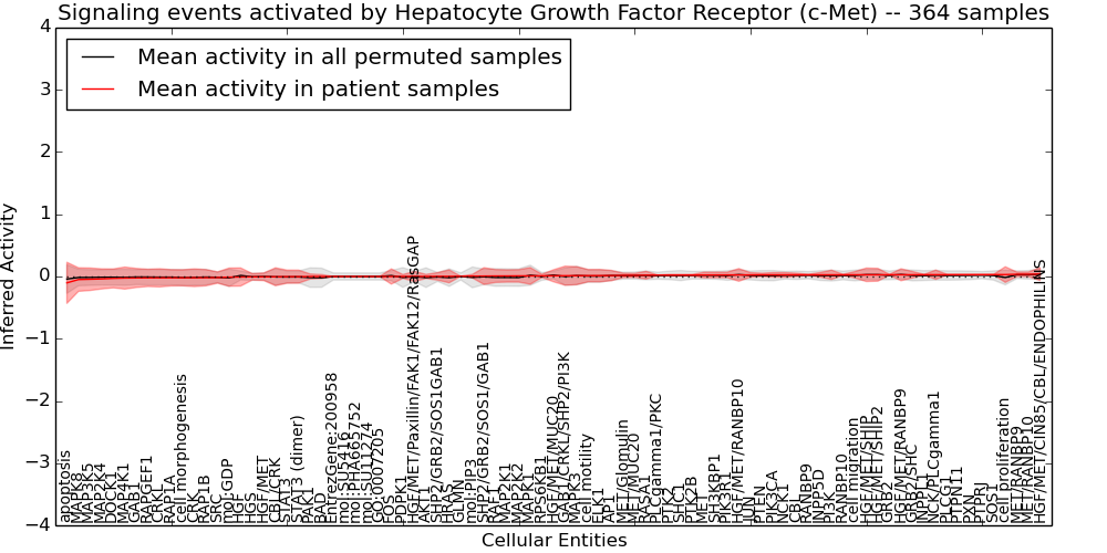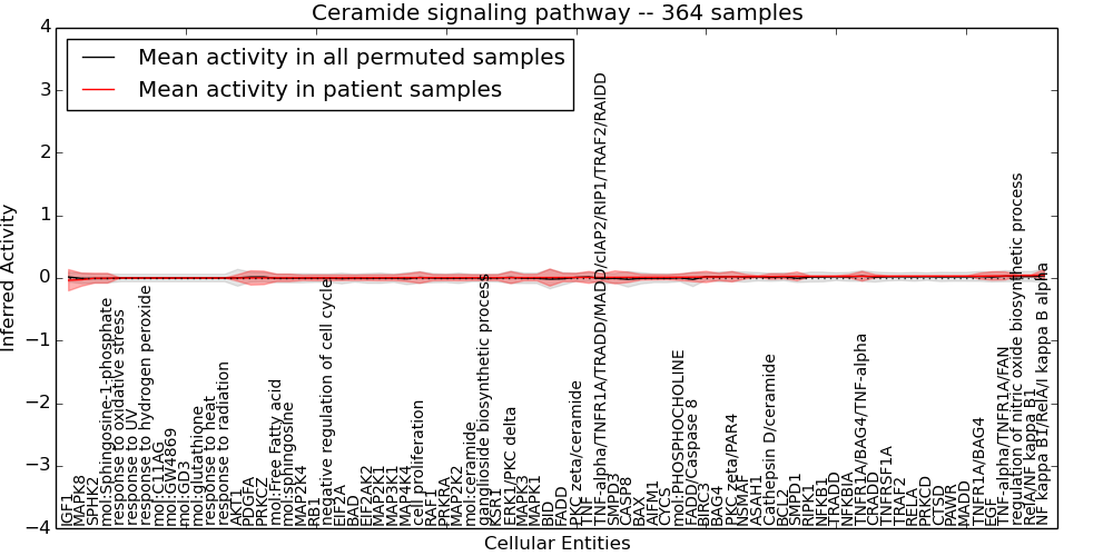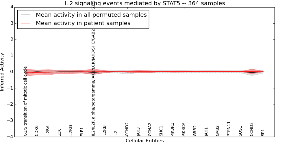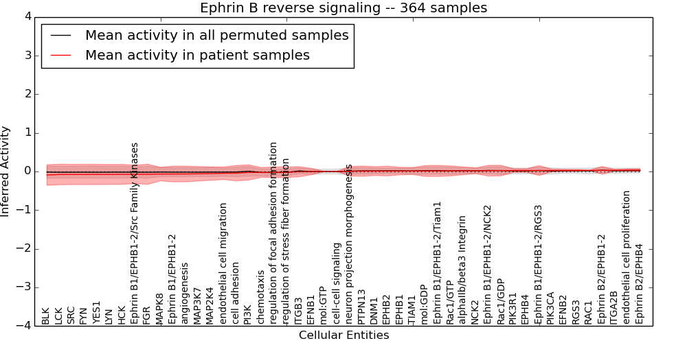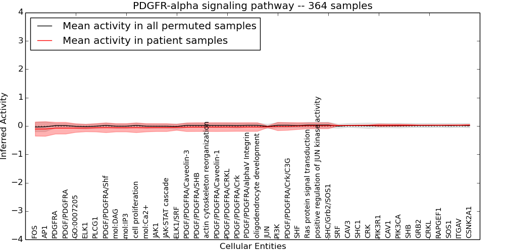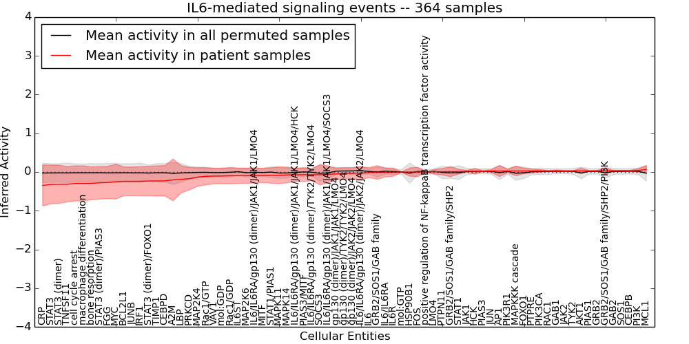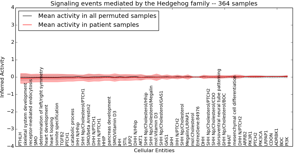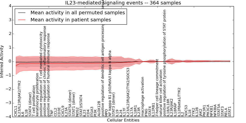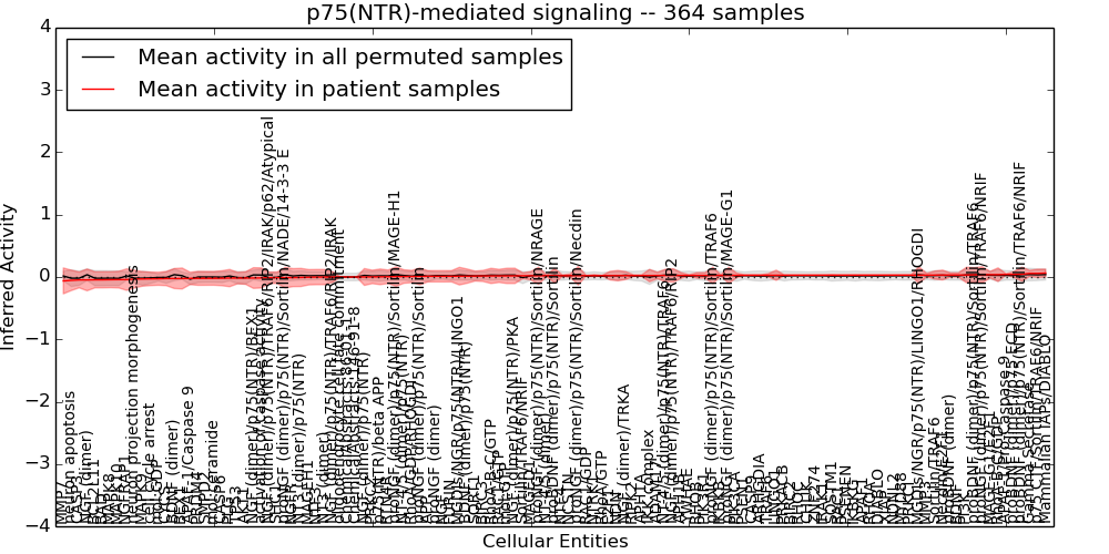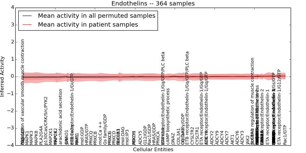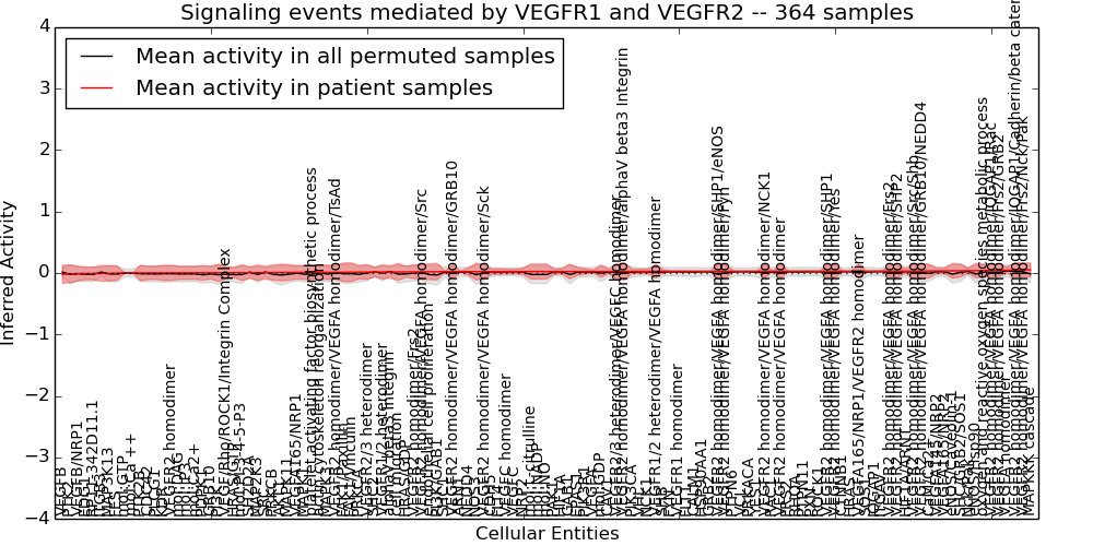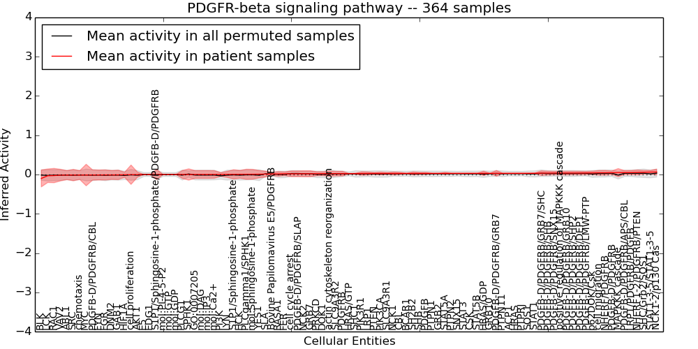Figure S131. Get High-res Image This plot shows pathway concept perturbations across all samples against a permutation model. The concepts along the x-axis are sorted by lowest to highest mean activity for the real patient samples. Mean inferred activities are plotted along the y-axis as a colored band showing the average level and one standard deviation range. Real samples are shown in red and permuted samples in black.