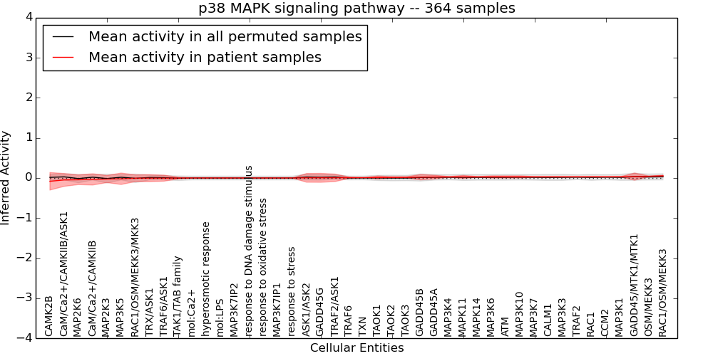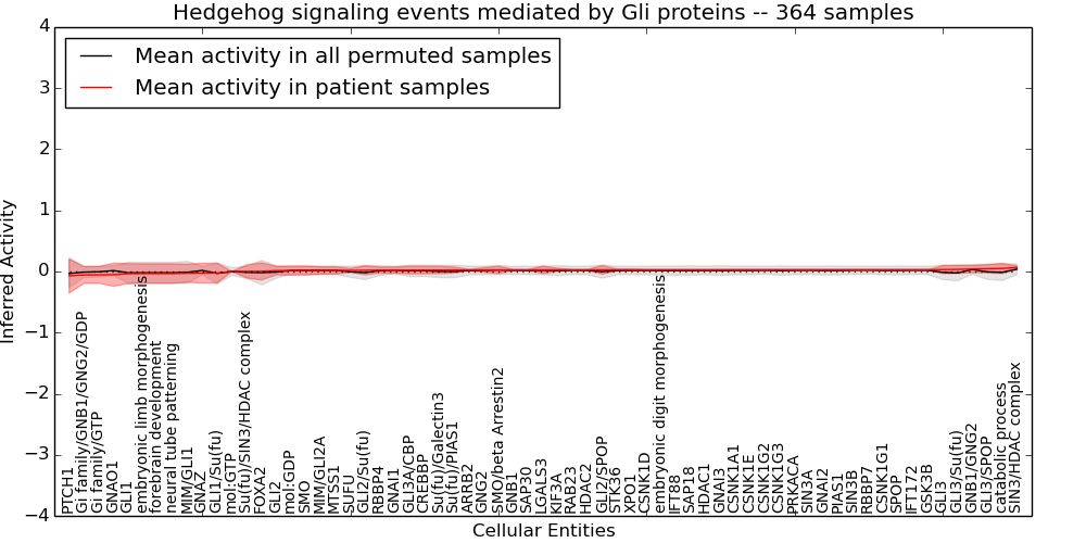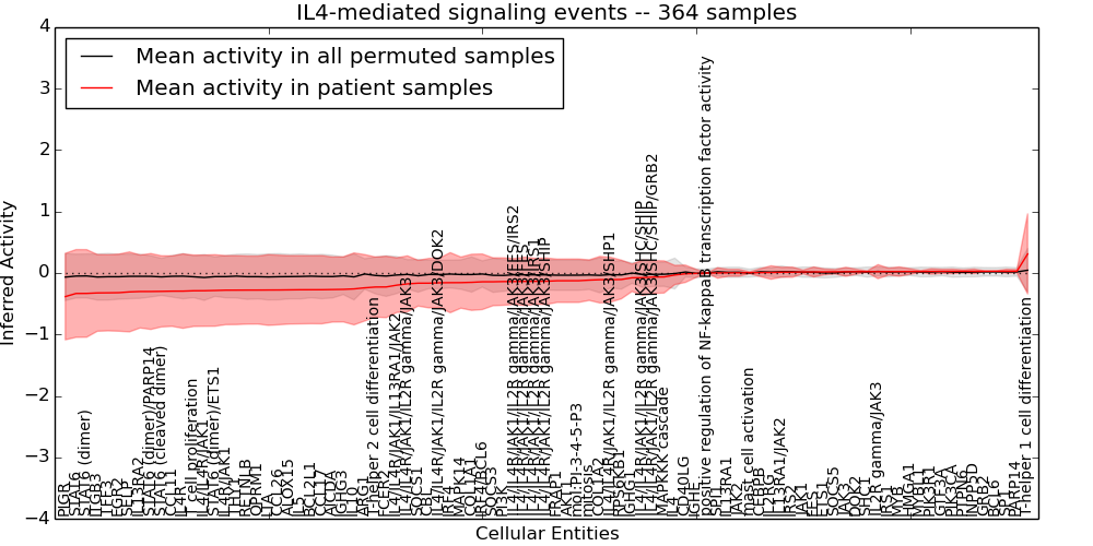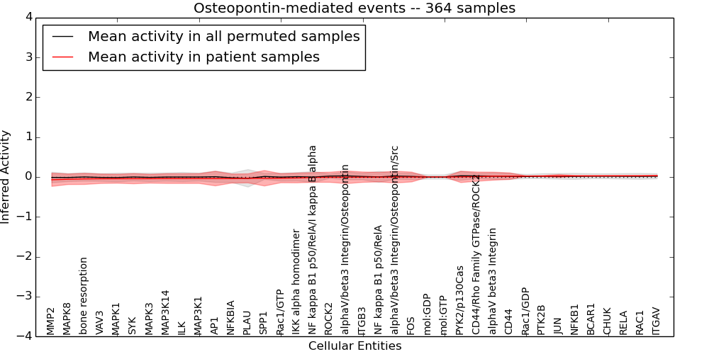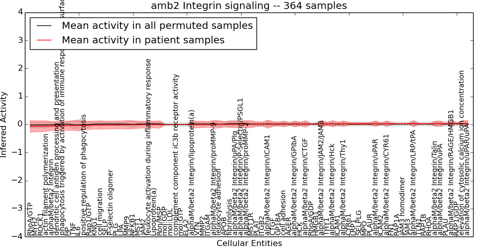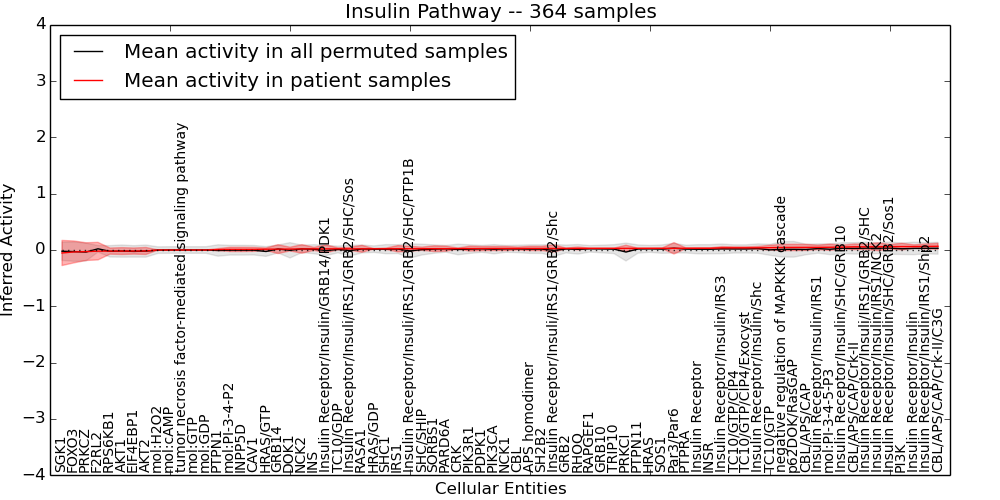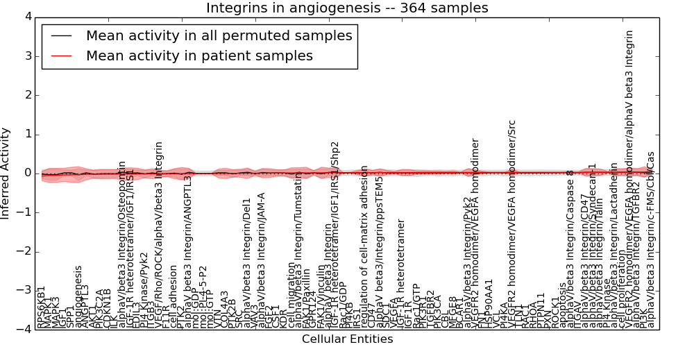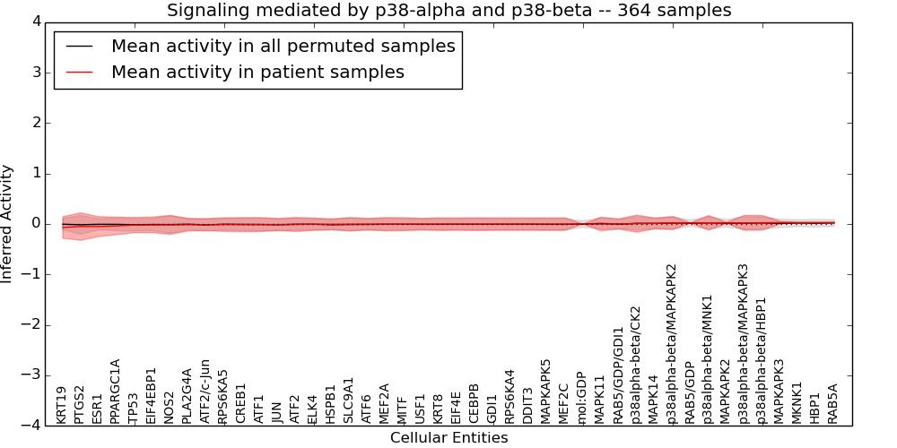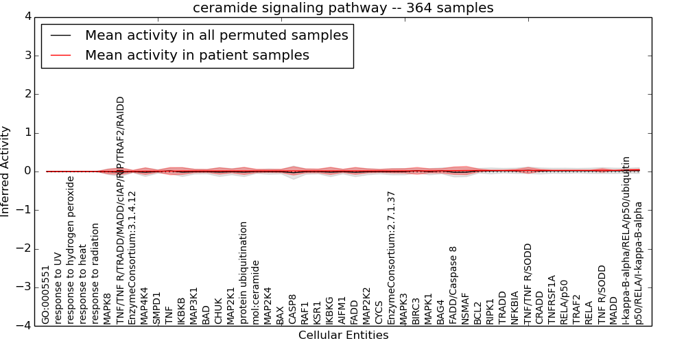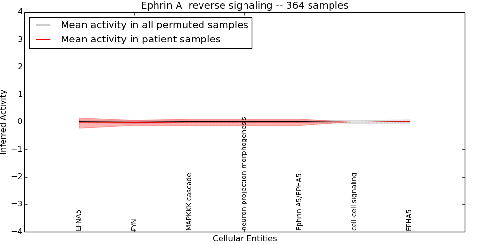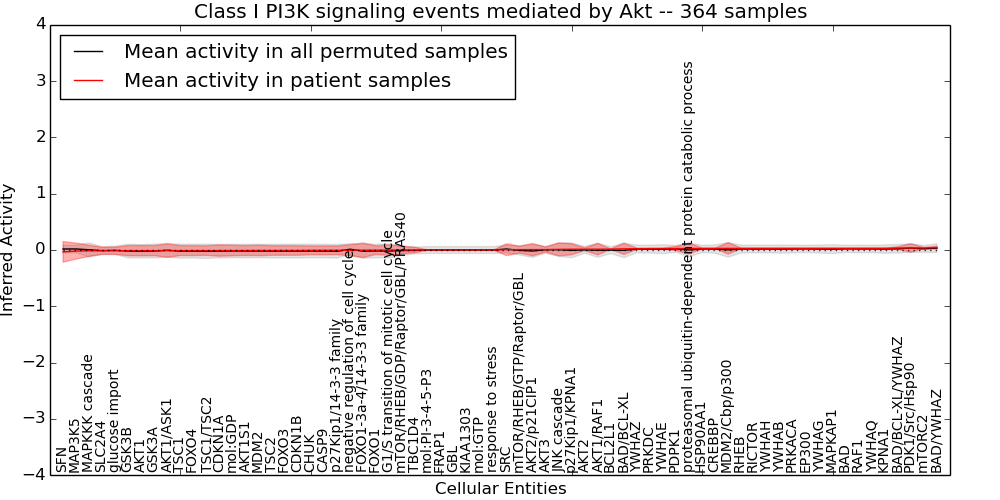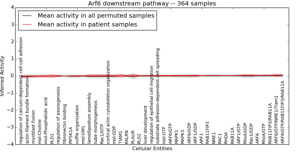 Figure S131. Get High-res Image This plot shows pathway concept perturbations across all samples against a permutation model. The concepts along the x-axis are sorted by lowest to highest mean activity for the real patient samples. Mean inferred activities are plotted along the y-axis as a colored band showing the average level and one standard deviation range. Real samples are shown in red and permuted samples in black.
