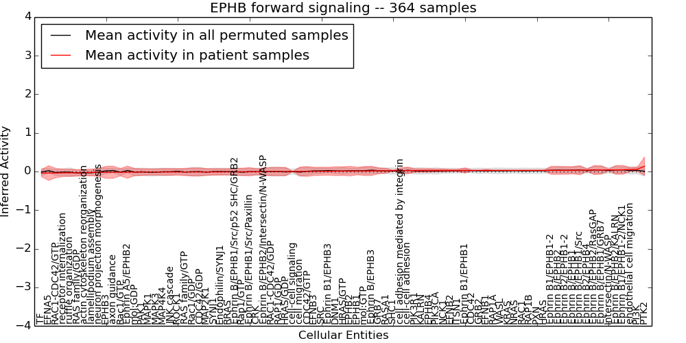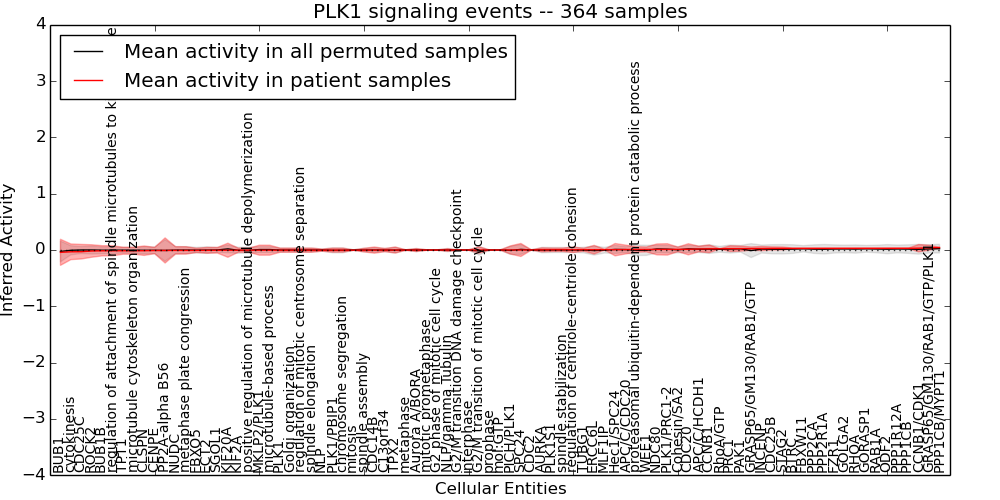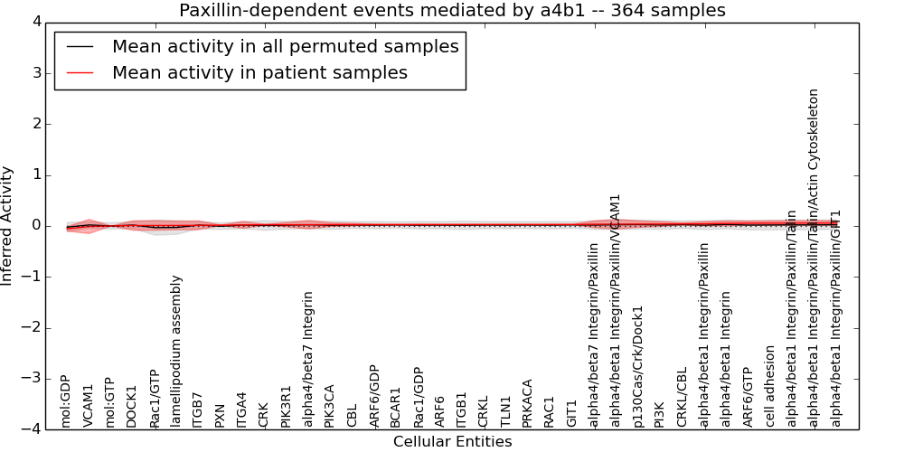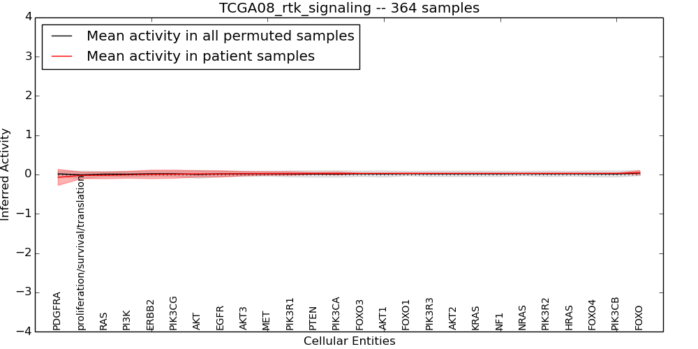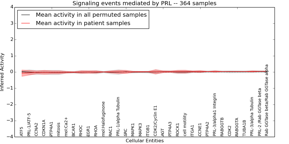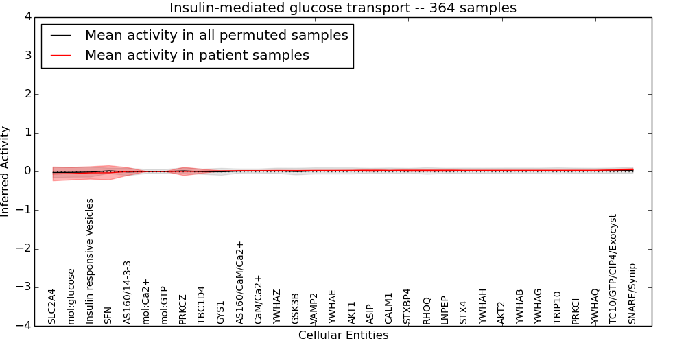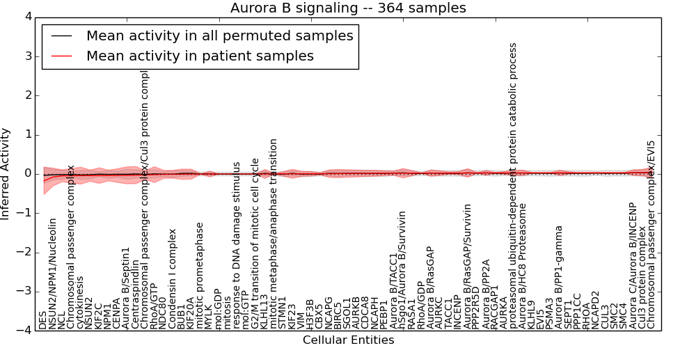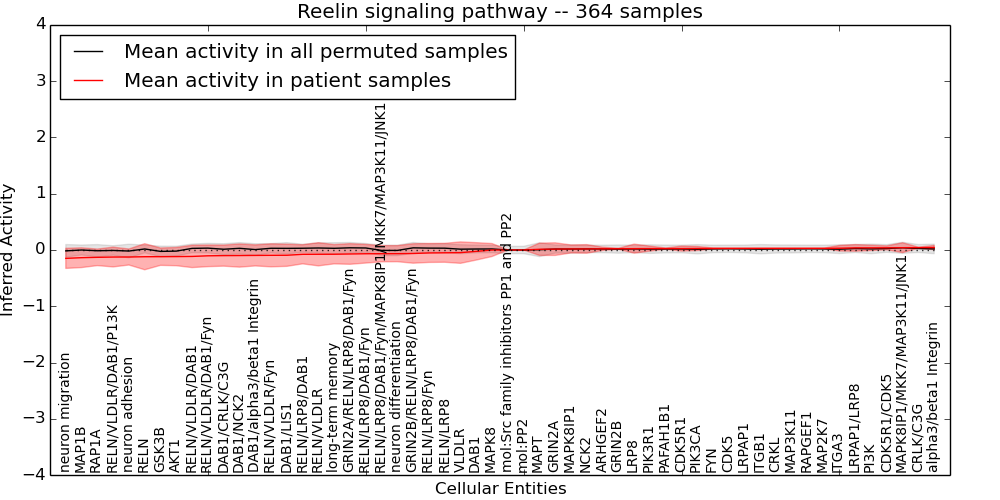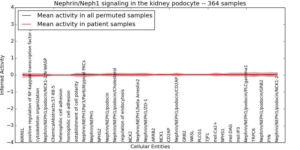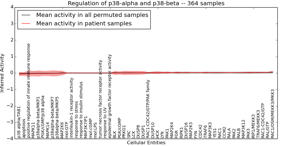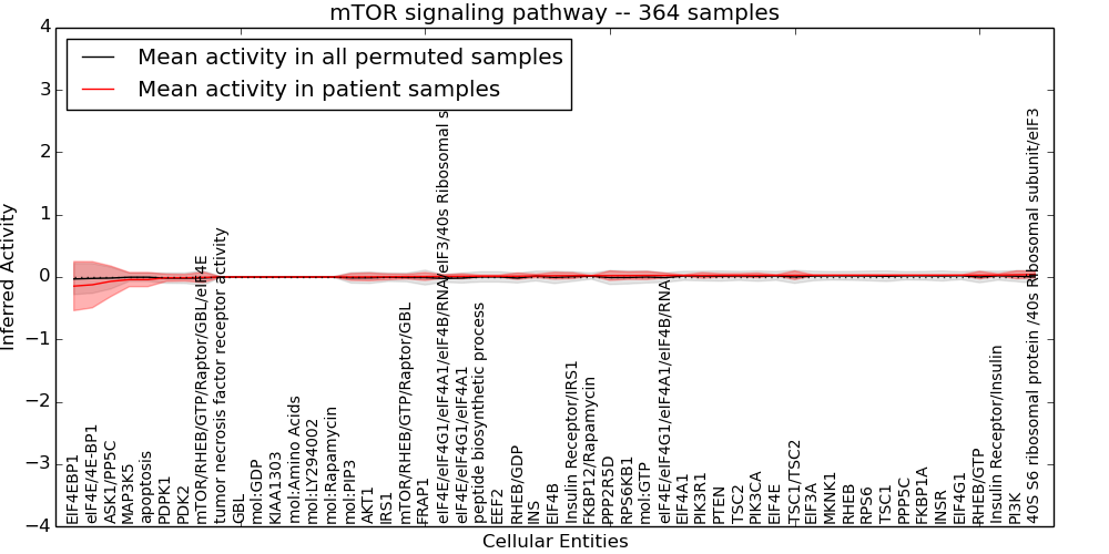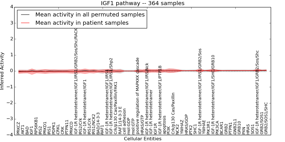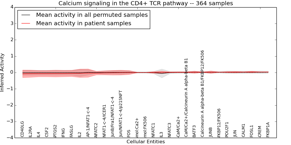 Figure S131. Get High-res Image This plot shows pathway concept perturbations across all samples against a permutation model. The concepts along the x-axis are sorted by lowest to highest mean activity for the real patient samples. Mean inferred activities are plotted along the y-axis as a colored band showing the average level and one standard deviation range. Real samples are shown in red and permuted samples in black.
