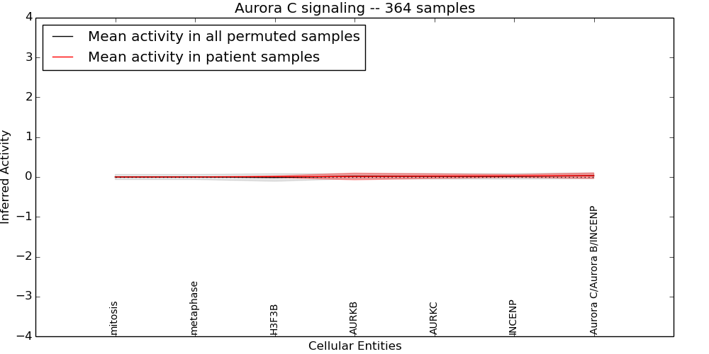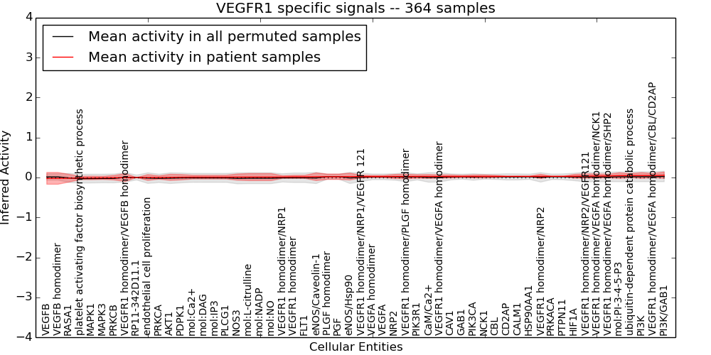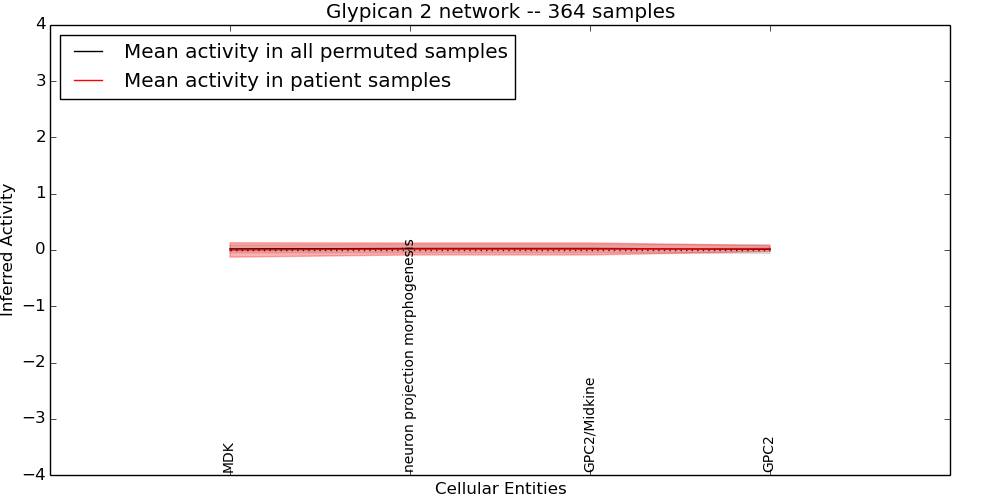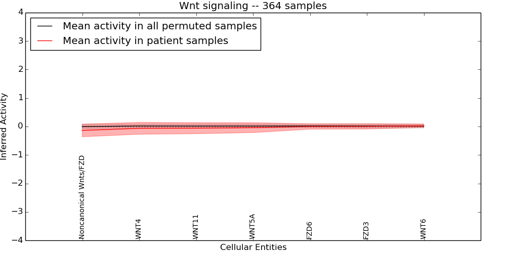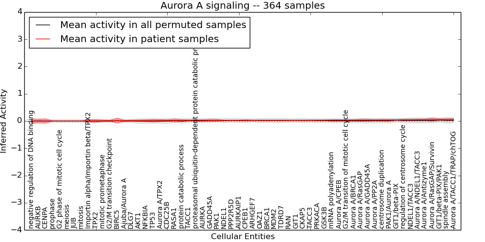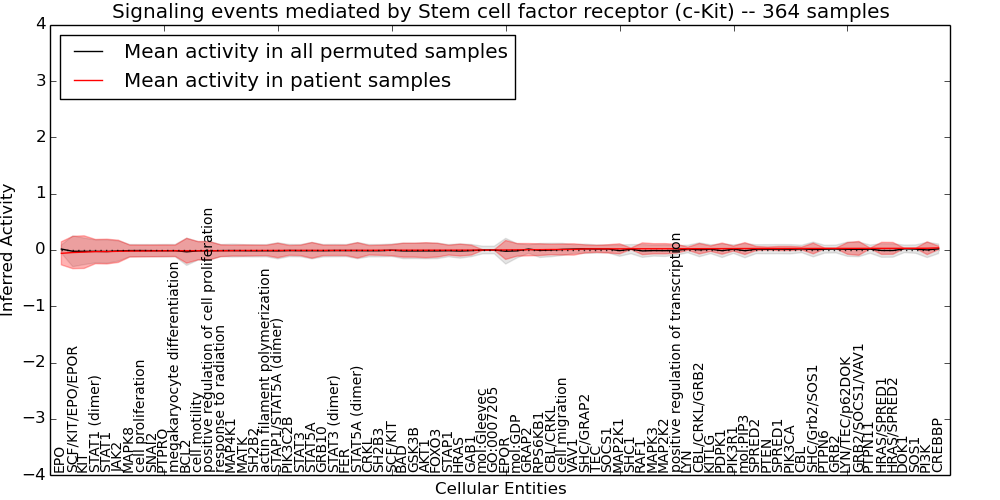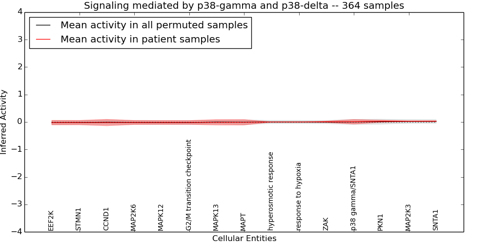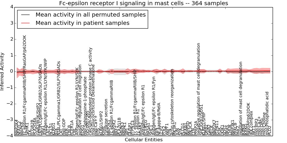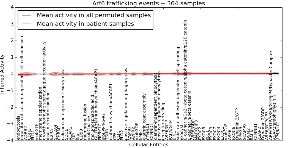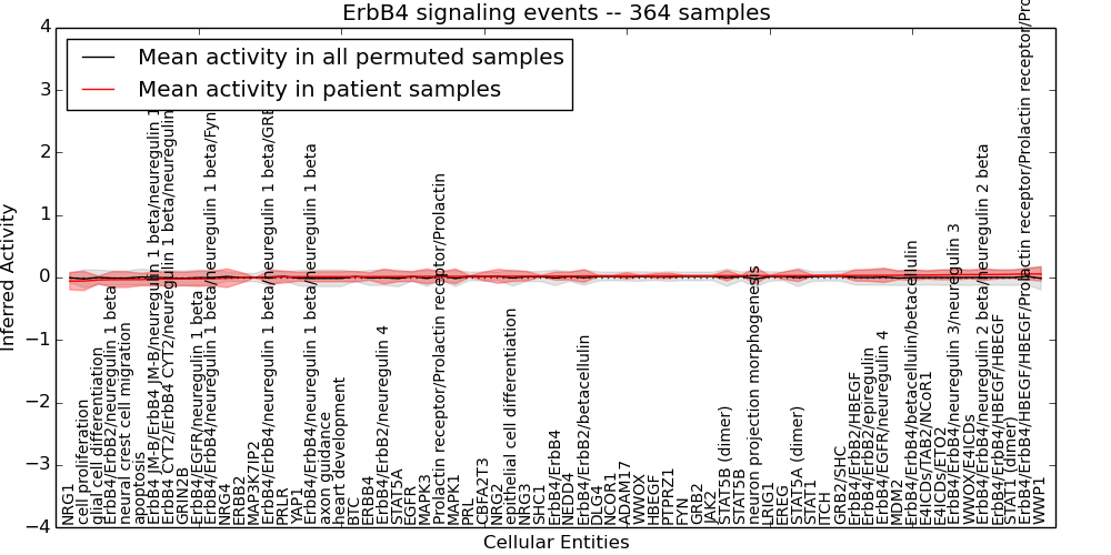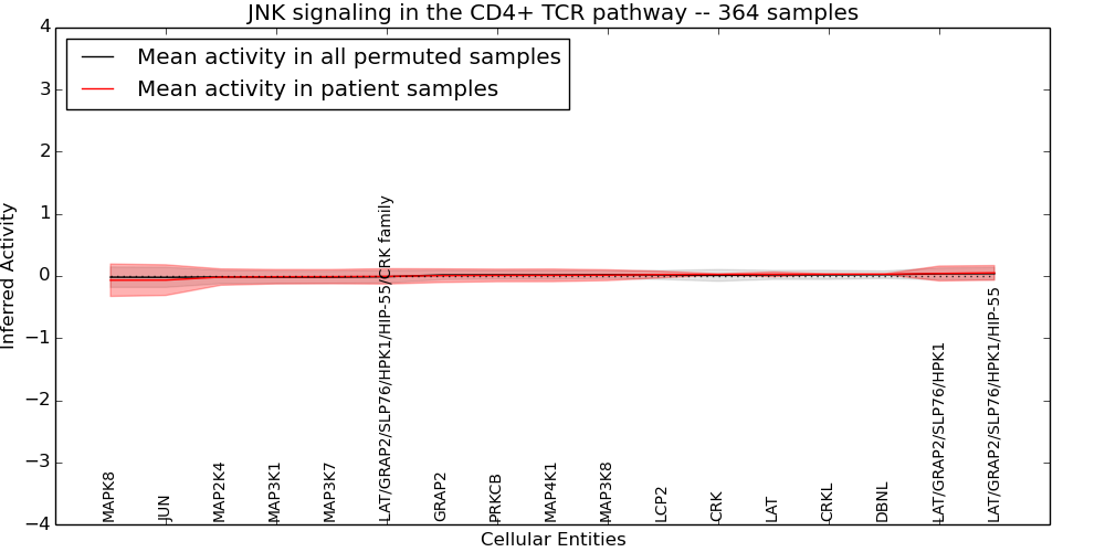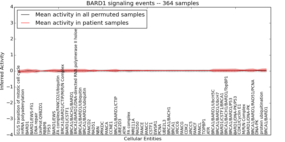 Figure S131. Get High-res Image This plot shows pathway concept perturbations across all samples against a permutation model. The concepts along the x-axis are sorted by lowest to highest mean activity for the real patient samples. Mean inferred activities are plotted along the y-axis as a colored band showing the average level and one standard deviation range. Real samples are shown in red and permuted samples in black.