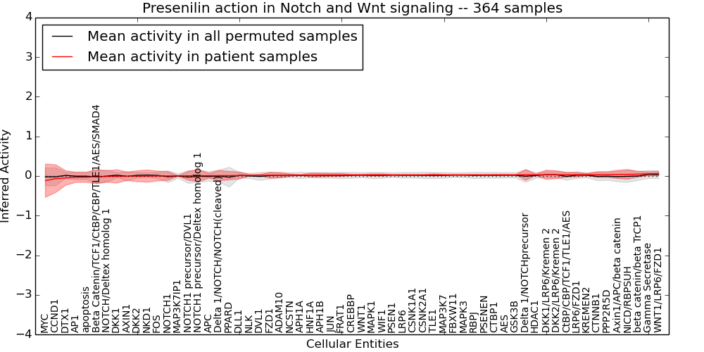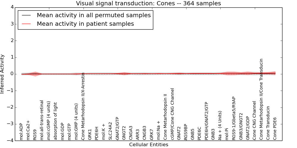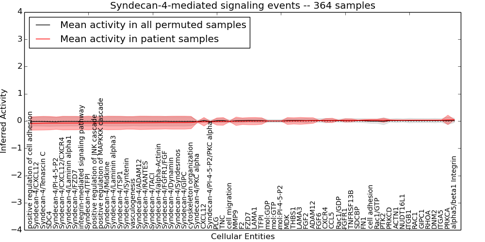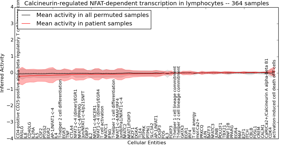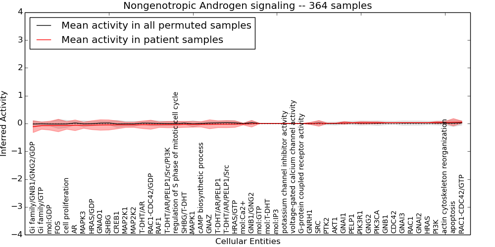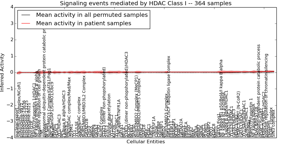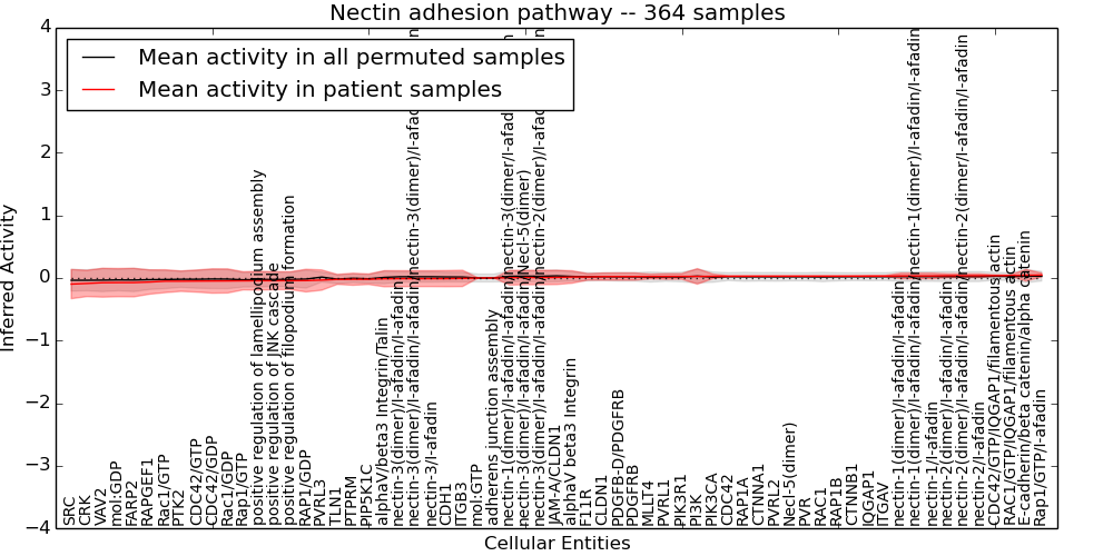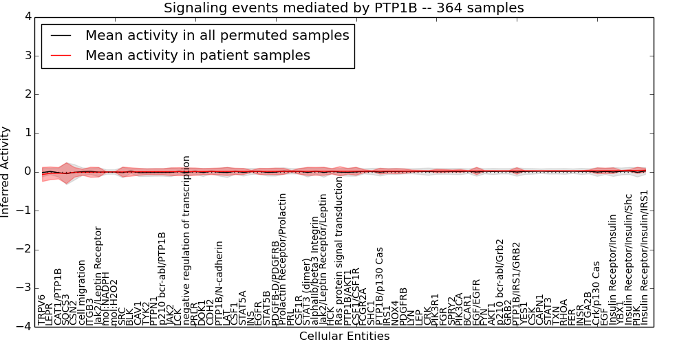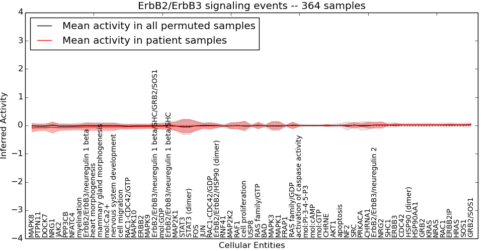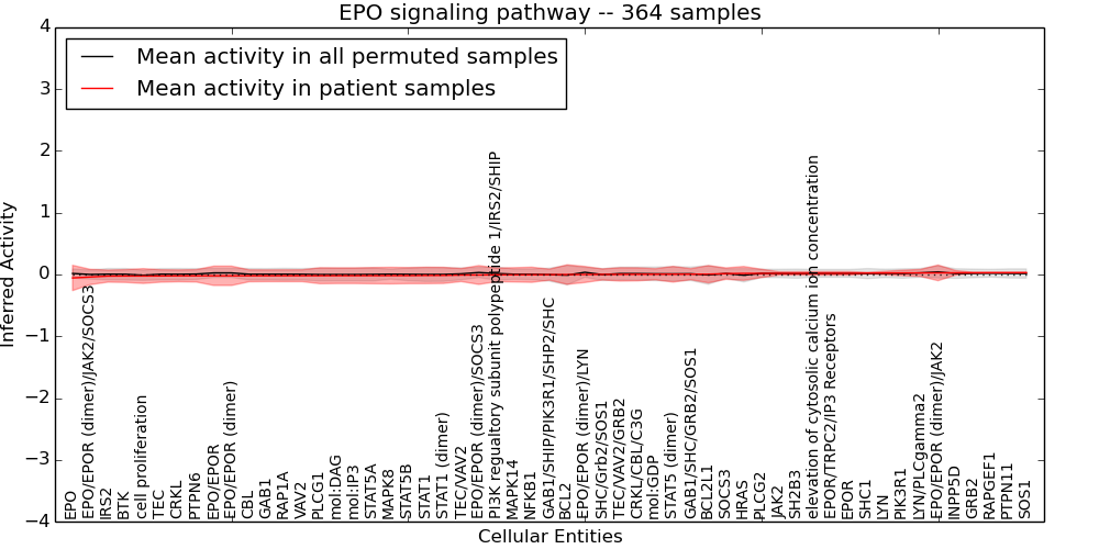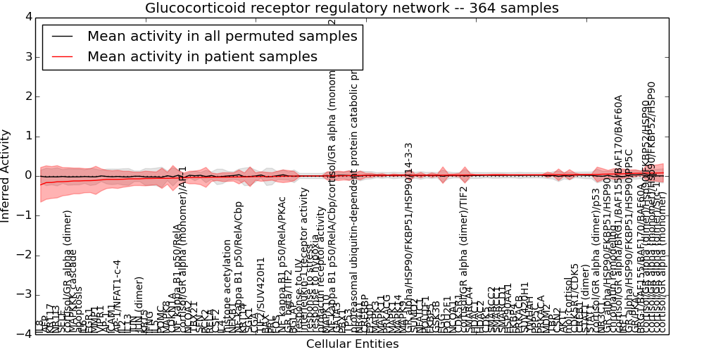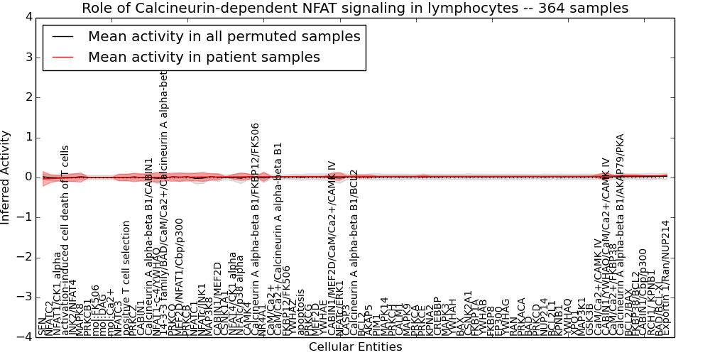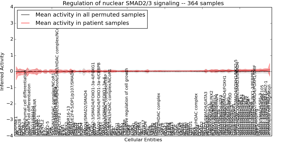 Figure S131. Get High-res Image This plot shows pathway concept perturbations across all samples against a permutation model. The concepts along the x-axis are sorted by lowest to highest mean activity for the real patient samples. Mean inferred activities are plotted along the y-axis as a colored band showing the average level and one standard deviation range. Real samples are shown in red and permuted samples in black.