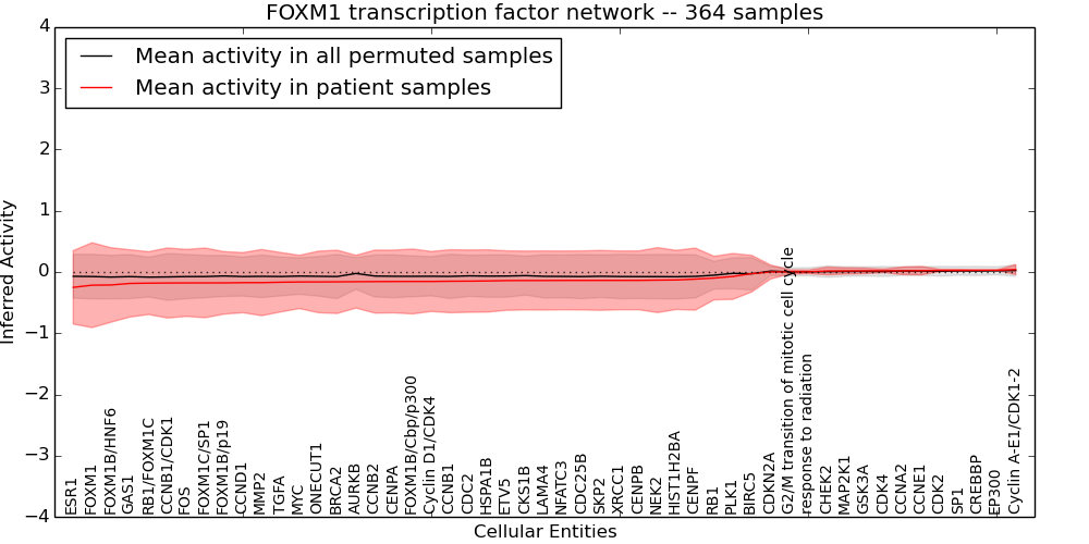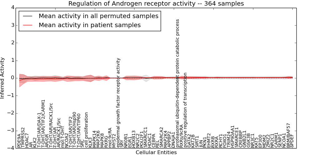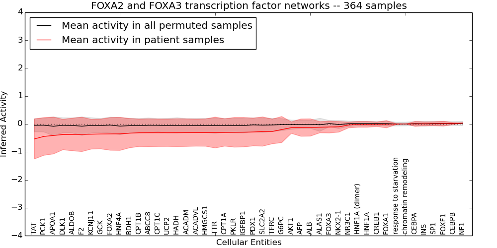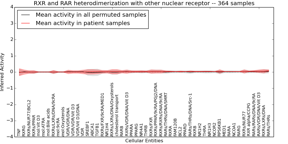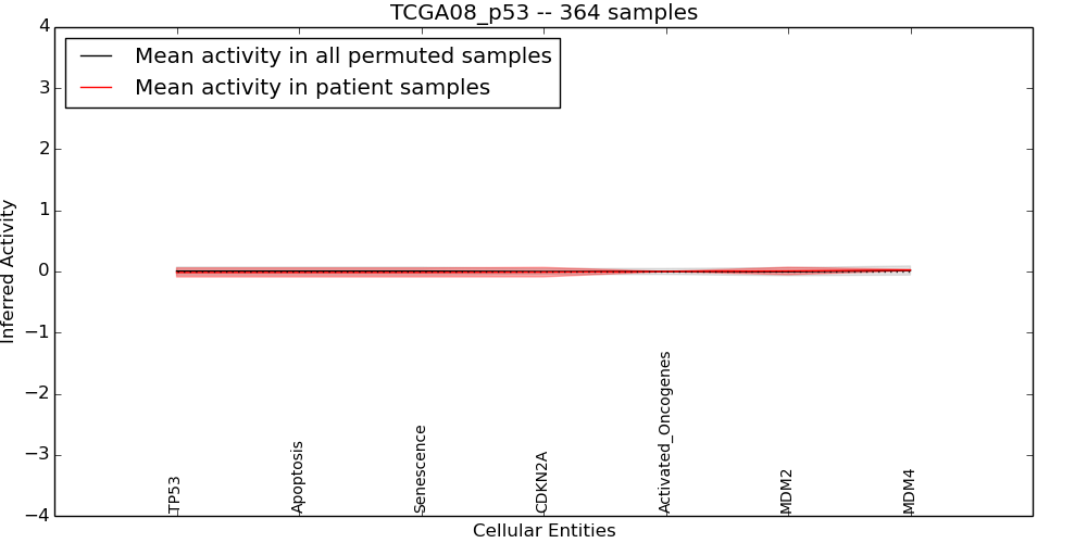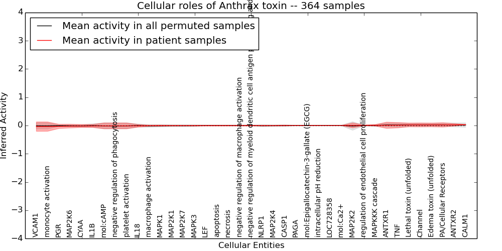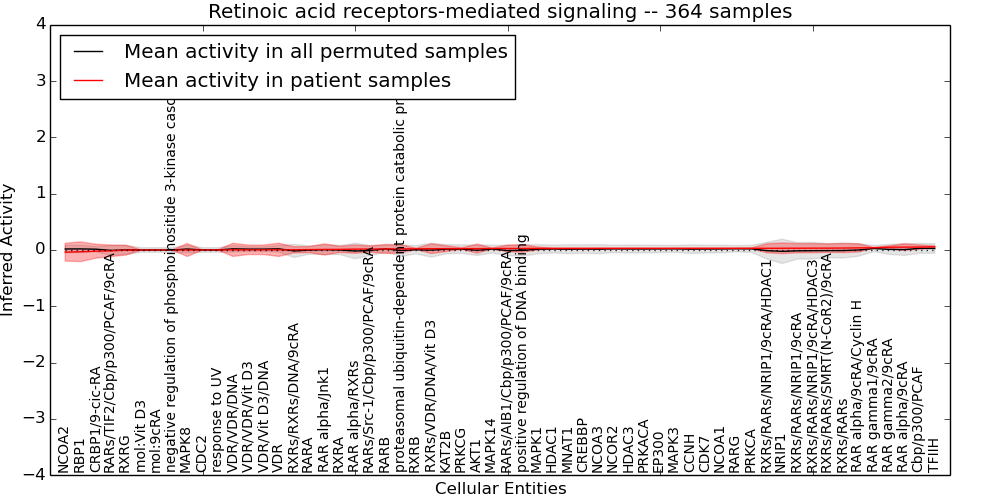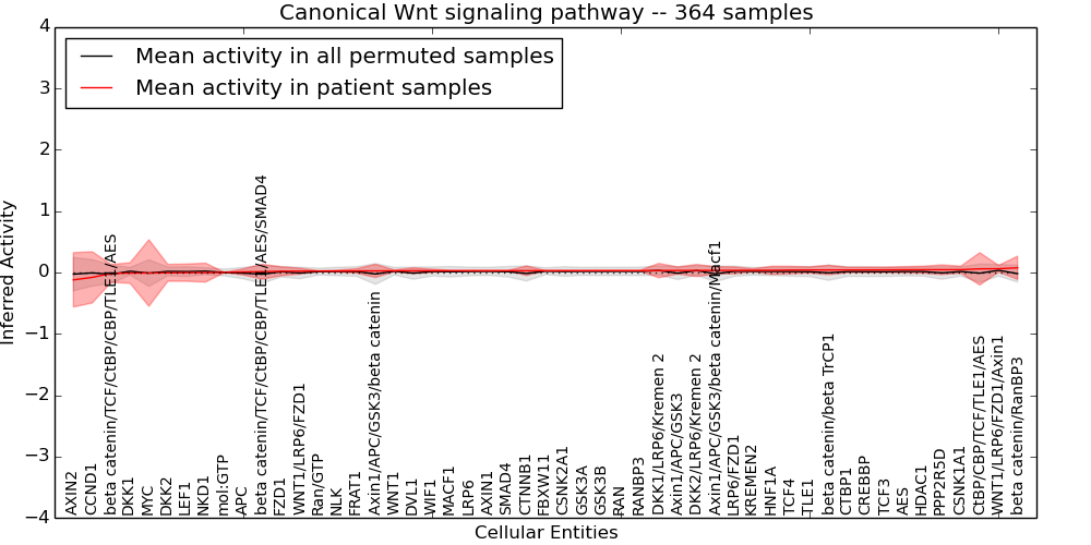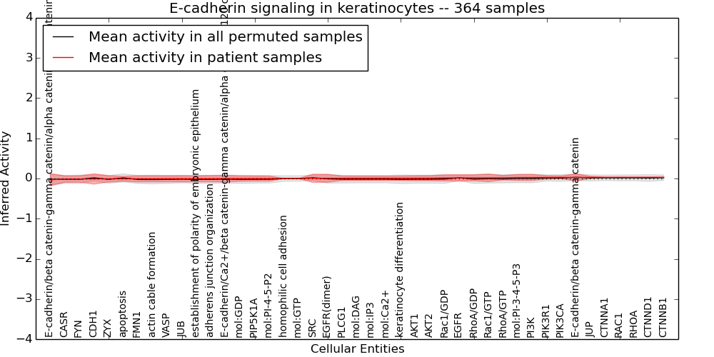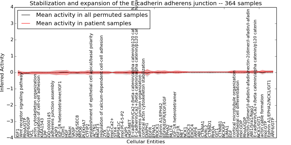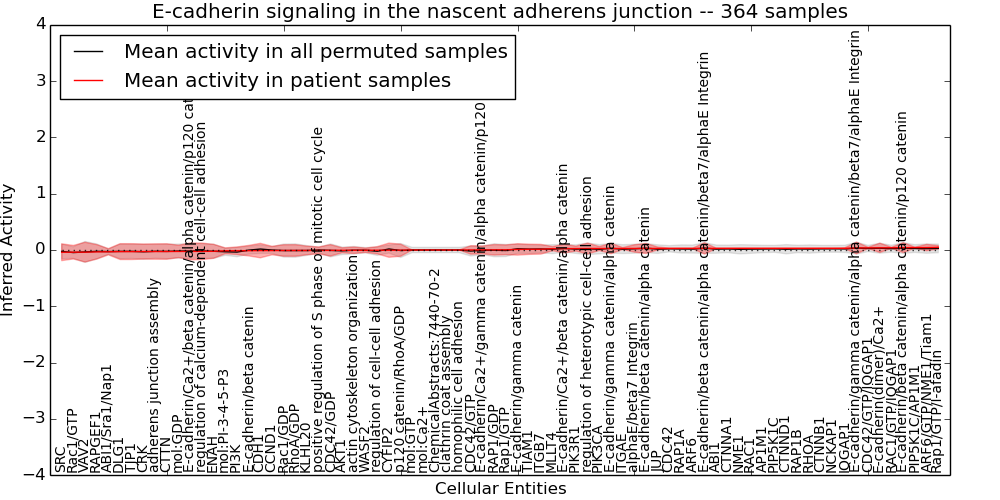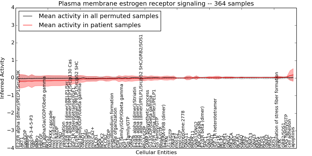 Figure S131. Get High-res Image This plot shows pathway concept perturbations across all samples against a permutation model. The concepts along the x-axis are sorted by lowest to highest mean activity for the real patient samples. Mean inferred activities are plotted along the y-axis as a colored band showing the average level and one standard deviation range. Real samples are shown in red and permuted samples in black.