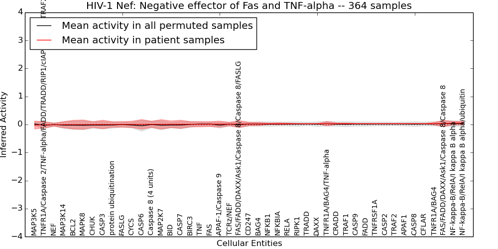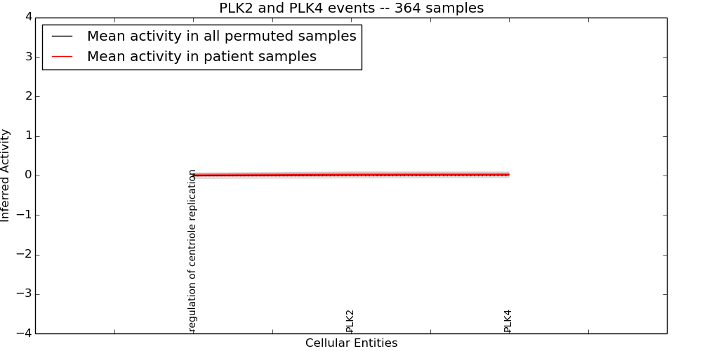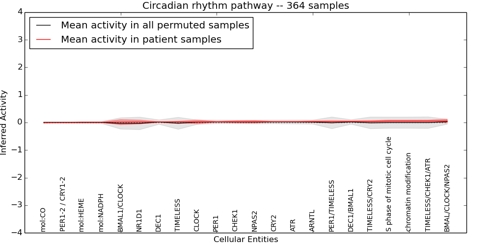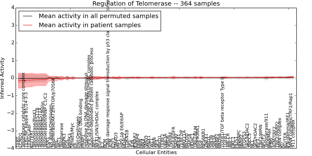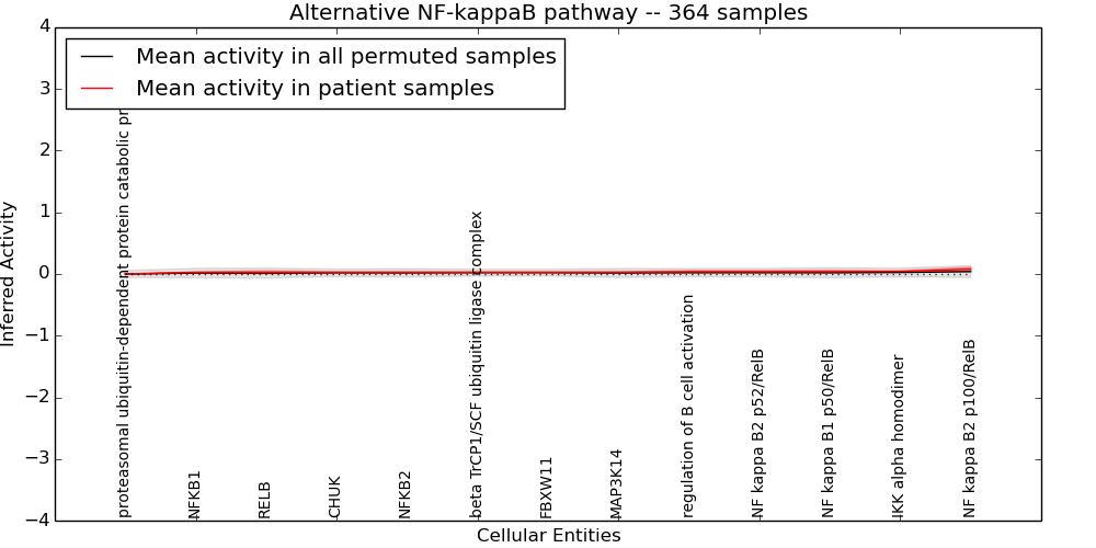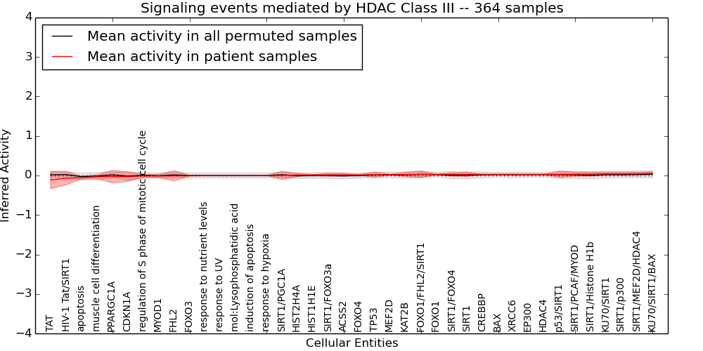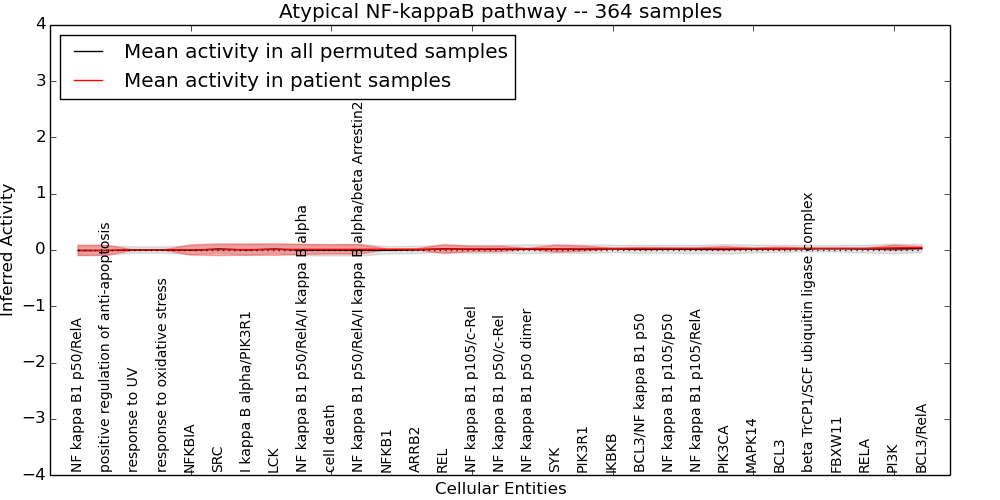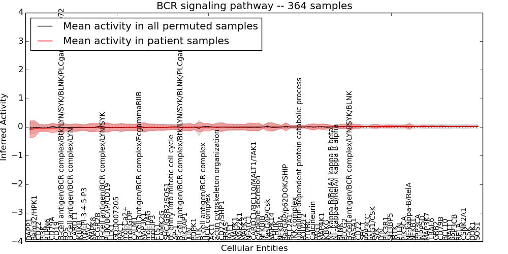 Figure S130. Get High-res Image This plot shows pathway concept perturbations across all samples against a permutation model. The concepts along the x-axis are sorted by lowest to highest mean activity for the real patient samples. Mean inferred activities are plotted along the y-axis as a colored band showing the average level and one standard deviation range. Real samples are shown in red and permuted samples in black.