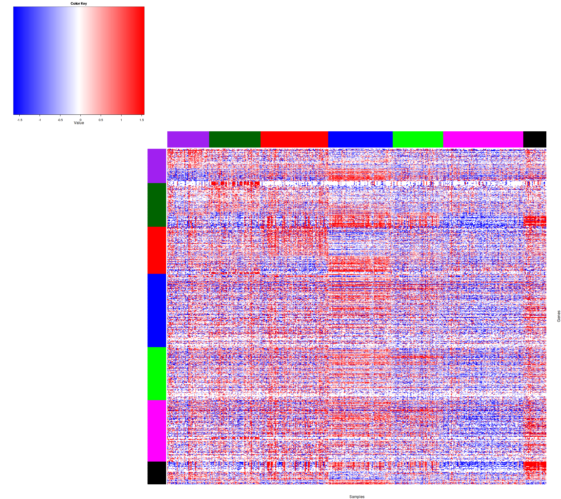 Figure 1. Get High-res Image Samples were separated into 7 clusters. Shown are 398 samples and 2038 marker miRs. The color bar of the row indicates the marker miRs for the corresponding cluster.