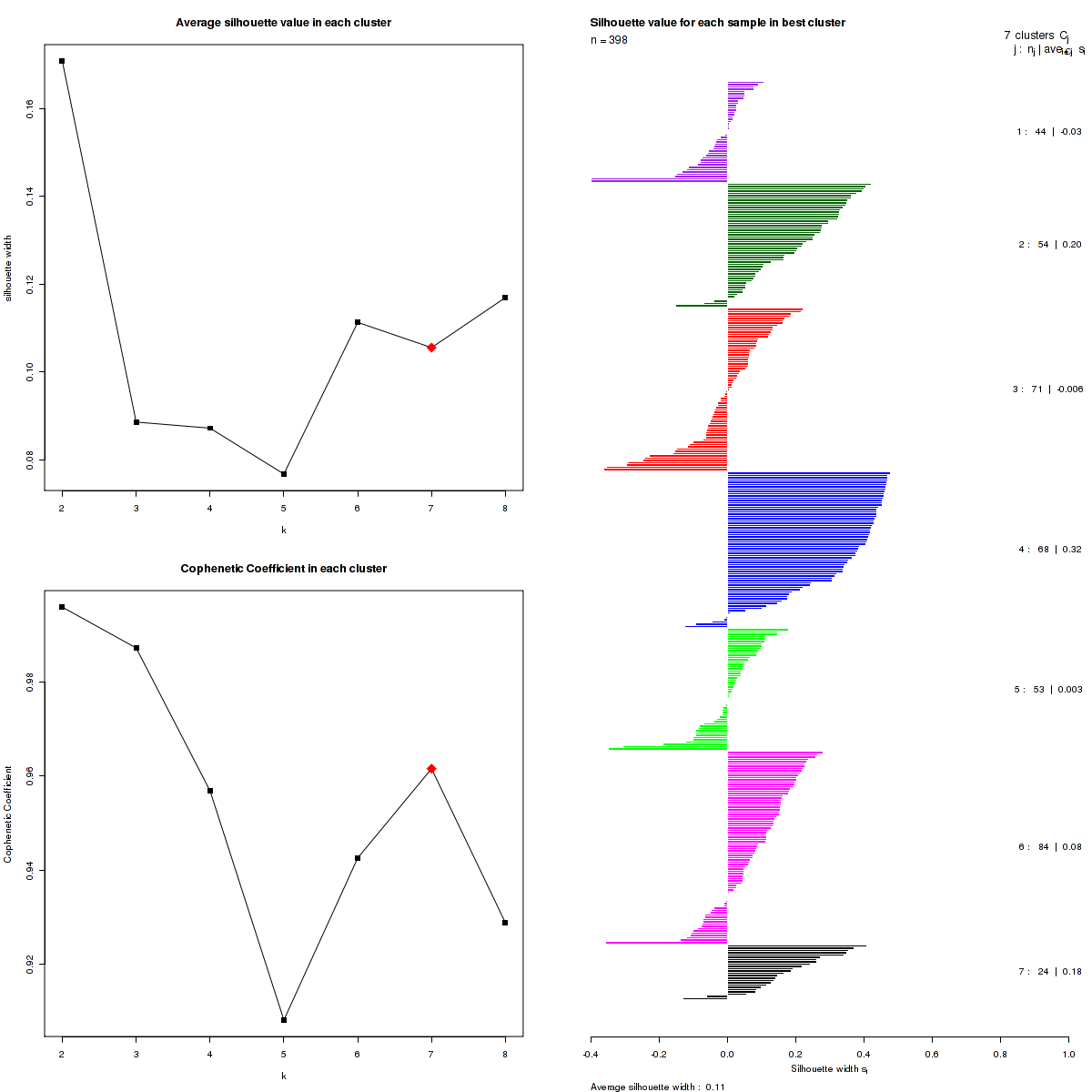Figure 3. Get High-res Image The silhouette width was calculated for each sample and each value of k. The left upper panel shows the average silhouette width across all samples for each tested k (left upper panel). The left lower panel shows the Cophenetic Correlation Coefficients for each tested k. The right panel shows assignments of clusters to samples and the silhouette width of each sample for the most robust clustering.