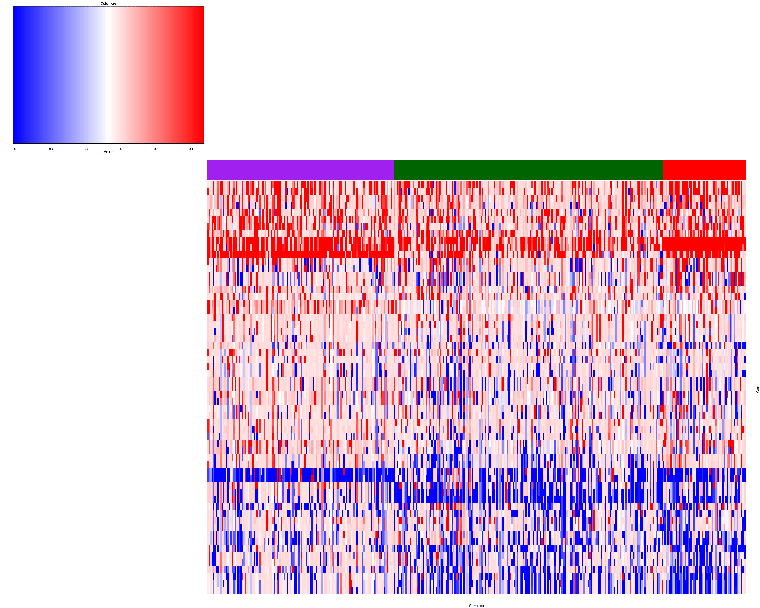 Figure 1. Get High-res Image Samples were separated into 3 clusters. Shown are 372 samples and 55 marker focal events. The color bar of the row indicates the marker focal events for the corresponding cluster.