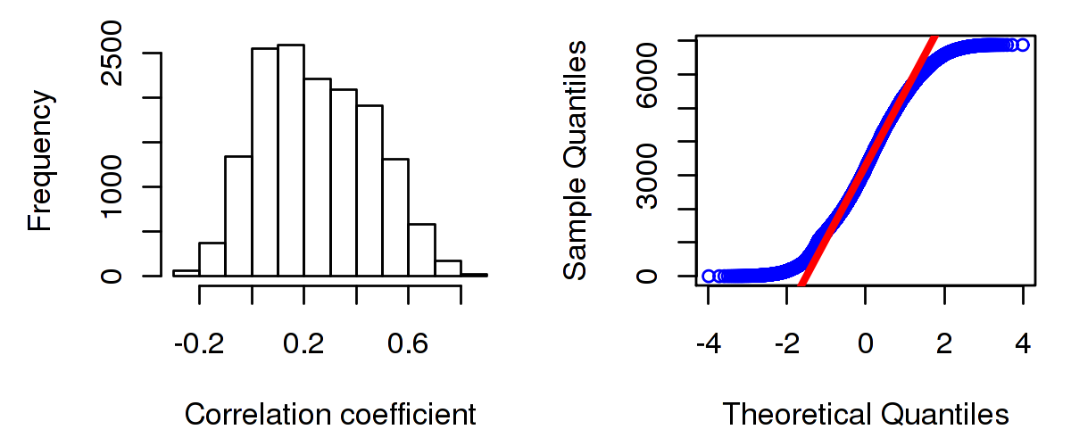 Figure 1. Summary figures. Left: histogram showing the distribution of the calculated correlations across samples for all Genes. Right: QQ plot of the calculated correlations across samples. The QQ plot is used to plot the quantiles of the calculated correlation coefficients against that derived from a normal distribution. Points deviating from the blue line indicate deviation from normality.