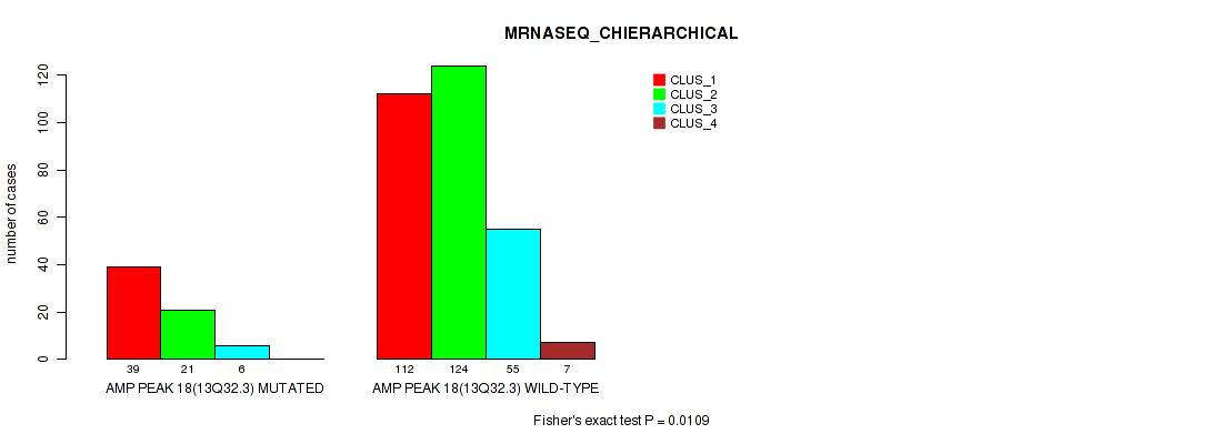 Figure S347. Get High-res Image Gene #54: 'del_18q21.2' versus Molecular Subtype #6: 'MRNASEQ_CHIERARCHICAL'