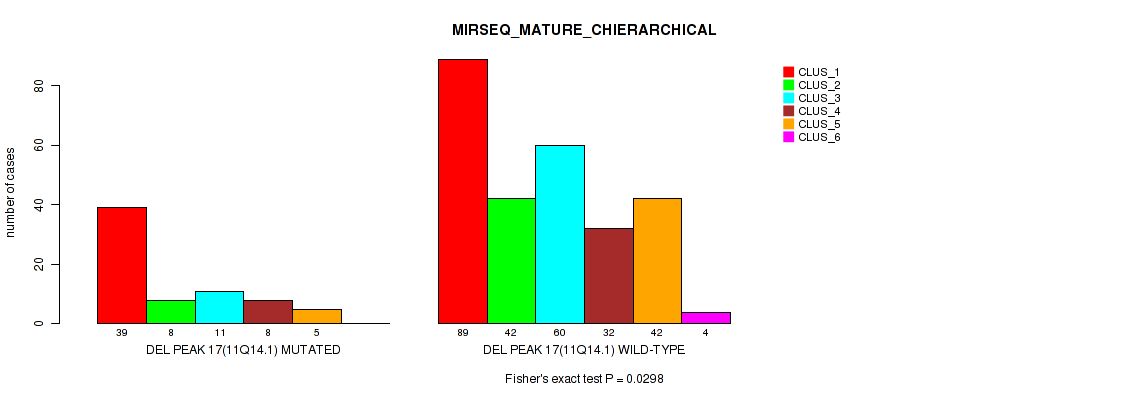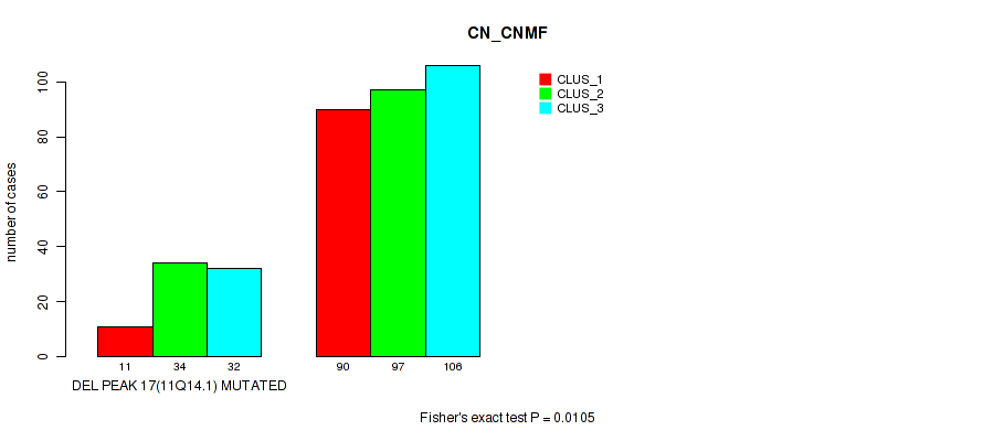 del_11q14.1 cnv correlated to 'CN_CNMF', 'METHLYATION_CNMF', 'MRNASEQ_CNMF', 'MIRSEQ_MATURE_CNMF', and 'MIRSEQ_MATURE_CHIERARCHICAL'.