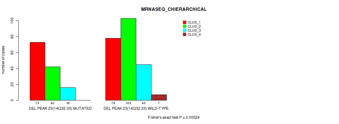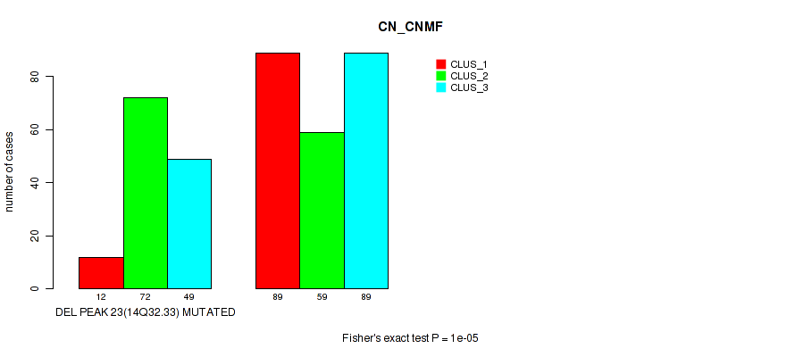 del_14q32.33 cnv correlated to 'CN_CNMF', 'METHLYATION_CNMF', 'RPPA_CNMF', 'MRNASEQ_CNMF', 'MRNASEQ_CHIERARCHICAL', 'MIRSEQ_CNMF', 'MIRSEQ_CHIERARCHICAL', 'MIRSEQ_MATURE_CNMF', and 'MIRSEQ_MATURE_CHIERARCHICAL'.