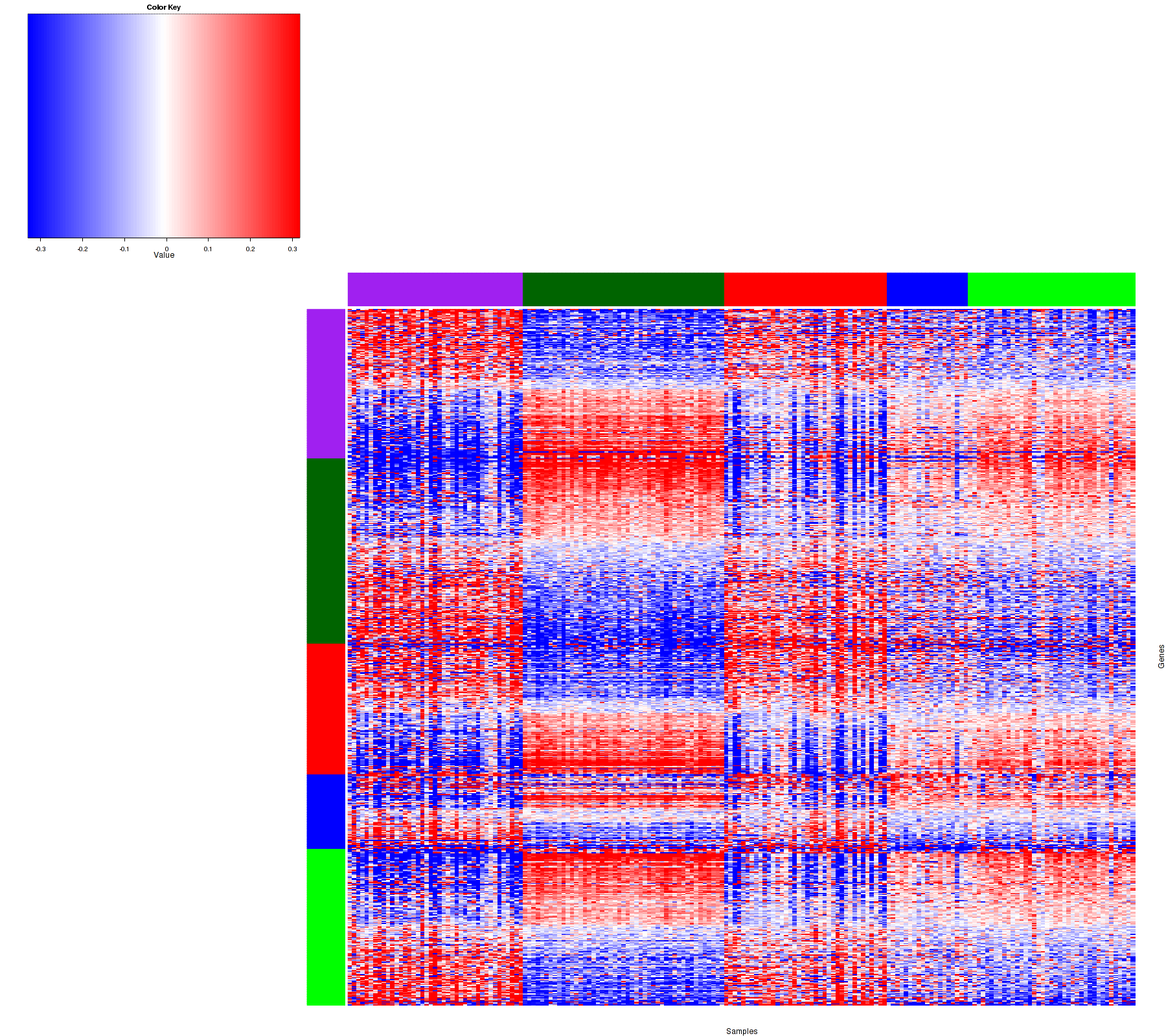Figure 1. Get High-res Image Samples were separated into 5 clusters. Shown are 184 samples and 681 marker proteins. The color bar of the row indicates the marker proteins for the corresponding cluster.