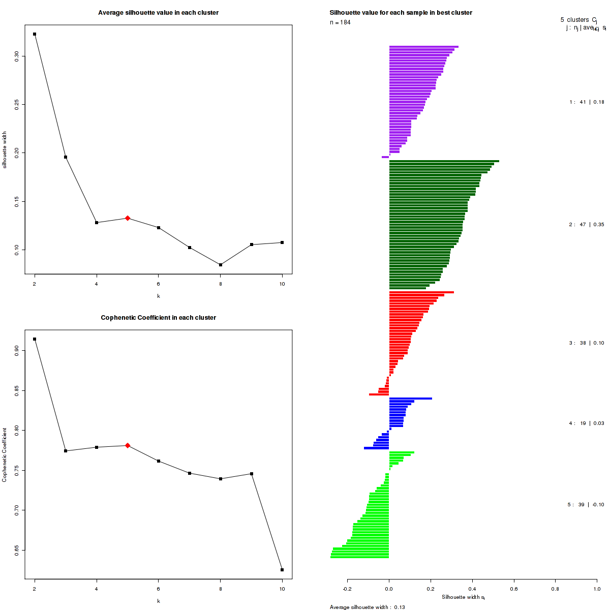 The cophenetic correlation coefficients and average silhouette values are used to determine the k with the most robust clusterings. From the plot of cophenetic correlation versus k, we select modes and the the point preceding the greatest decrease in cophenetic correlation coefficient, and from these choose the k with the highest average silhouette value.
