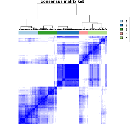Figure 4. Get High-res Image The consensus matrix after clustering shows 5 clusters with limited overlap between clusters.