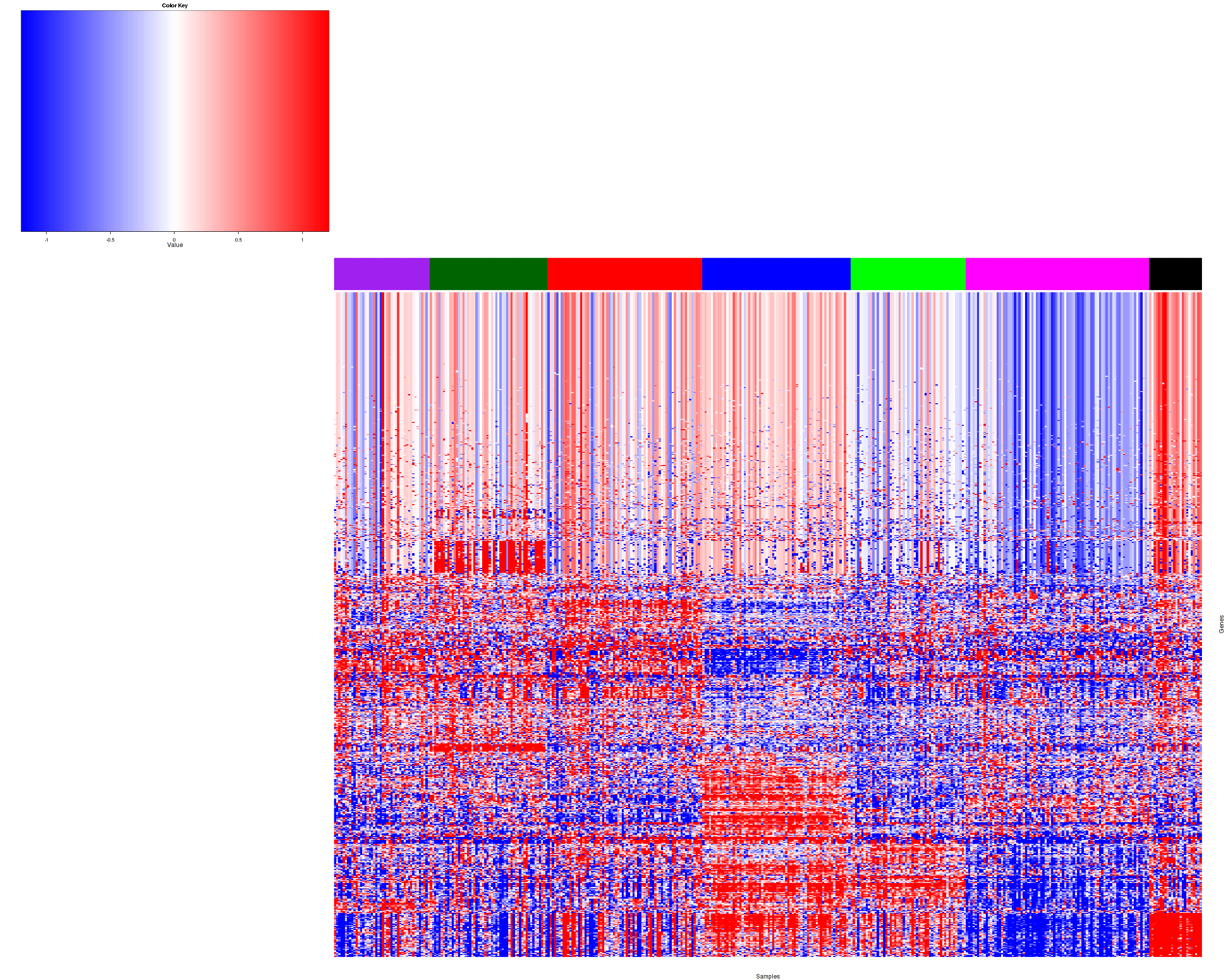 Figure 1. Get High-res Image Samples were separated into 7 clusters. Shown are 398 samples and 2038 marker miRs. The color bar of the row indicates the marker miRs for the corresponding cluster.