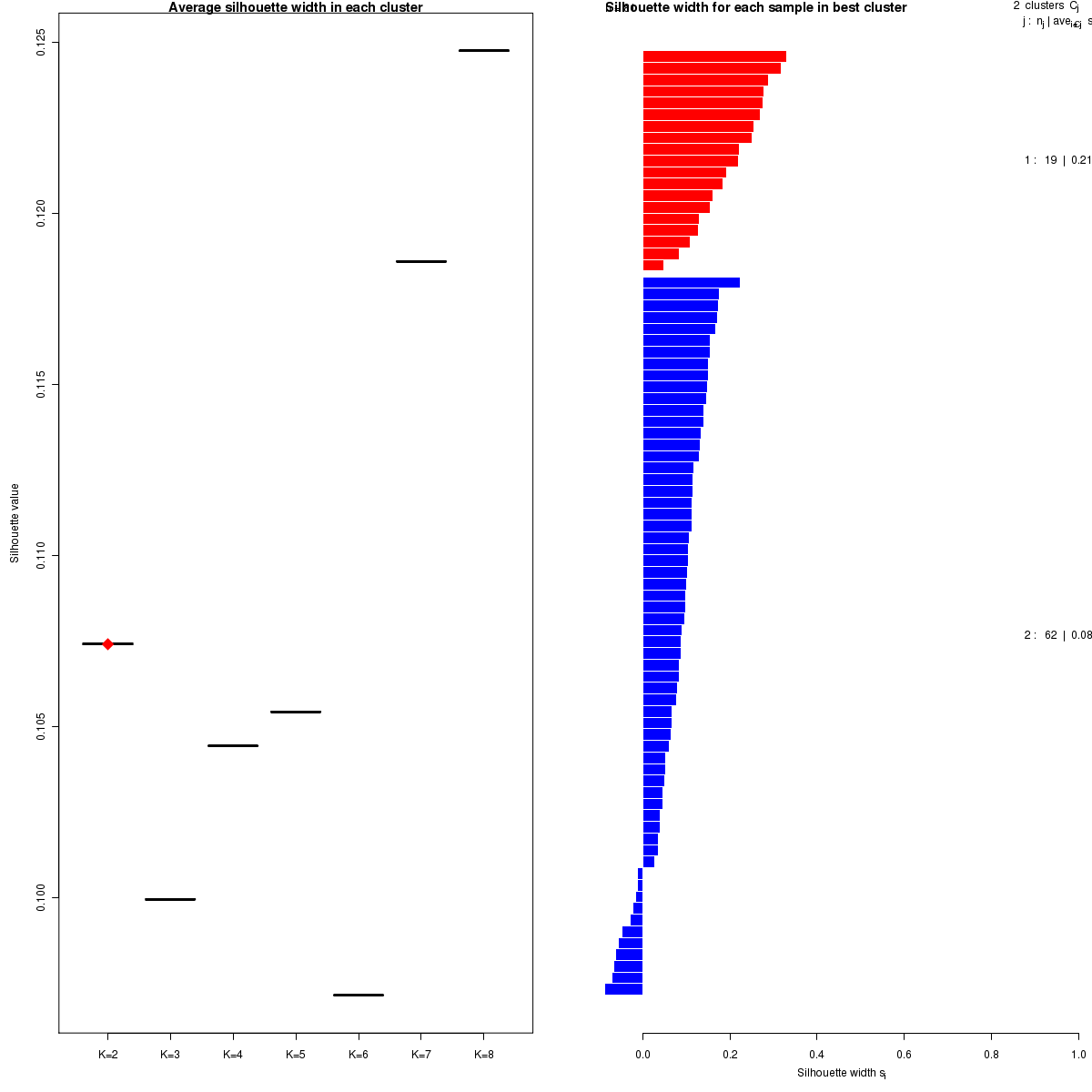 The 1500 most variable genes were selected. Consensus average linkage hierarchical clustering of 81 samples and 1500 genes identified 2 subtypes with the stability of the clustering increasing for k = 2 to k = 8 and the average silhouette width calculation for selecting the robust clusters.