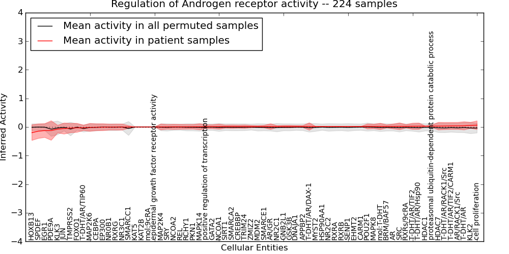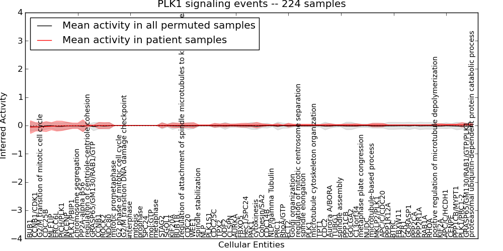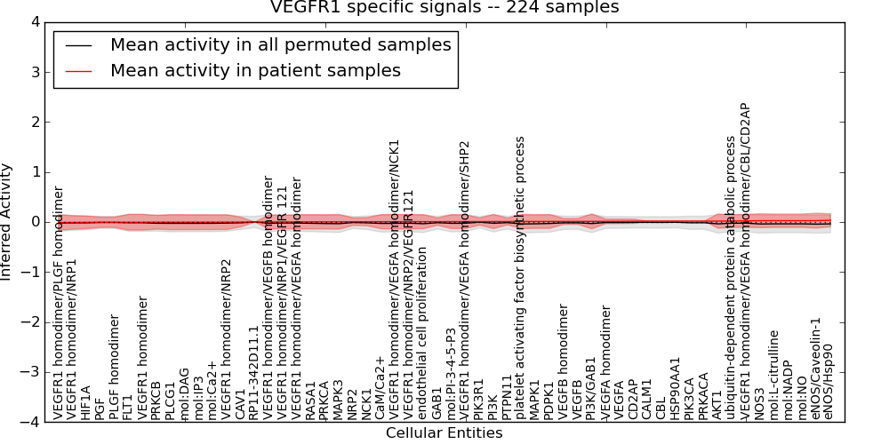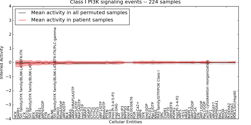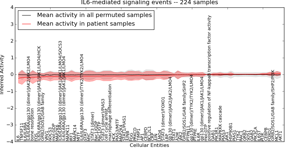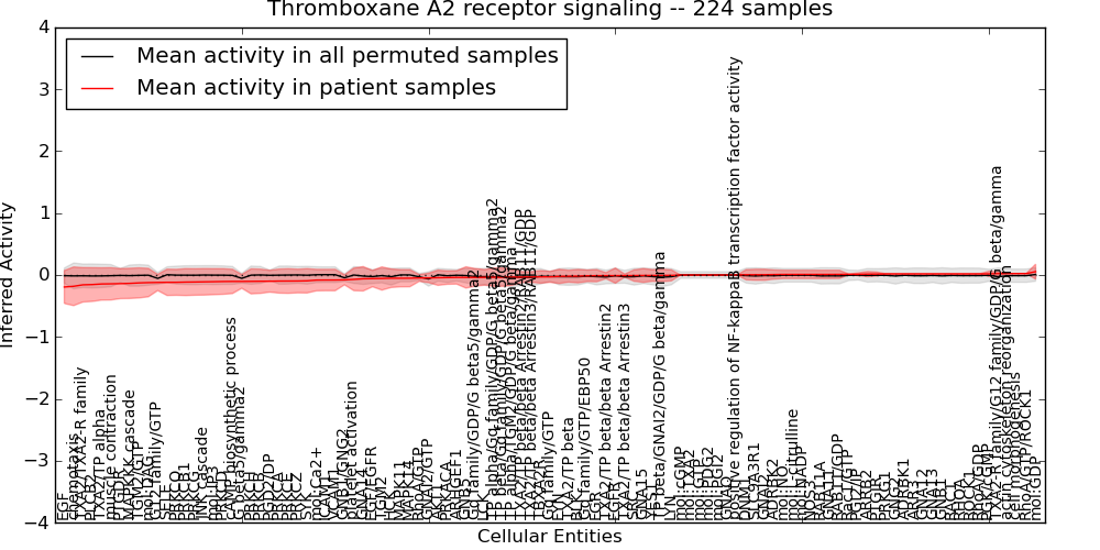 Figure S131. Get High-res Image This plot shows pathway concept perturbations across all samples against a permutation model. The concepts along the x-axis are sorted by lowest to highest mean activity for the real patient samples. Mean inferred activities are plotted along the y-axis as a colored band showing the average level and one standard deviation range. Real samples are shown in red and permuted samples in black.