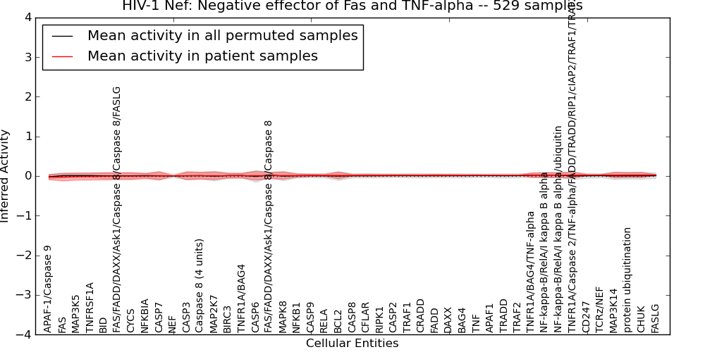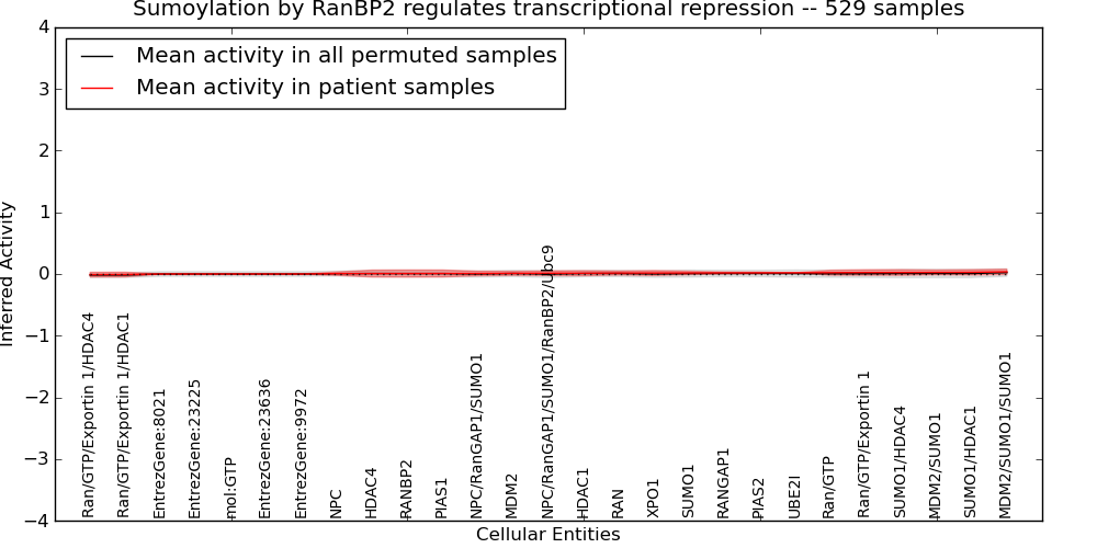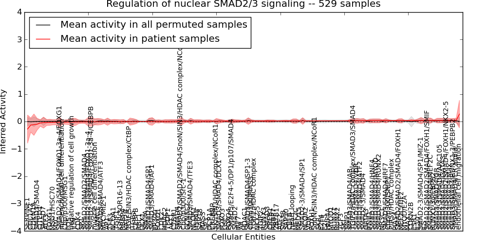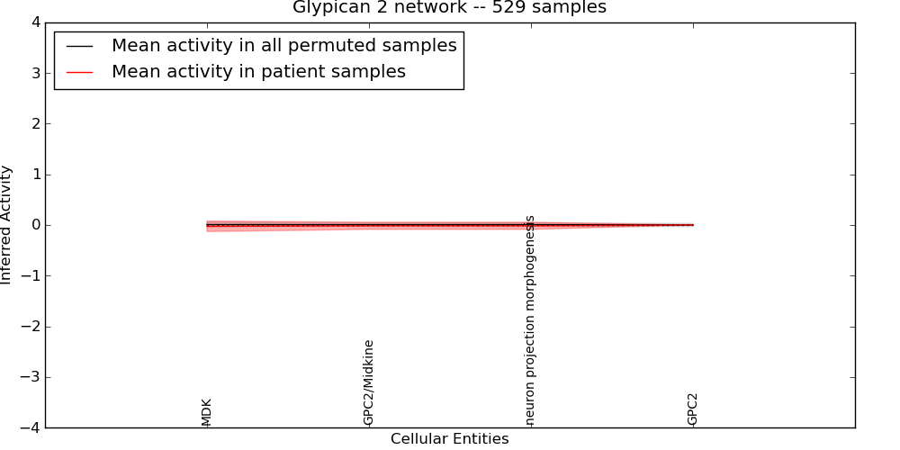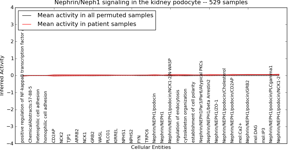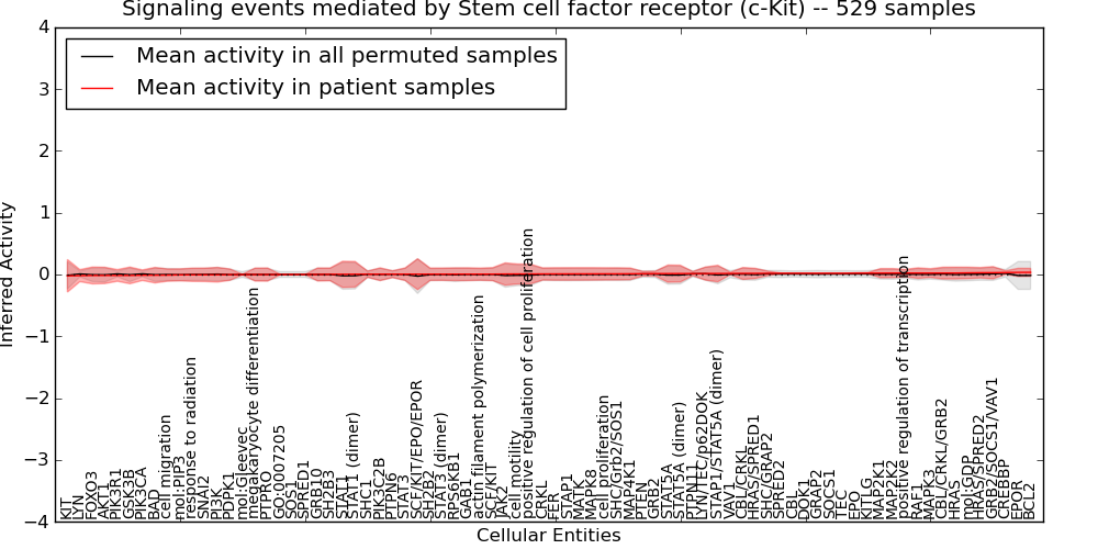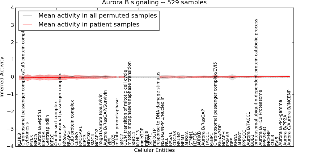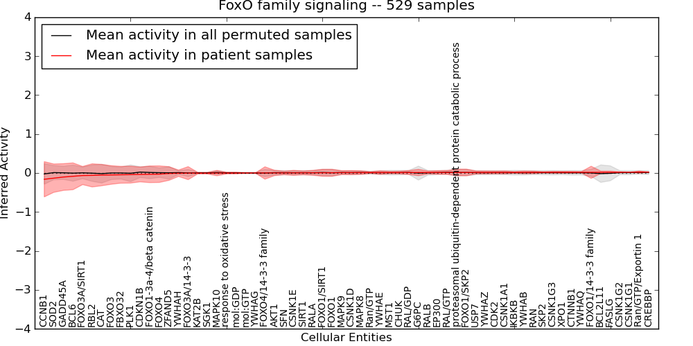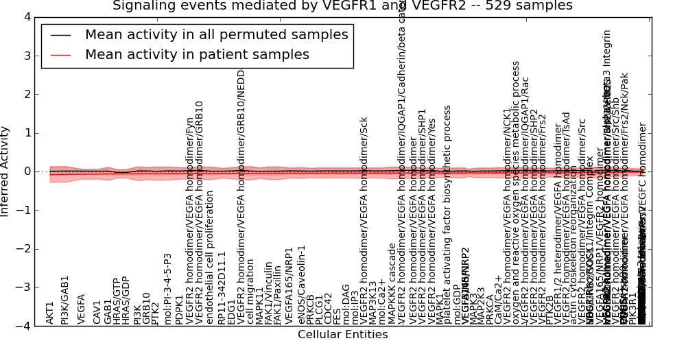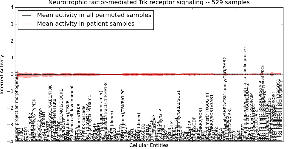 Figure S131.  Get High-res Image This plot shows pathway concept perturbations across all samples against a permutation model. The concepts along the x-axis are sorted by lowest to highest mean activity for the real patient samples. Mean inferred activities are plotted along the y-axis as a colored band showing the average level and one standard deviation range. Real samples are shown in red and permuted samples in black.