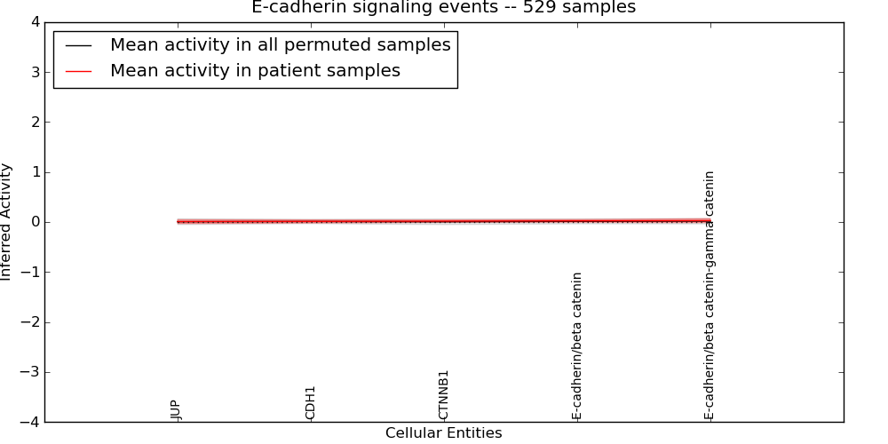 The significance of the IPL obtained for each concept in each patient sample is assessed using a permutation analysis. Importantly, the permutation analysis preserves data tuples so as to preserve any implicit correlations between the different data modalities. For example, genes that are deleted have concomitantly lower expression levels. Preserving the copy number and expression pairs therefore retains this data property. The simulation therefore makes "null samples" by permuting data tuples across all of the genes in the genome so that each gene in a null sample is associated with a random tuple of another gene with equal probability. This approach has the added benefit of preserving the pathway structure so that every observed IPL can be compared to a distribution of random IPLs derived from exactly the same interaction context. PARADIGM inferences are then obtained for 1000 "null" patients and serve as a background distribution to contrast the observed IPLs against. Pathway concepts are excluded from further analysis if they did not obtain a minimum IPL of 0.5 in any patient sample both observed or simulated.