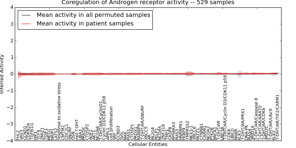 Figure S128.  Get High-res Image This plot shows pathway concept perturbations across all samples against a permutation model. The concepts along the x-axis are sorted by lowest to highest mean activity for the real patient samples. Mean inferred activities are plotted along the y-axis as a colored band showing the average level and one standard deviation range. Real samples are shown in red and permuted samples in black.